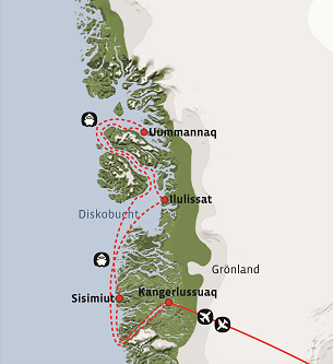 Die grösste Insel unserer Erde haben wir uns als Reiseziel ausgesucht. Die Kontiki-Traumreise führt an die Westküste von Grönland. Unsere Erwartungen sind unterschiedlich, das Eis wollen wir sehen, gewaltige Eisberge, Wanderungen in einzigartiger Natur unternehmen, das Leben der Inuit kennen lernen, abschalten vom Alltag… Über Kopenhagen erreichen wir nach Mitternacht Schweizer Zeit das immer noch taghelle Kangerlussuaq. Vom Flughafen aus fahren wir mit in die Jahre gekommenen Schulbussen und umfunktionierten Lastwagen die zwölf Kilometer zur kleinen Pier. Und von hier bringen uns die Polarcircle/Boote in rasanter Fahrt zu unserem Zuhause für die kommenden Tage. Auf ruhigem Gewässer fahren wir durch den Kangerlussuaq Fjord unserem Abenteuer entgegen.