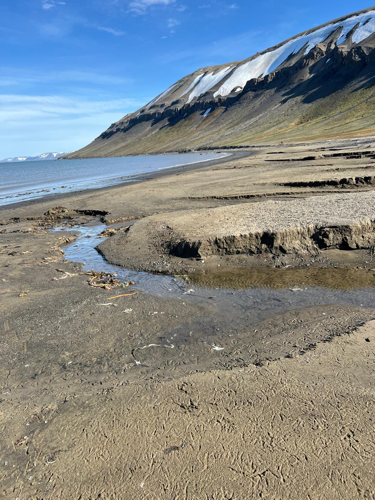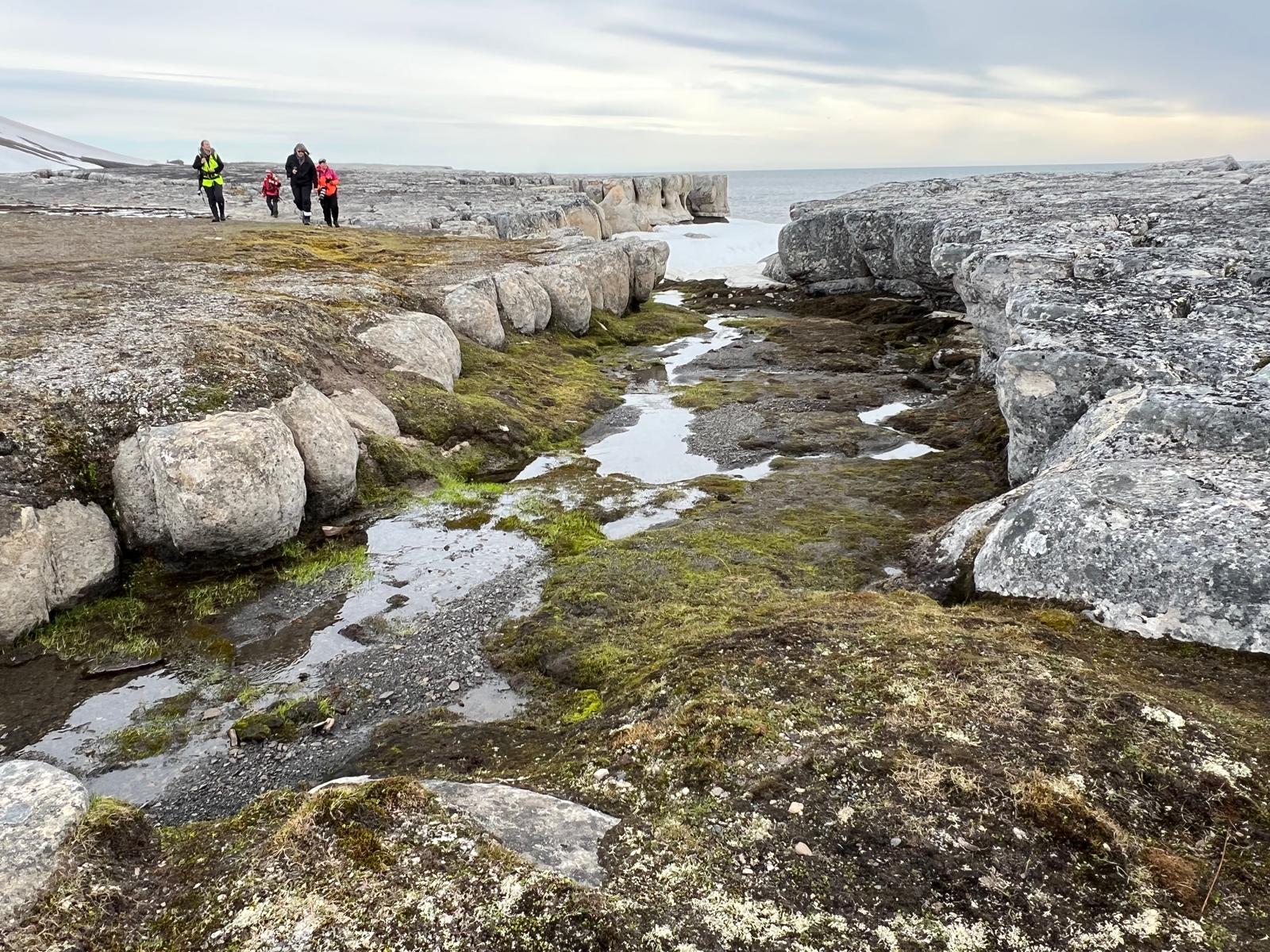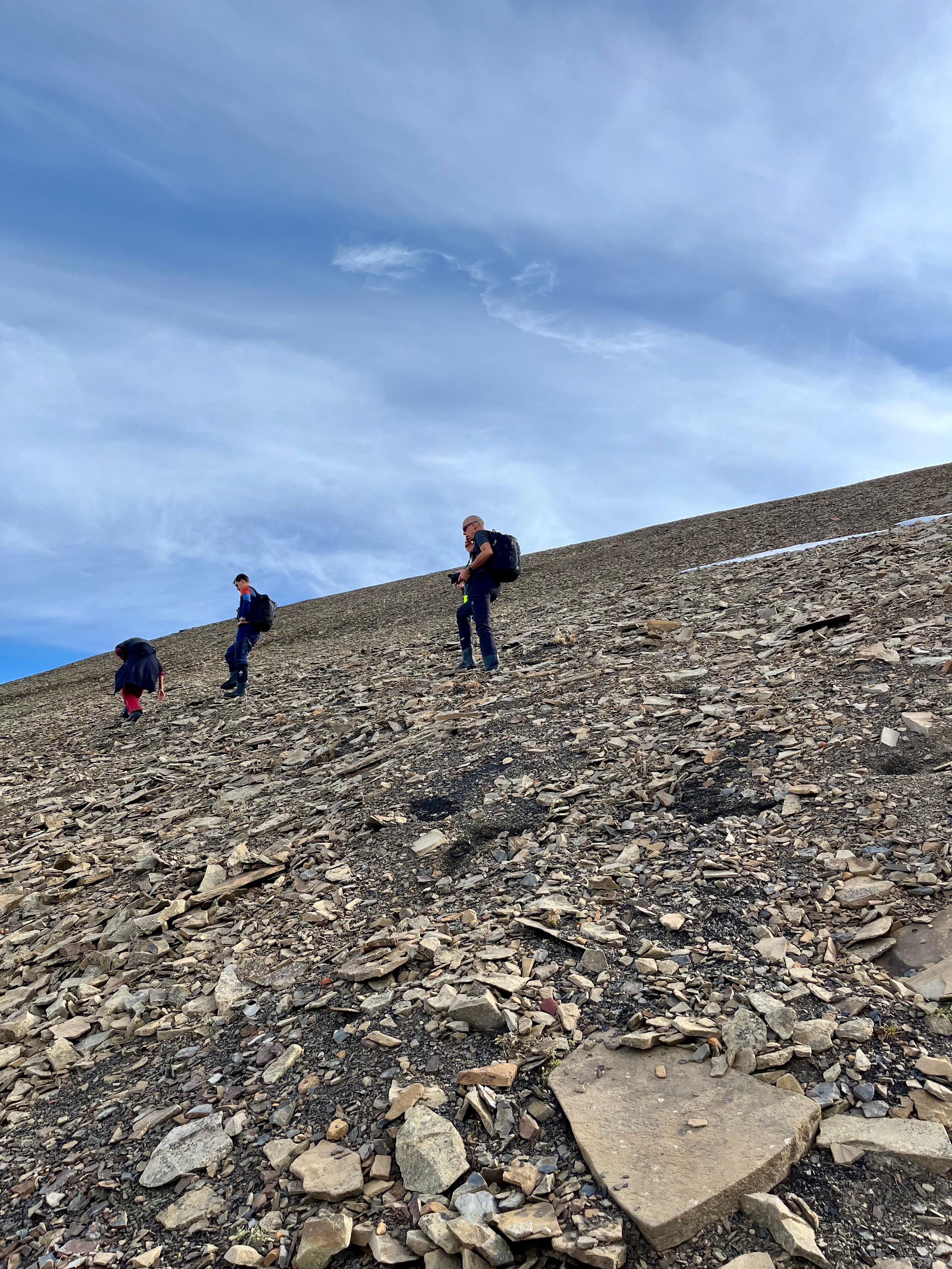 Die kurze Nacht war schnell vergessen – nach einem stärkenden Frühstück ging es mit den Zodiacs an Land, wo das nächste Abenteuer auf uns wartete. Von dort aus wurden wieder zwei Wanderungen und ein gemütlicher Spaziergang angeboten. Die Landschaft war komplett anders als die vorherigen Tage und man fühlte sich, als wäre man auf einem anderen Planeten. Wir wanderten durch eine Steinwüste und konnten Fossilien, Kristalle und durch Permafrost entstandene Muster am Boden entdecken. Zwischendurch überquerten wir einen Bach oder ein Schneefeld.