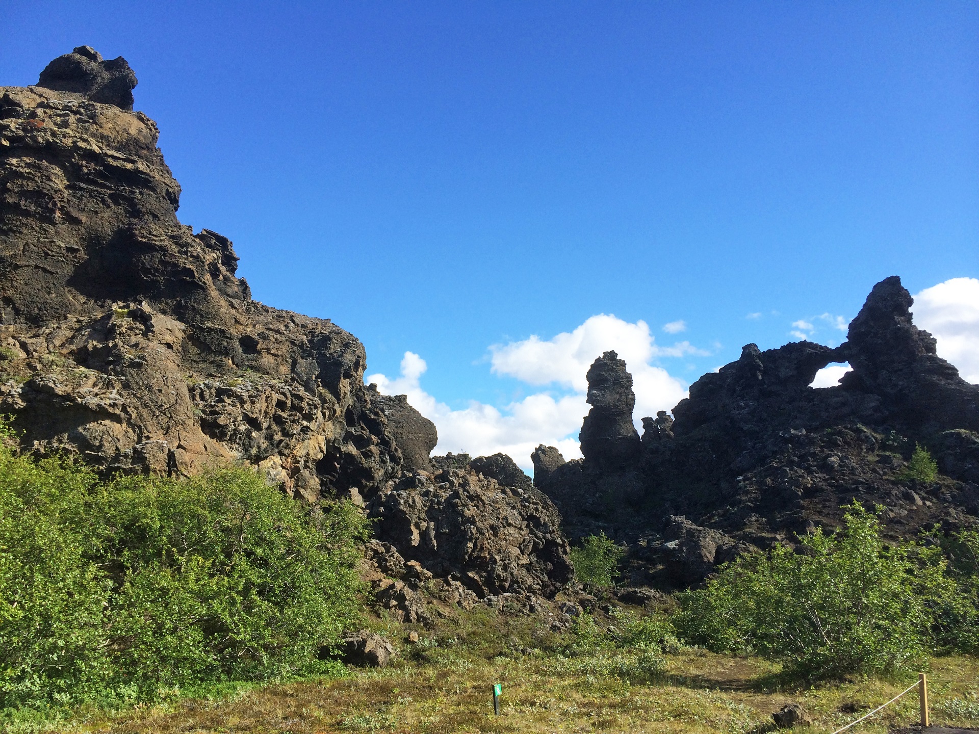 Ich nehme die Frage und mein frisch erworbenes Elfendiplom und fliege in den Norden, nach Akureyri. Unter mir breitet sich ein gigantisches Naturwunder aus: zuerst das Meer, die Lavafelder, dunkle Berge; dann kleine Seen in Kratern, dampfende Quellen, Hügel, Wasserfälle; schliesslich Schnee, Schneeberge, Gletscher. Auf der Passfahrt Richtung Mývatn-Gebiet wähne ich mich im Engadin, so bezaubernd ist das Licht. Hoch und höher hinauf windet sich die Ringstrasse, bevor sie wieder ins Tal führt, rechts stürzt der Godafoss mit seinen riesigen Wassermengen in die Tiefen und schliesslich bin ich in Laugar. Das beschauliche Örtchen liegt eingebettet zwischen zwei Hügeln auf dem Weg zum Mývatn-Gebiet. Im Gästehaus North Aurora treffe ich Bryndis Pétrusdóttir. Zusammen mit vier weiteren Gästen steigen wir den Hügel hoch zum nahen Elfenstein.