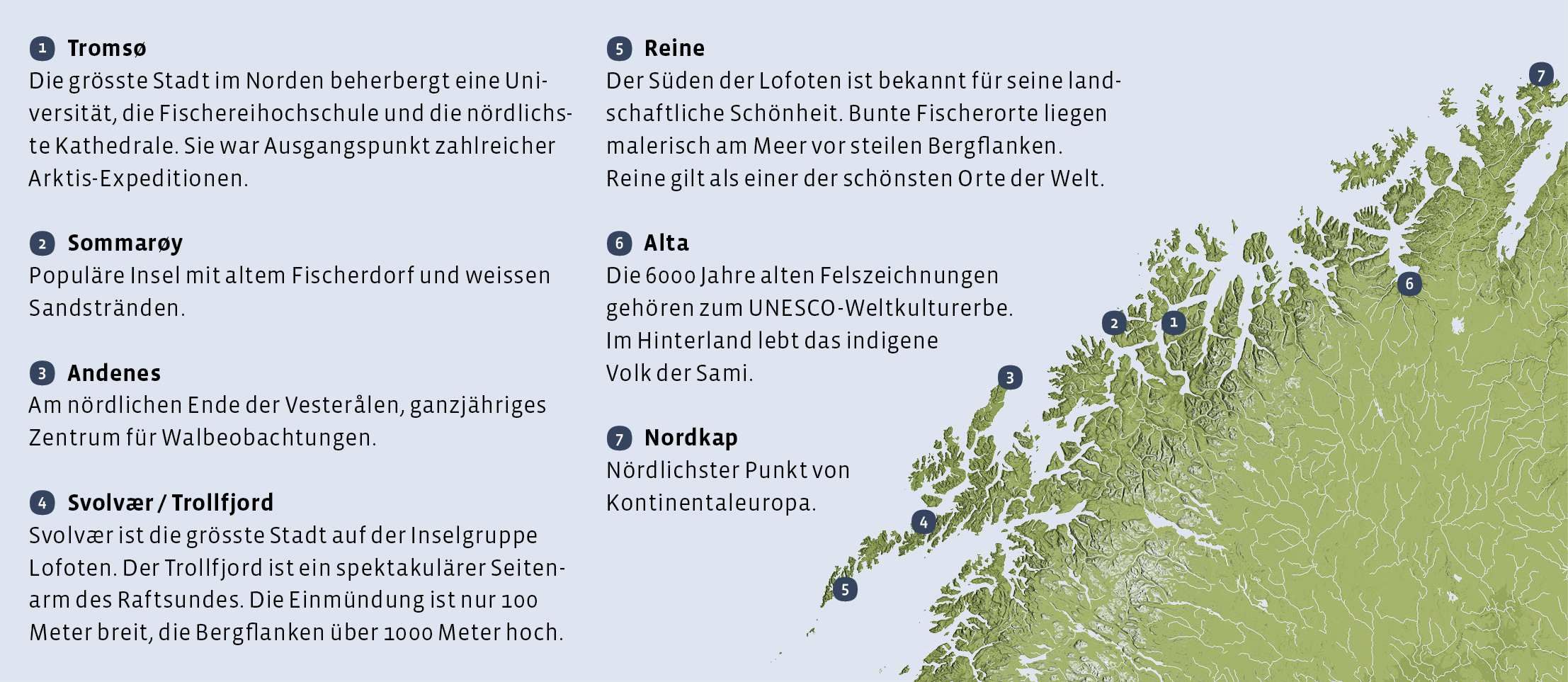 Der nördlichste Punkt von Kontinentaleuropa ist Sehnsuchtsort so mancher Reisenden. Das Nordkap liegt auf der Insel Magerøya, über 500 Kilometer nördlich des Polarkreises. Auf dem Weg zum 2100 Kilometer entfernten Nordpol befindet sich nur noch die Inselgruppe Spitzbergen.