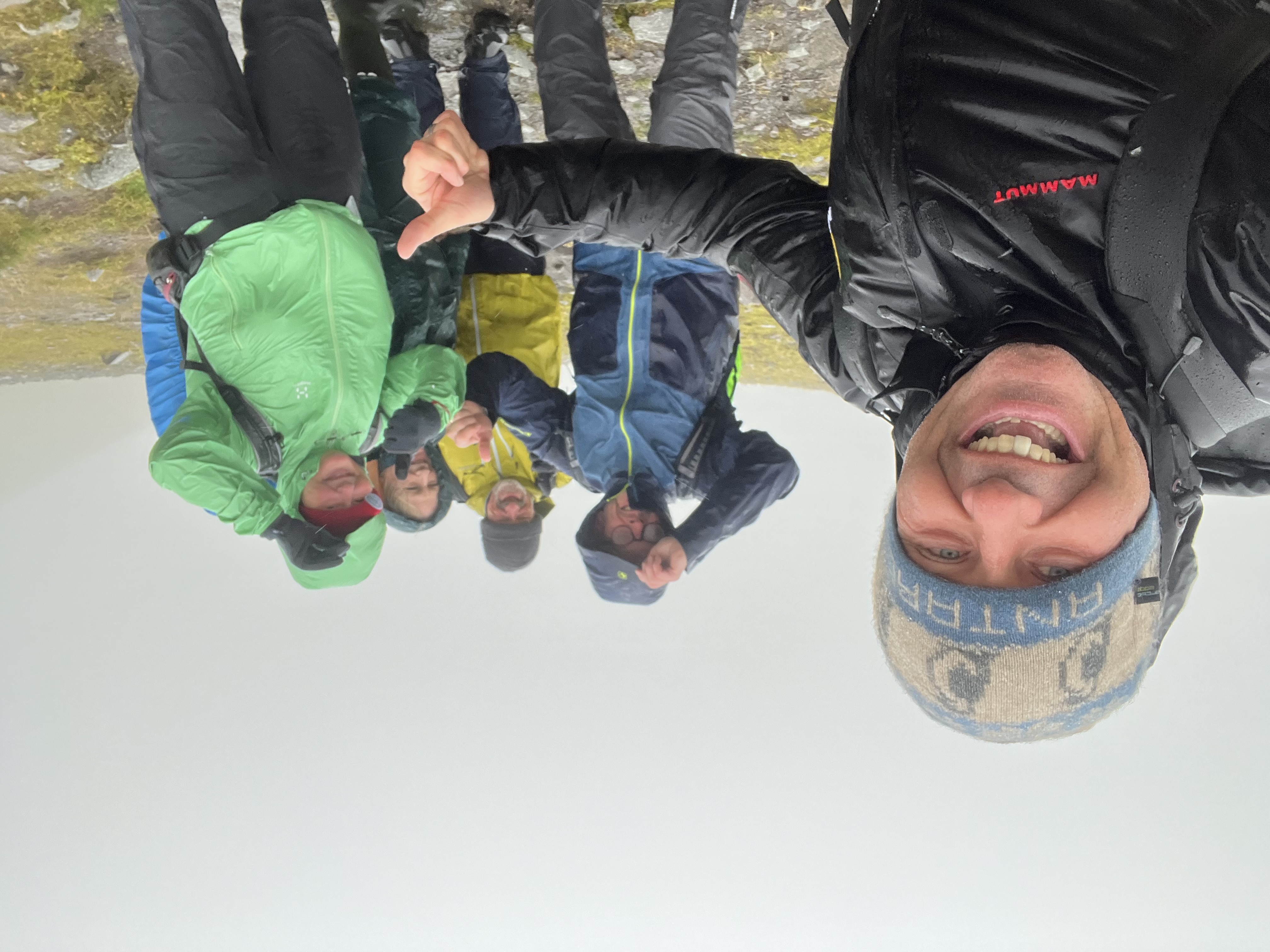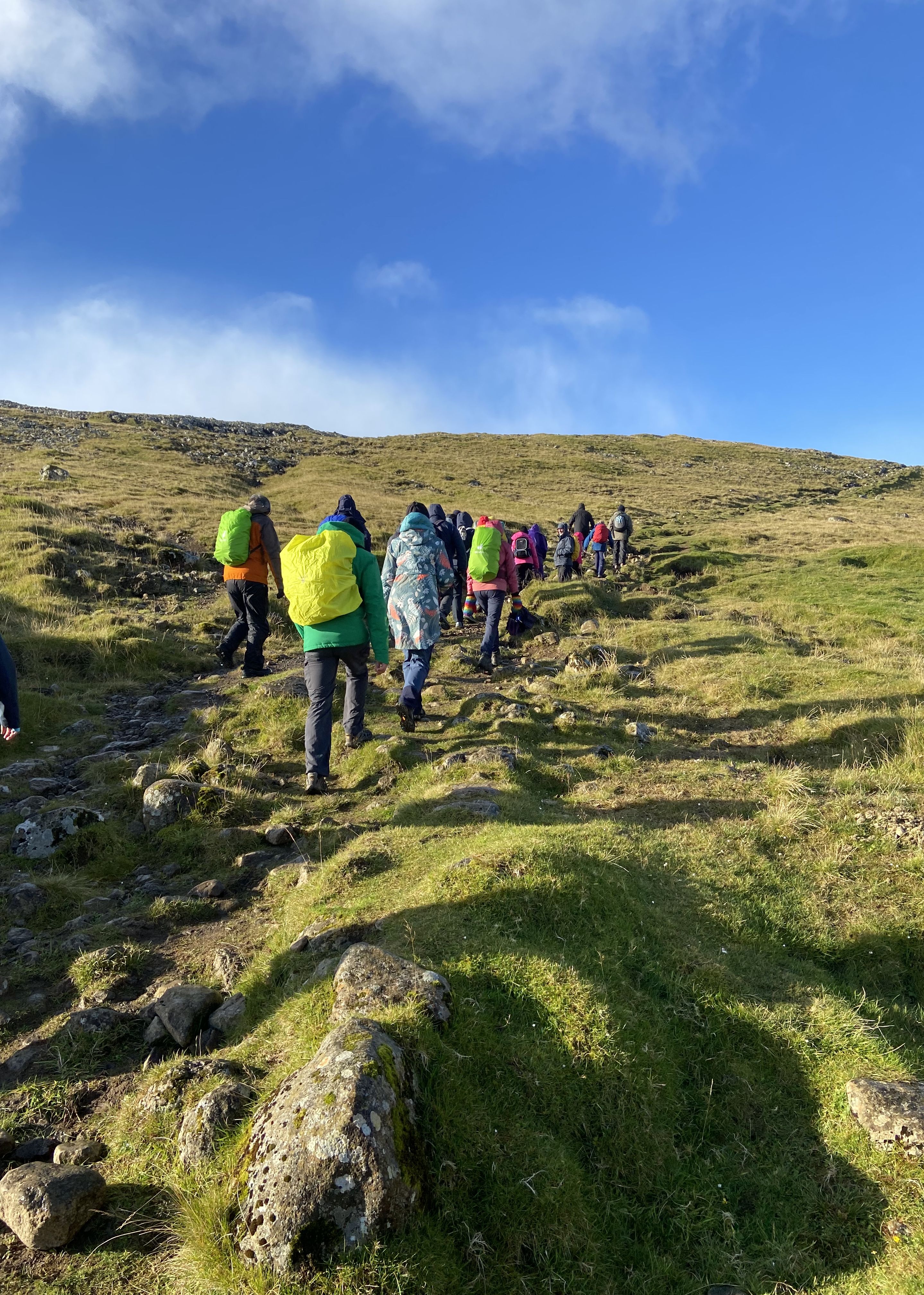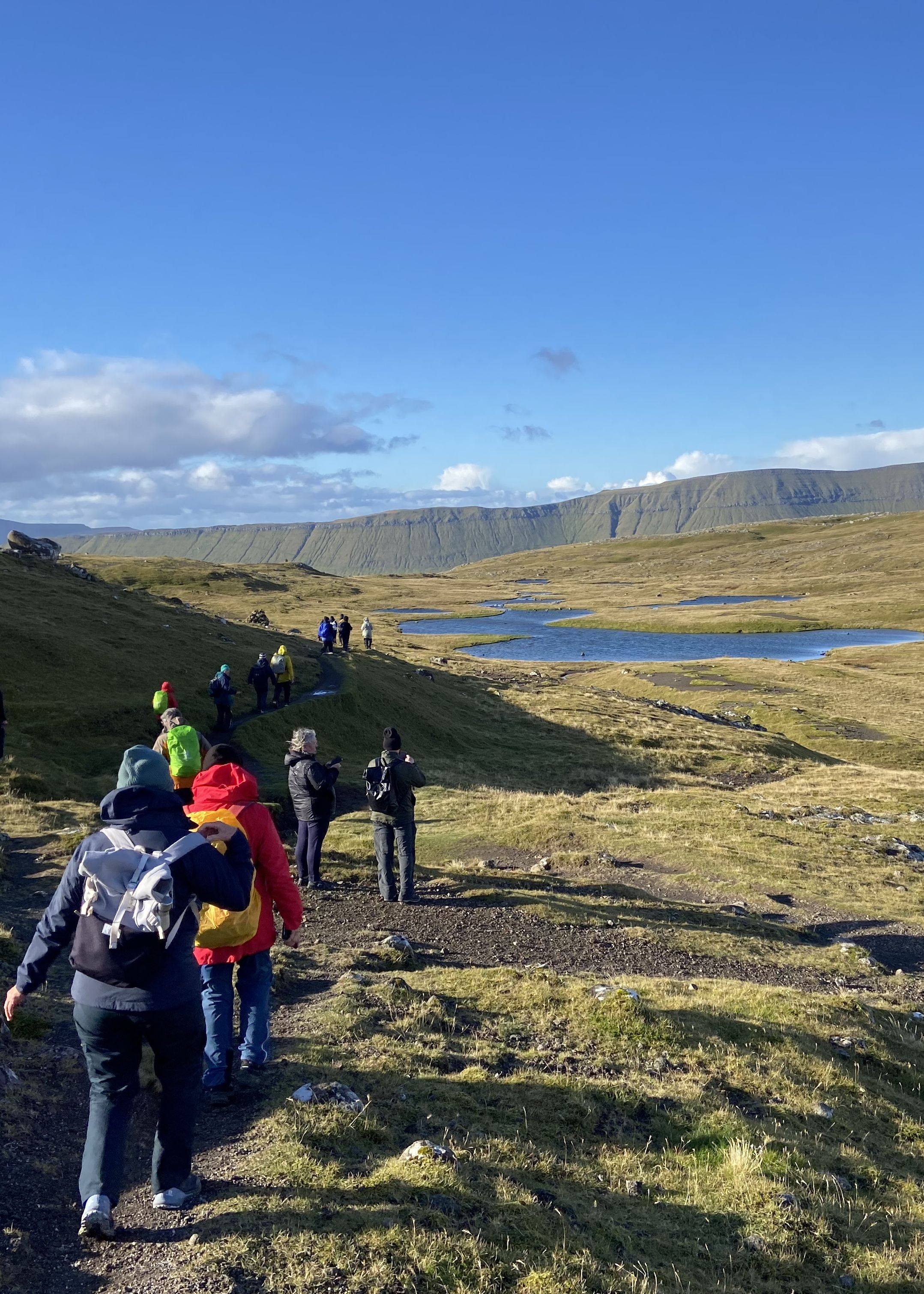 Le deuxième groupe gravit le mont Eggjyvagur et, là-haut, fait la belle rencontre d'un homme âgé local. Il est très heureux de la visite et parle avec enthousiasme aux nouveaux arrivants suisses qui ne comprennent malheureusement presque rien. Sur le chemin du retour, le groupe fait une halte dans une mini-brasserie où est servi une Biskupselda, qui ne ressemble guère à une bière, mais qui en est une.