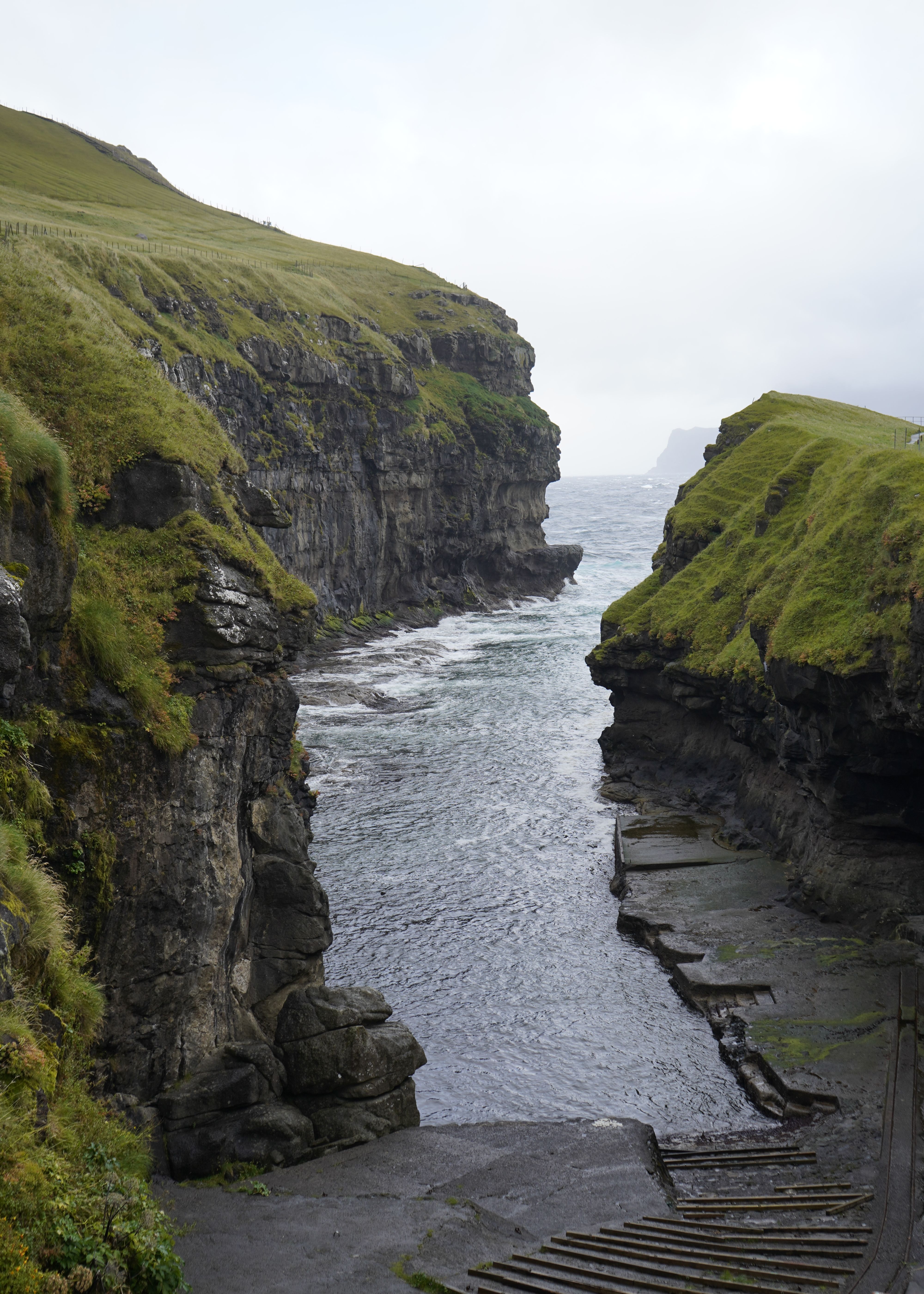 Un groupe voyage en bus le long de la mer jusqu’à Eysturoyartunnilin, qui relie trois îles – le seul carrefour sous-marin au monde. Le voyage se poursuit jusqu’au village le plus septentrional des îles Féroé, Gjogv (« gorge »), situé à l’extrémité d’une vallée au large. La promenade mène à travers ce lieu aux infrastructures développées. Mais surtout, le sentier sur une colline vaut la peine d’observer les vagues de l’Atlantique Nord, dont la puissance est époustouflante.