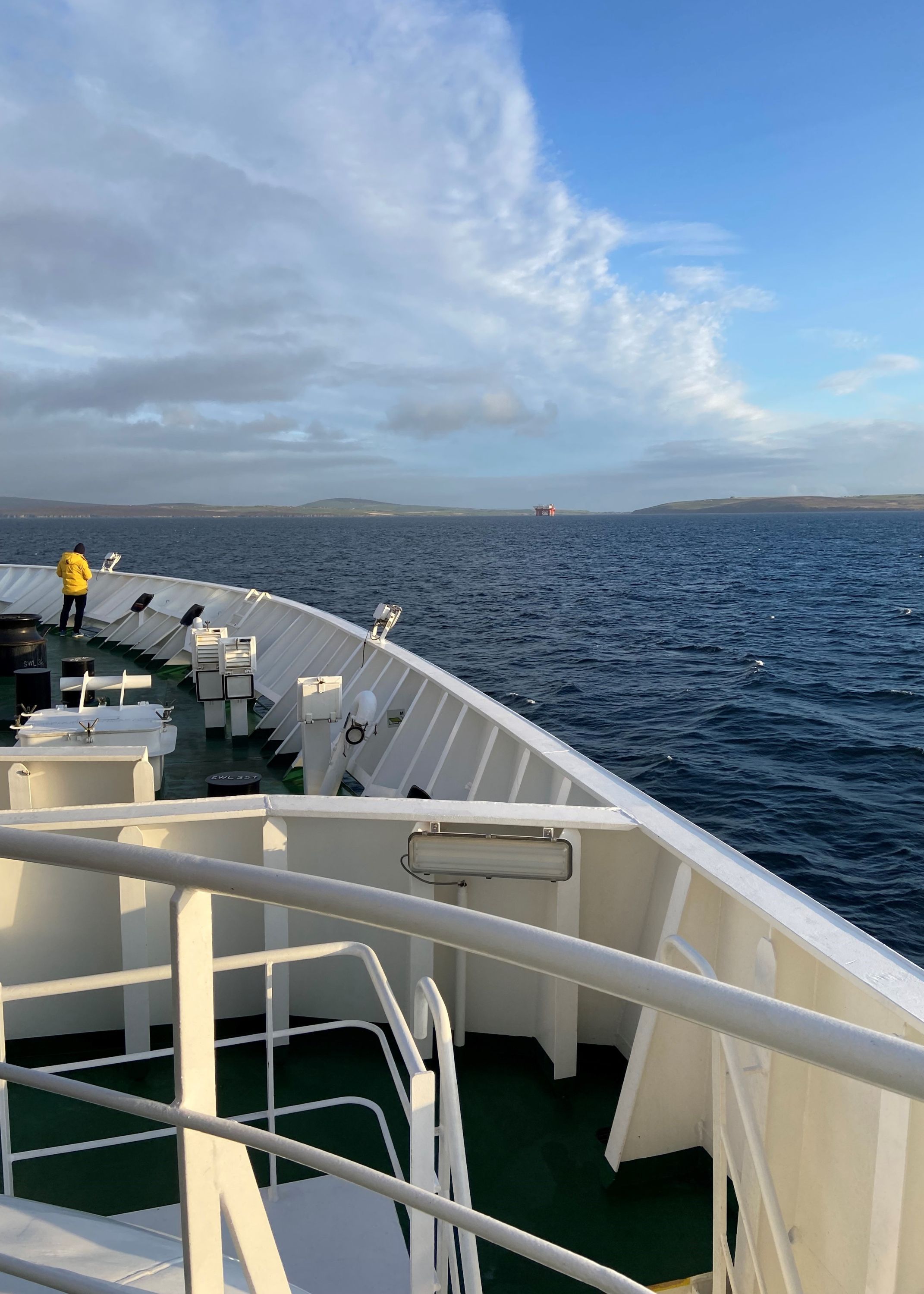 L'après-midi, le bateau prend la mer et se dirige vers le sud-est en direction des îles Shetland. Rolf présente un bref résumé de l'histoire écossaise. Dans un deuxième exposé, Meike nous parle des fulmars, considérés comme des indicateurs de la pollution des mers. L'étude de leurs cadavres permet de prouver la présence de résidus dans l'eau : plastique, polystyrène, plastique industriel. Après le dîner, un documentaire met en discussion la chasse à la baleine. Les traditionalistes la défendent comme faisant partie de leur patrimoine culturel, les plus jeunes militants écologistes la considèrent comme une cruauté envers les animaux.