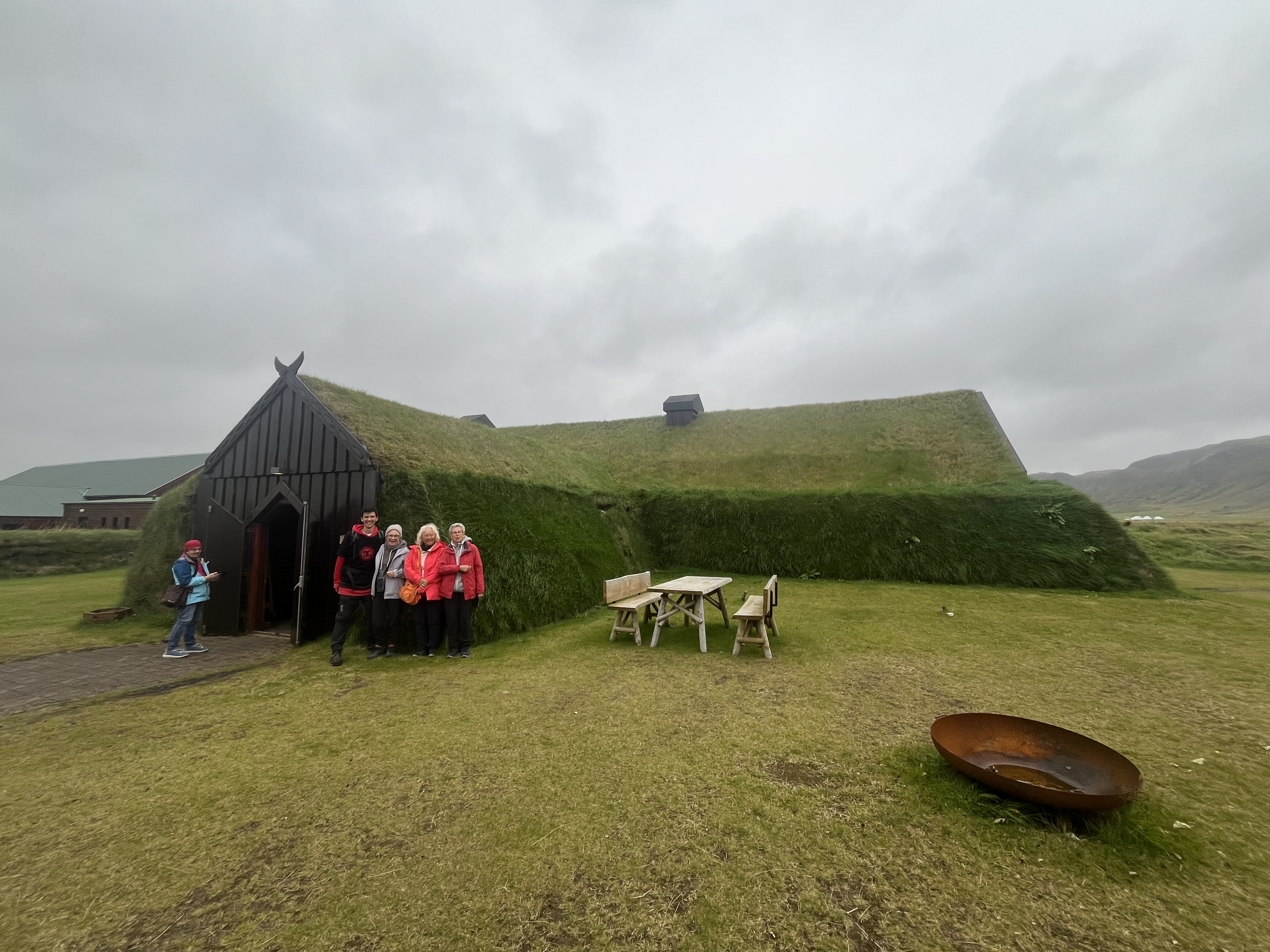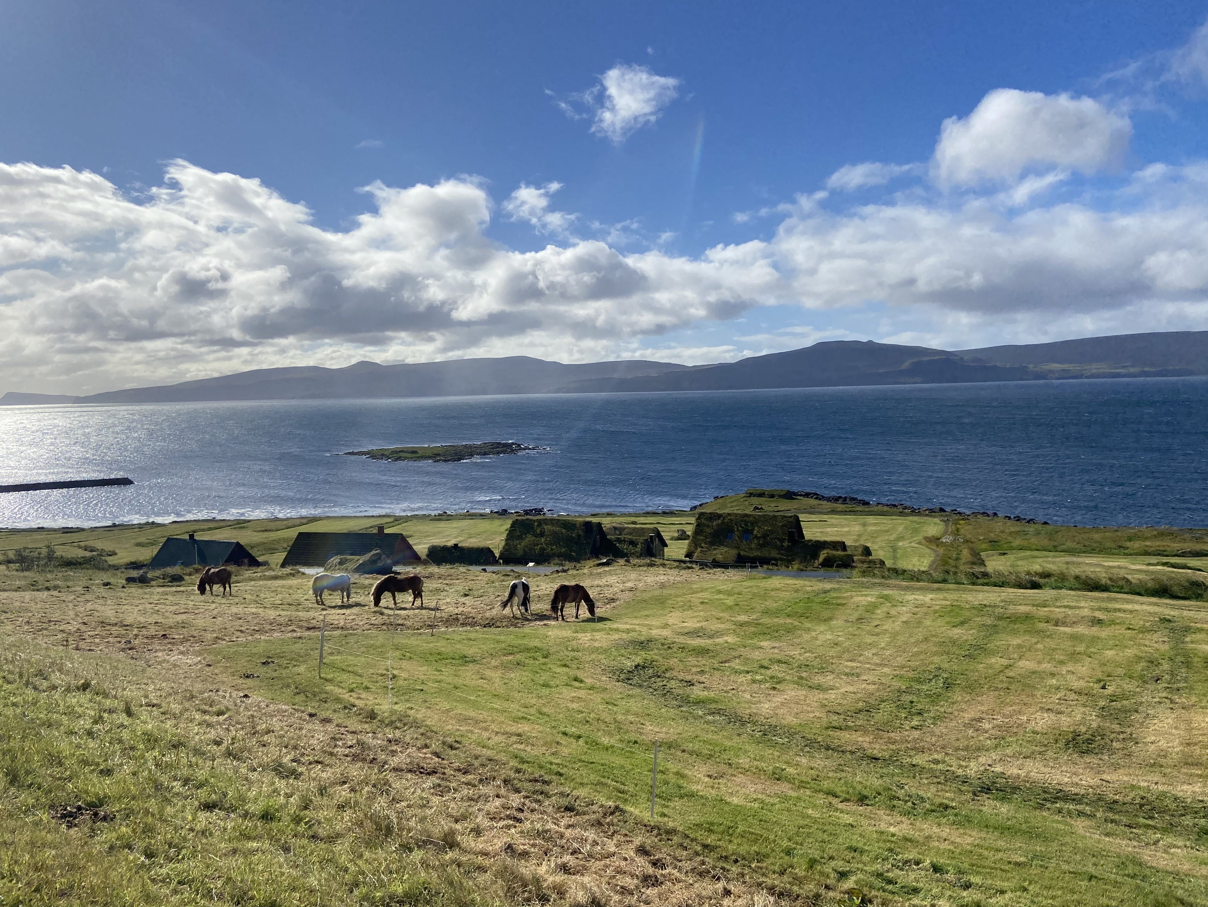 À midi, nous nous arrêtons à Hvammstangi, où nous dégustons un délicieux repas sous le soleil et admirons les maisons colorées. Nous continuons vers l'ancienne ferme de Glaumbær, où nous voyons de près comment les familles de paysans vivaient autrefois dans des maisons faites de plaques de tourbe.