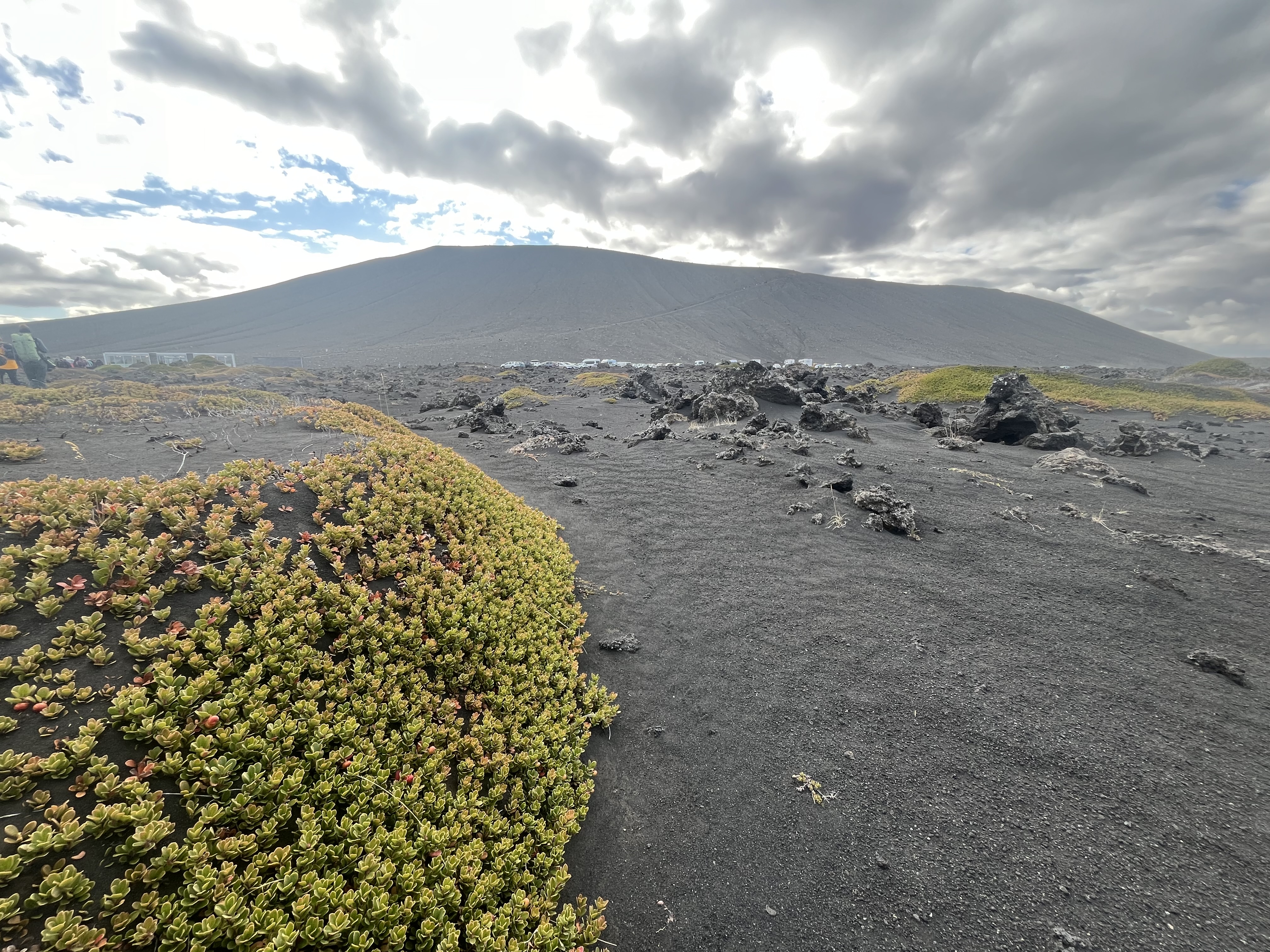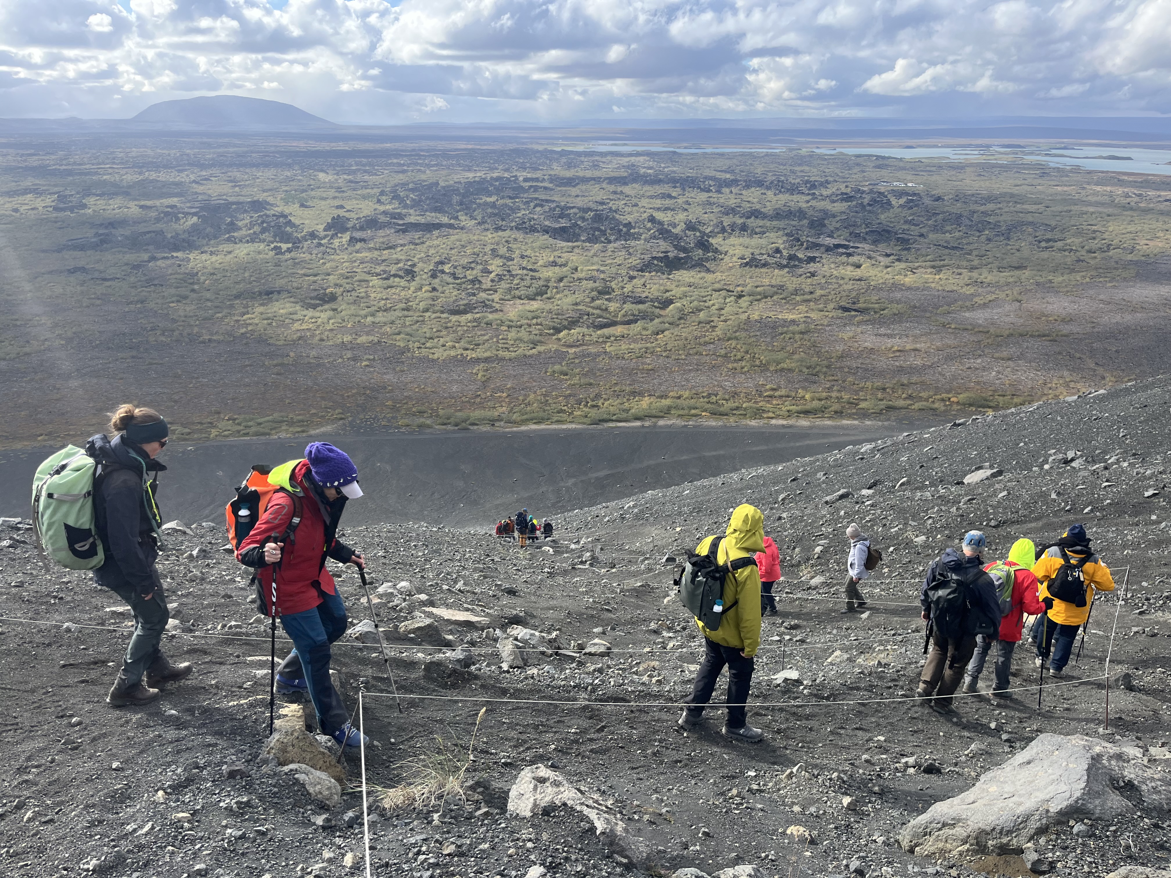 La belle journée de fin d'été dans le nord de l'Islande incite les plus ambitieux à faire une randonnée sur le cratère éteint Hverfjall. On peut aisément faire le demi-tour du cratère car le chemin est bien tracé sur des pierrres poreuses.