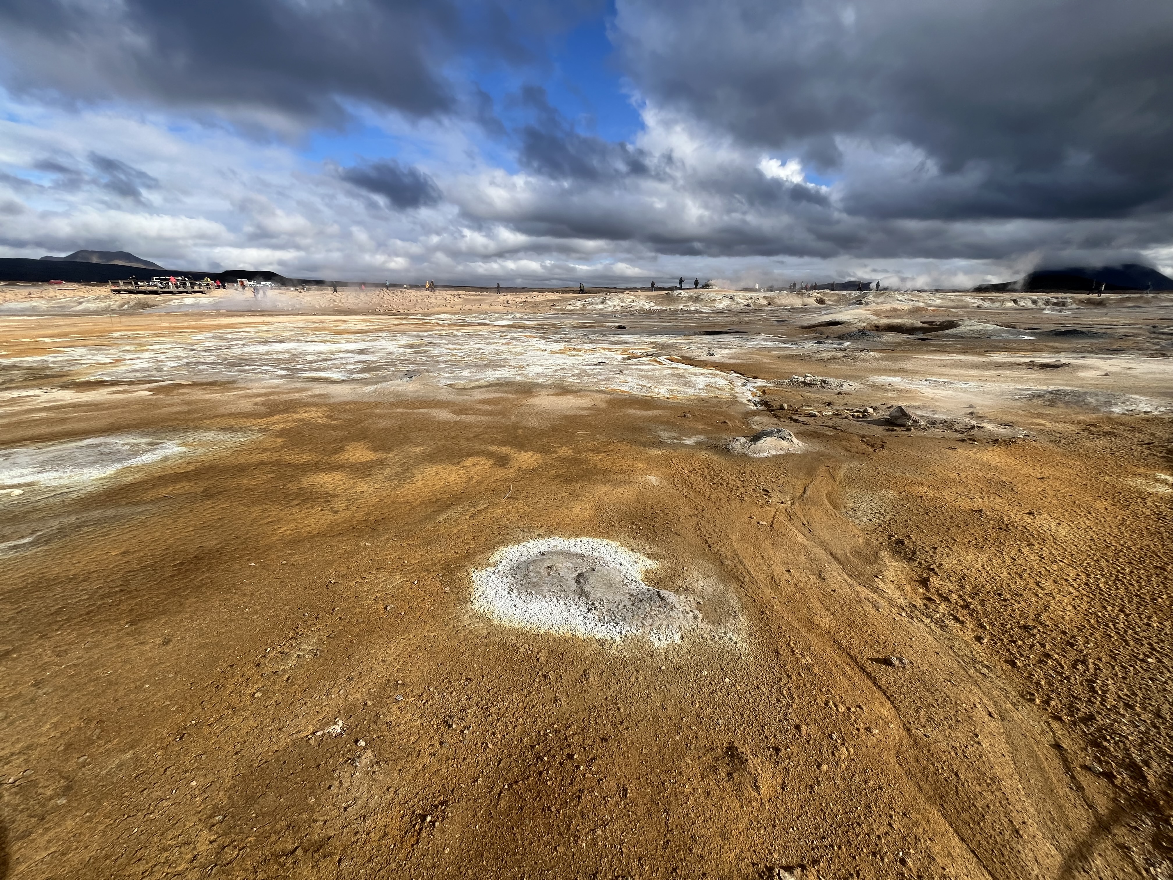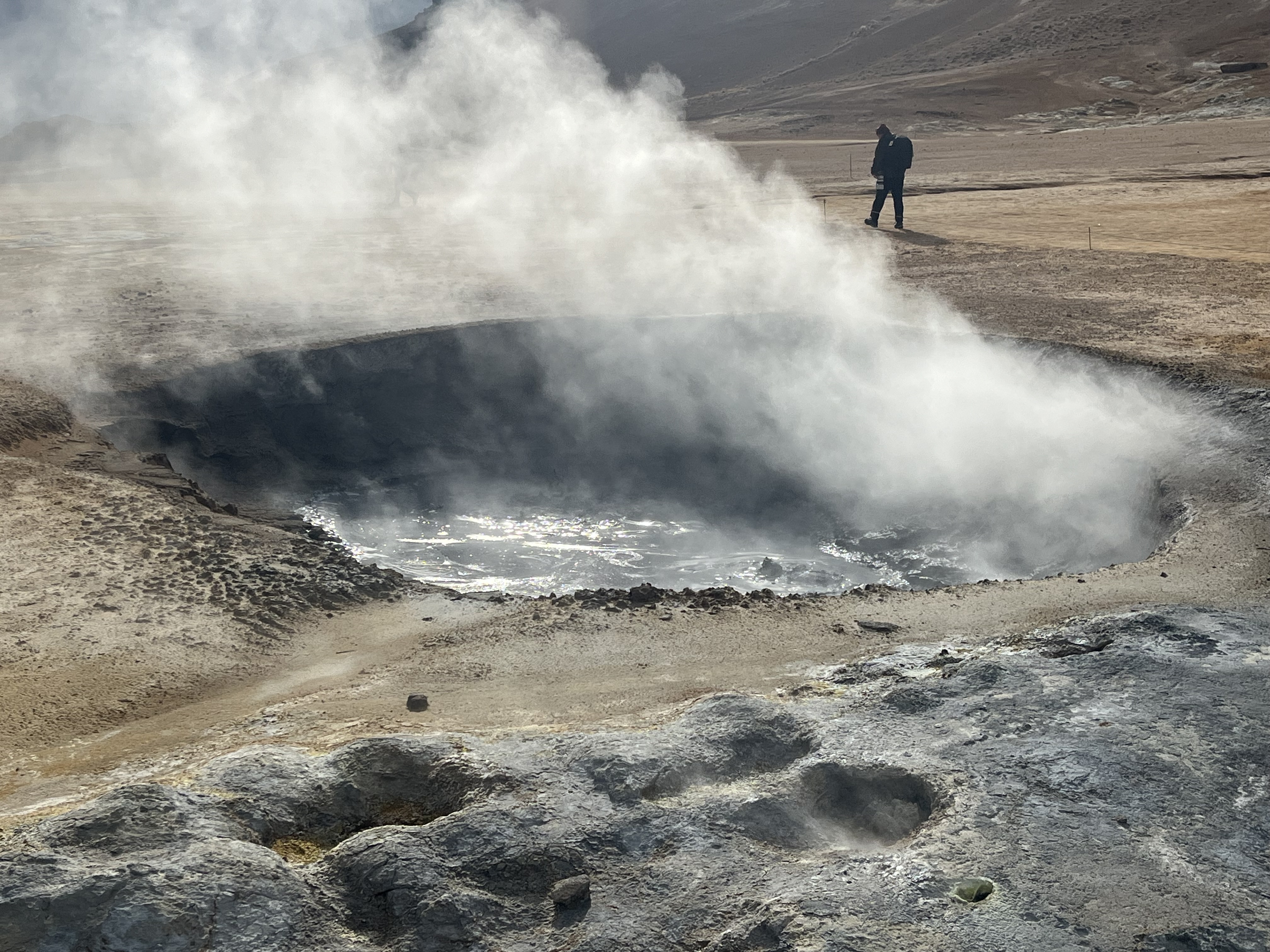 Le voyage se poursuit vers le champ de solfatares de Námaskarð, où l'eau chaude jaillit avec vigeur sous forme de fumée. L'air est imprégné de soufre, ce qui rappelle un peu les représentations médiévales de l'enfer. Sur le chemin du retour, Marie, la compagne de voyage islandaise, nous parle de l'histoire des 13 trolls qui s'amusent avec les hommes en hiver. Heureusement nos voyageurs s'en sortent contrairement à ceux de l'histoire et le groupe se retrouve pour un dîner de choix.