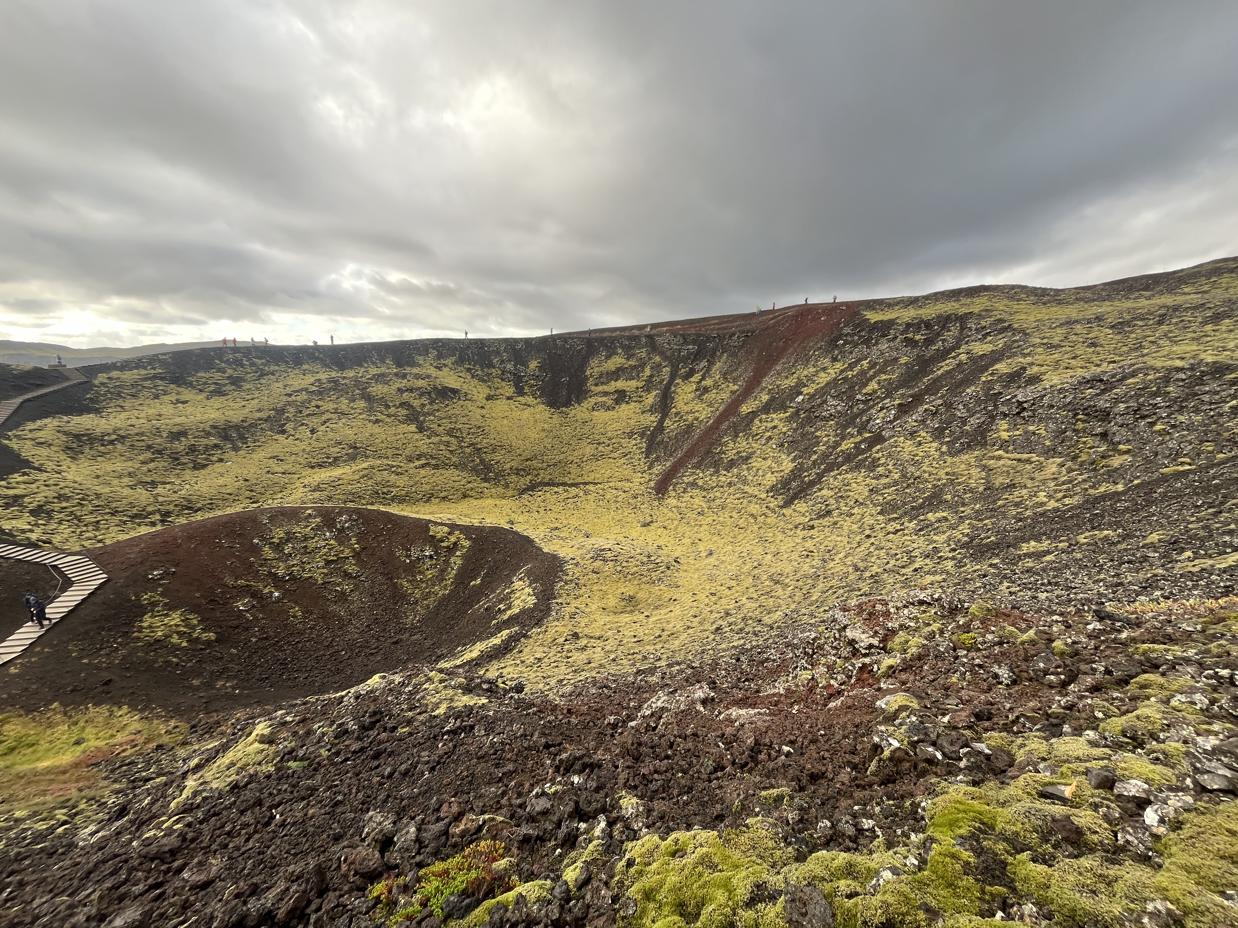 Nous nous arrêtons vers le cratère Grábrók. Ceux qui le souhaitent peuvent monter jusqu'au sommet et profiter d'une vue magnifique sur le cratère et les collines verdoyantes environnantes.