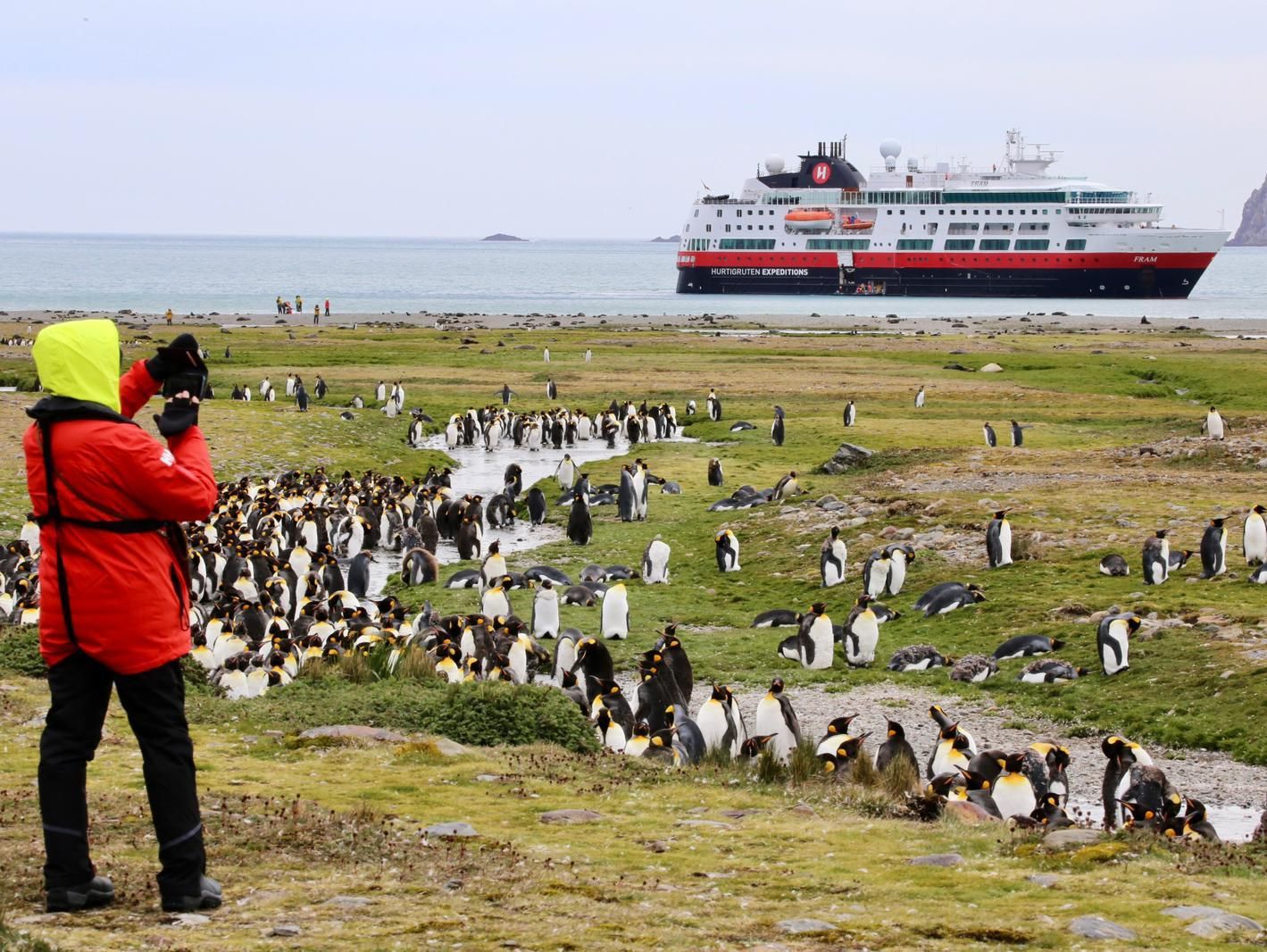 Dans l’après-midi, le MS Fram rejoint l’île de West Point. Tous les participants sont amenés à terre pour une randonnée dans un paysage de toute beauté. Nous sommes amenés à proximité directe d’une colonie d’albatros à sourcils noirs ainsi que de gorfous sauteurs. Les albatros se laissent porter par le vent au-dessus de nous tandis que les gorfous sauteurs prennent des postures qui ne cessent de nous amuser. Pour terminer l’excursion en beauté, nous nous arrêtons pour un afternoon tea auprès des charmants gardiens de l’île, puis contemplons quelques manchots de Magellan sur la plage.