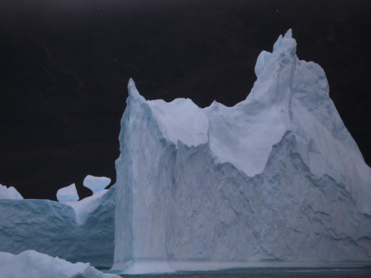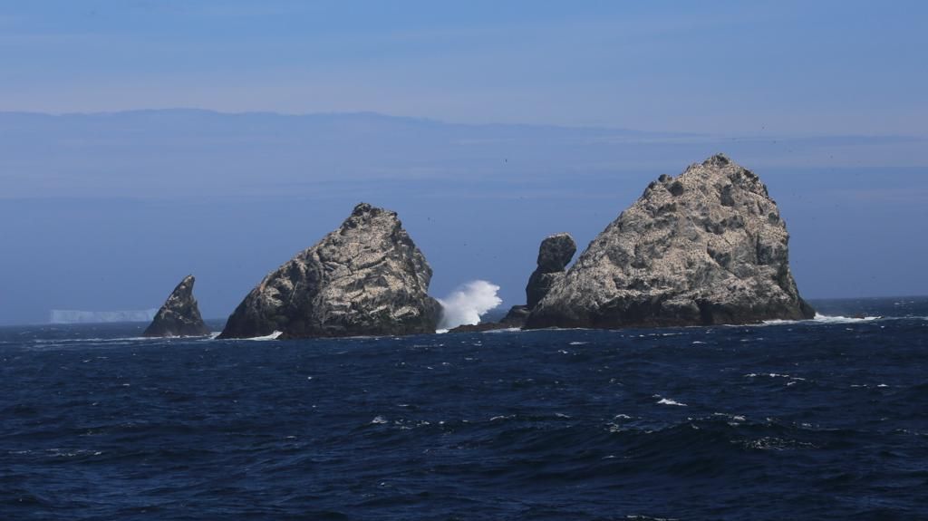 Dans l’après-midi, nous assistons à une présentation sur les oiseaux de la Géorgie du Sud puis à une passionnante conférence improvisée d’un de nos participants sur l’équilibre et le mal de mer. Entre une présentation et l’autre, la nature nous réserve de belles surprises qui nous attirent vers les baies vitrées et sur le pont. Nous suivons avec bonheur l’évolution de plusieurs baleines dont des baleines à bosse et des rorquals communs. Nous admirons aussi nos premiers icebergs et nous amusons à leur trouver des formes amusantes. Enfin, nous passons Shag Rocks, une très étonnante formation rocheuse érigée en plein océan.