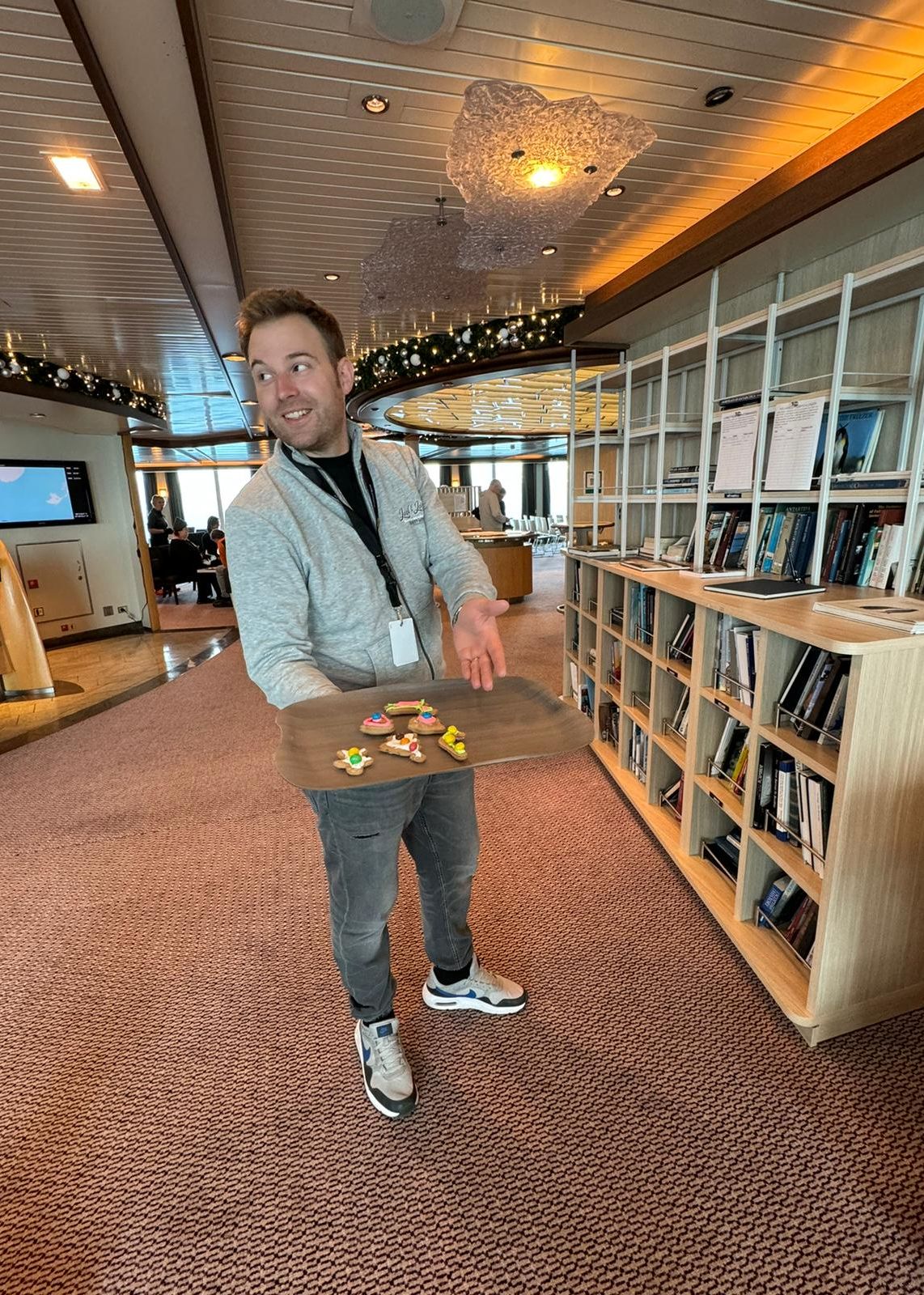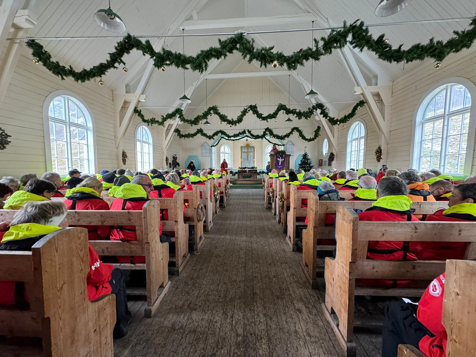 Cette année, notre fête de Noël ne ressemble à aucune de celles que nous avons pu célébrer dans le passé. Nous commençons notre journée avec une visite de l’ancienne station baleinière de Grytviken. Contrairement aux autres que nous avons eu l’occasion de visiter, celle-ci est en partie habitée par des chercheurs et par des membres de South Georgia Heritage Trust. Nous pouvons nous promener dans le petit village et visiter le très intéressant petit musée qui nous apprend beaucoup sur le quotidien des baleiniers, sans oublier une réplique du James Caird, la barque utilisée par Shackleton lors de son voyage vers la Géorgie du Sud. À 11h, une célébration de Noël est proposée aux passagers et à l’équipage du navire, exactement 110 ans après la toute première messe célébrée dans ce lieu chargé d’histoire. Quel moment riche en émotions ! Nous avons ensuite pu voir la tombe d’Ernest Shackleton, avant de reprendre notre navigation vers l’est. Nous atteignons en fin d’après-midi le site de Godthul. Un débarquement à terre est étudié mais finalement, au vu de la grande quantité d’otaries à fourrure sur la plage, l’équipe d’expédition opte pour une croisière le long de la plage et autour d’un joli iceberg sur lequel a élu domicile toute une colonie de manchots papous. Nous nous régalons du spectacle des manchots qui sautent et glissent de l’iceberg. Le soir, après un bon repas, nous passons tous un très agréable moment au pont 7 avec de belles histoires de Noël et un spectacle musical proposé par le groupe musical du bateau, le Seasick Band. Une soirée de Noël à nulle autre pareille s’achève.
