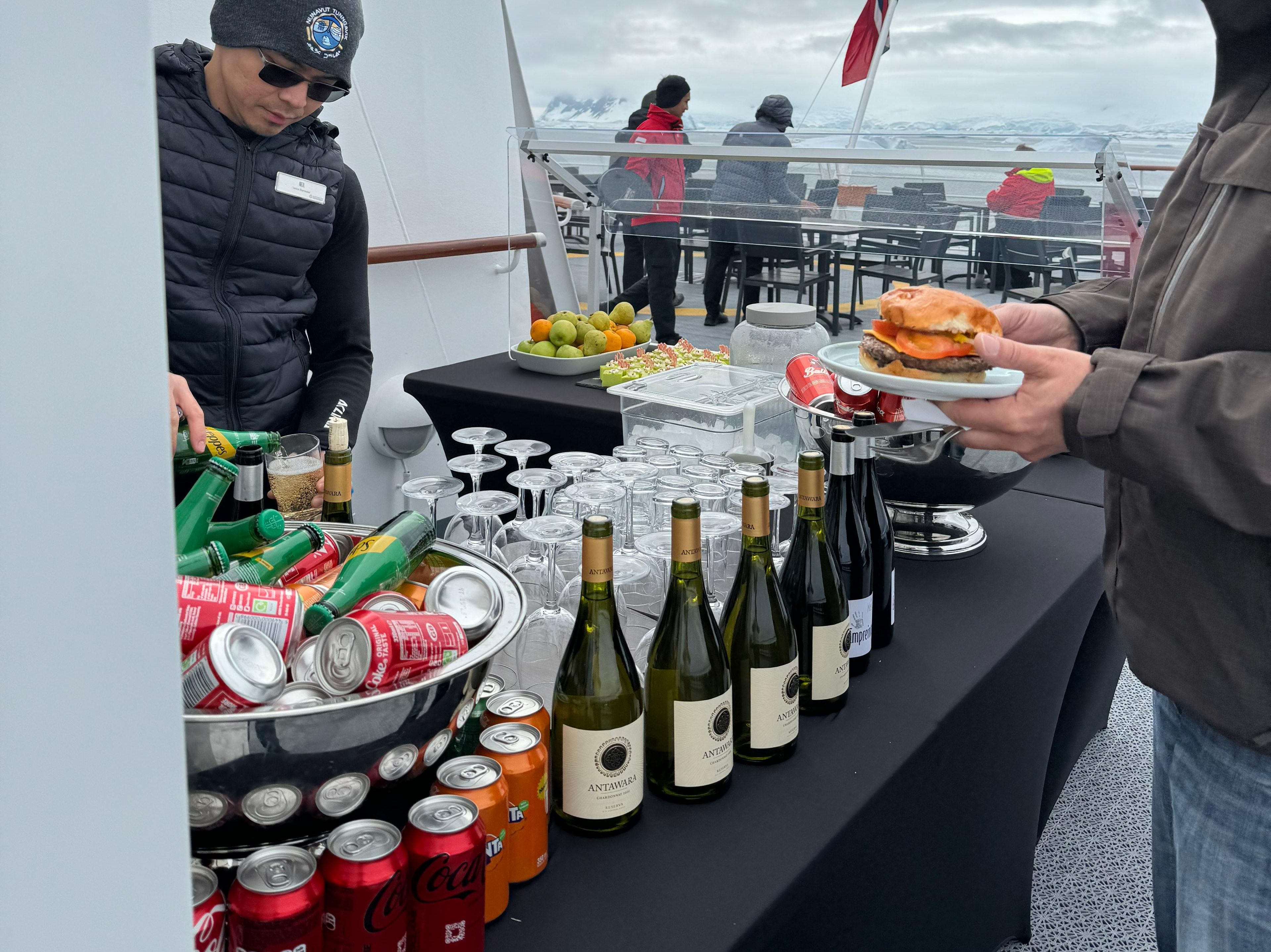 C’est aujourd’hui le premier jour de l’année mais aussi le dernier en péninsule Antarctique. Nous sommes donc décidés à en profiter au maximum. Toutefois, ce voyage reste une expédition avec les aléas que cela comporte. Ainsi, nous apprenons ce matin que le débarquement prévu à Port Charcot ne pourra pas se faire car l’accès au site est bloqué par la glace. Ce n’est pas un souci, l’équipe d’expédition a toujours un programme de substitution prêt pour ce genre d’éventualité. Nous nous rendons finalement aux îles Argentine où nous effectuons une petite croisière dans l’archipel avant de descendre à terre sur le site de Woodie Hut, un site historique utilisé par le passé pour des recherches en météorologie. En chemin, nous longeons la base ukrainienne. Nous apercevons des manchots papous, des manchots Adélie ainsi que quelques phoques de Weddell. A midi, l’équipe des cuisines nous propose un barbecue sur le pont du navire. C’est une expérience assez exceptionnelle de manger à l’air libre dans un décor si grandiose.