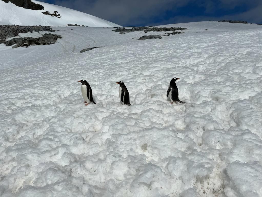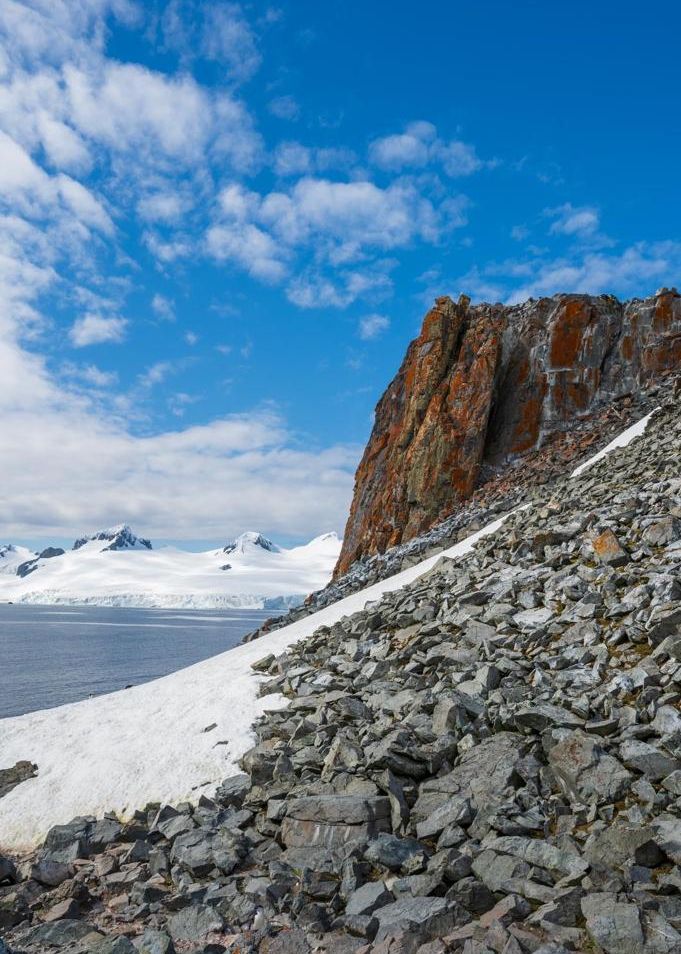 Ce matin, nous commençons notre journée sur l’île de Half Moon, dans les îles Shetland du Sud. C’est l’occasion pour nous de faire connaissance avec le seul manchot que nous n’avons pas encore rencontré : le manchot à jugulaire. Nous nous promenons sur l’île volcanique et admirons les magnifiques paysages de glaciers de l’île Livingstone en arrière-plan. Une première excursion en kayak est organisée pour les intéressés dans des conditions idéales. Le soleil perce les nuages et illumine le paysage grandiose de montagnes enneigées. Des passagers en profitent pour prendre le soleil sur le pont du navire et profiter un instant de l’été antarctique.