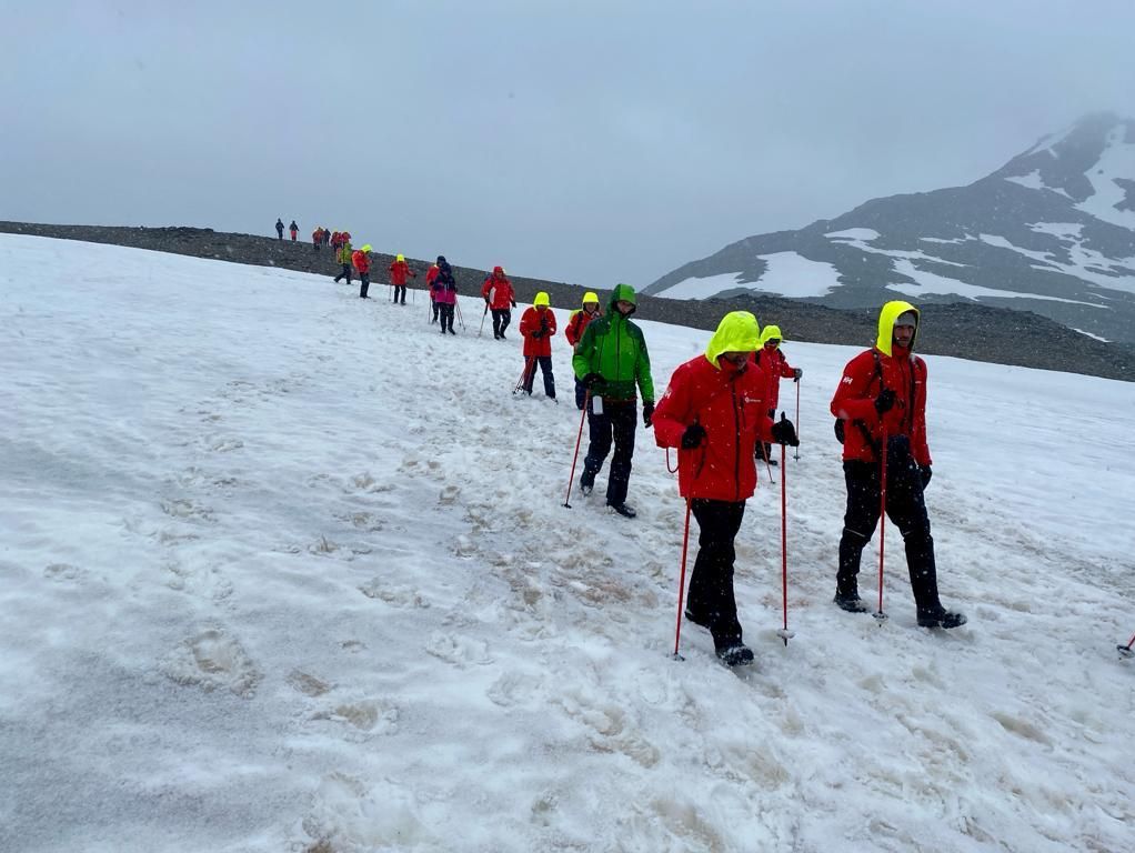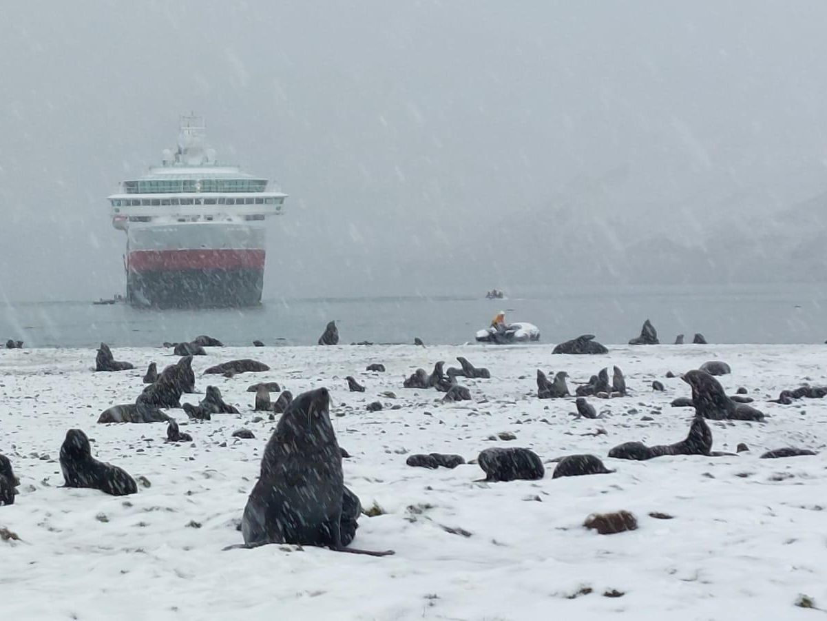 Aujourd’hui a été une journée riche en aventures. Ce matin, le MS Fram s’est arrêté dans la baie de Fortuna Bay. Nous avons fait une première sortie à terre mémorable au milieu d’une colonie de manchots royaux. Nous avons eu beaucoup de plaisir à contempler les manchots dans différentes scènes de vie, parfois très cocasses. Nous avons aussi bien pu apercevoir les jeunes manchots, certains très drôles avec leur plumage hybride, à moitié brun et à moitié gris-blanc, créant un look parfois improbable. Nous avons aussi pu admirer de nombreuses otaries à fourrure dont un bébé tout blanc, ce qui est très rare. En début d’après-midi, environ la moitié des passagers a quitté le navire pour un raid de 7 kilomètres de Fortuna Bay à Stromness, sur les traces du dernier trajet effectué par Shackleton en quête de secours pour son expédition. La neige a accompagné une bonne partie de notre randonnée, augmentant un peu la difficulté du raid. Nous avons pu nous immerger dans l’exploit de Shackleton tout en étant conscients des conditions bien plus terribles qu’il a dû affronter en chemin. La randonnée se termine à Stromness, une ancienne station baleinière désaffectée et envahie désormais par les otaries à fourrure et les éléphants de mer. Les passagers qui n’ont pas fait la randonnée ont eu le plaisir de sortir eux aussi à Stromness, sous un joli manteau blanc. Le retour sur le navire a été célébré par un vin chaud.