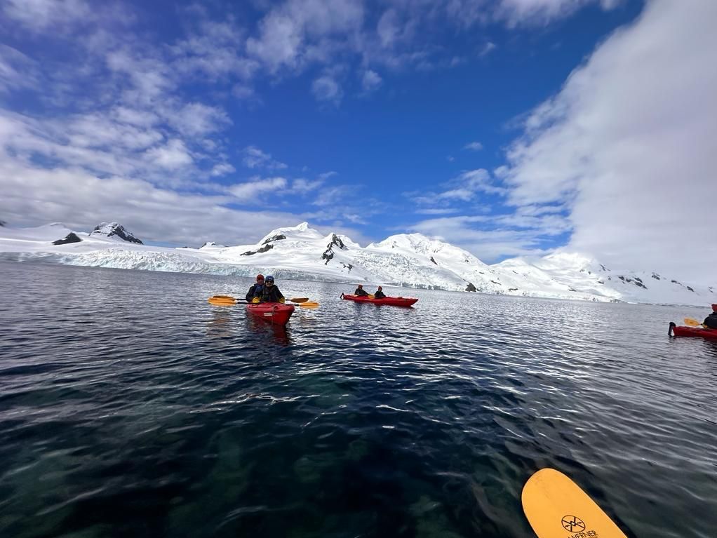 Ce matin, nous nous réveillons à nouveau dans un décor de conte de fée, celui de Neko Harbour. Le soleil brille sur un paysage de montagnes enneigées et glaciers tandis qu’une myriade d’icebergs constellent la mer. Nous partons pour une première sortie dans cette région exceptionnelle. Deux sorties en kayak sont proposées dans ce cadre de toute beauté. L’impression lorsque l’on pagaie en silence au milieu des glaces est tout simplement magique. De temps à autre, nous croisons des phoques de Weddell étendus sur la glace, puis admirons avec émerveillement des manchots qui glissent harmonieusement dans les eaux qui nous entourent. Dans l’après-midi, nous arrivons à proximité de la base anglaise de Port Lockroy. Comme il n’est pas possible de visiter la base, c’est le personnel de UK Antarctic Heritage Trust de Port Lockroy qui vient à bord du navire pour nous raconter le quotidien dans ce lieu au bout du monde et sa mission de protection du patrimoine de l’Antarctique. Plusieurs articles sont mis en vente et il est même possible de poster des cartes postales depuis ce lieu si isolé. Nous partons ensuite à terre à Damoy Point où l’on peut notamment visiter une cabane historique restaurée depuis peu par l’association de Port Lockroy.
