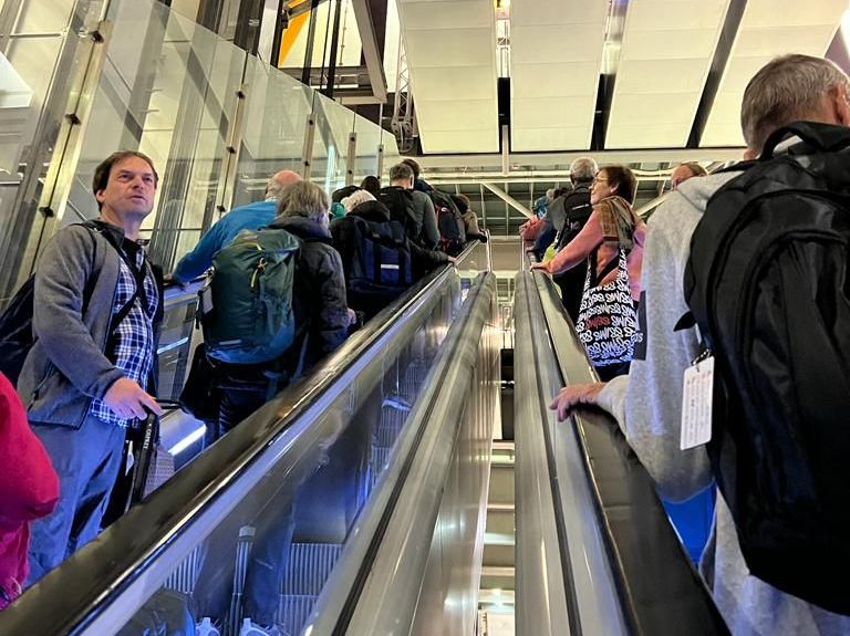 Tandis que pour certains, le voyage se termine aujourd’hui avec leur arrivée en Suisse, une bonne partie des participants se prépare à un retour plus long que prévu. A minuit et quart, un premier bus arrive à l’hôtel pour nous emmener à l’aéroport. Nous découvrons que le Chili est assez loin de l’efficacité helvétique. En effet, deux bus seulement ont été envoyés pour nous chercher alors que nous sommes près d’une centaine de participants, ce qui va nécessiter de nombreux allers et retour entre l’hôtel et l’aéroport pour convoyer la totalité du groupe. De plus, ces bus n’ont pas de compartiments pour les bagages, ce qui nous demande un certain talent logistique ainsi que bien quelques bras musclés pour transporter tous les bagages dans les bus. Bien que plutôt fatigués par une nuit très courte, les participants se montrent compréhensifs et serviables, ce qui nous permet de tous rejoindre l’aéroport dans les temps. Après une assez longue procédure d’enregistrement, nous embarquons enfin sur notre vol qui doit nous ramener en Europe. Nous n’en savons pas plus pour l’instant car la compagnie aérienne n’est pas en mesure de nous informer de la suite de notre voyage. Durant le vol transatlantique, nos accompagnants nous communiquent enfin une bonne nouvelle : une solution a été trouvée pour la suite du voyage et nous serons tous en mesure de rentrer en Suisse le jour suivant. Nous arrivons à Madrid dans la soirée et sommes transférés dans un hôtel à proximité de l’aéroport. Encore une fois, la nuit sera courte mais nous nous réjouissons de pouvoir enfin rentrer chez nous le lendemain. Durant ce retour un peu éprouvant, nous avons une pensée pour Shackleton qui avait lui aussi connu l’adversité pour ramener tous ses hommes à la maison.