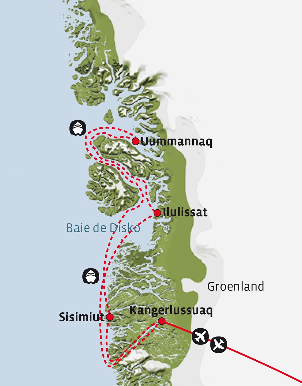 Notre destination pour ce voyage c’est la plus grande île du monde. Cette expédition mène à la côte ouest du Groenland. Nos attentes sont différentes, nous voulons voir la glace, de grands icebergs, des randonnées dans une nature unique, apprendre à connaître la vie des Inuits, nous détendre de la vie de tout les jours…. Après une courte visite d’un Copenhagen ensoleillé, nous arrivons à Kangerlussuaq bien après minuit temps suisse, qui est encore aussi lumineux que le jour. De l’aéroport, nous conduisons avec de vieux autobus scolaires et des camions convertis les 12 kilomètres jusqu’à la petite jetée. Et de là, les bateaux Polarcircle nous emmènent rapidement à la MV Fram. Bientôt, il est devenu évident que tous les passagers étaient sur le bateau, mais de certains les valises n’ont pas été livres…