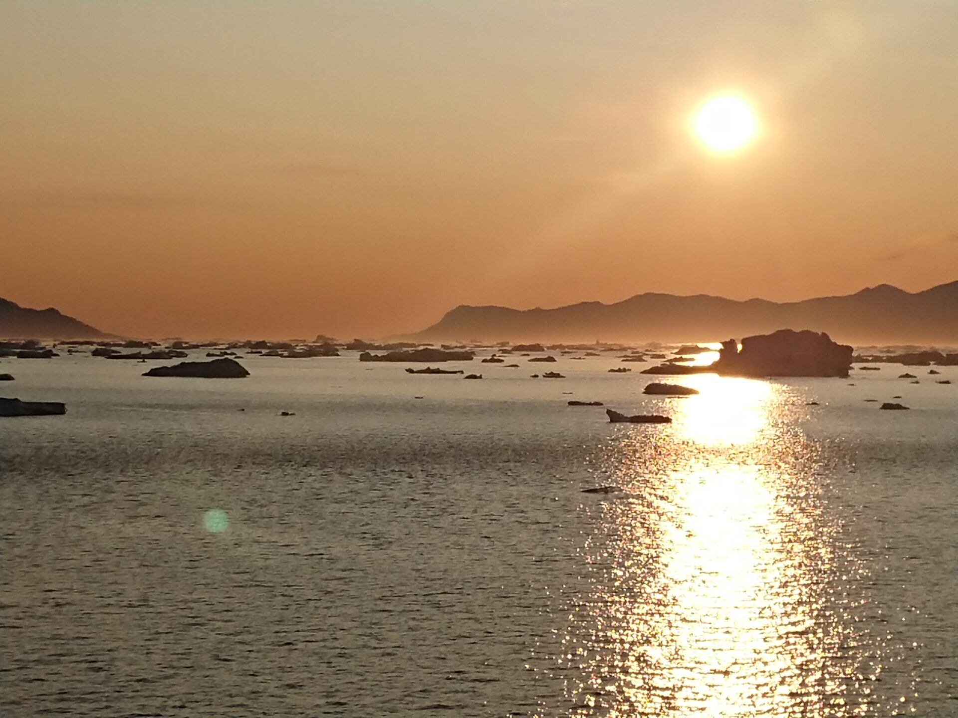 De retour sur le bateau, nous traversons le Disko Bay. Les icebergs deviennent de plus en plus gros et fréquents et peu après notre départ tout le monde sort sur le pont pour voir les énormes icebergs. Grâce à notre capitaine, nous pouvons faire un tour autour un des icebergs avec le Fram pour le voir de tous les côtés. Aussi les heures du soir sont spectaculaires. Lentement, nous naviguons à travers les icebergs flottants vers le soleil couchant. Avant d’arriver à Ukkusissat, il nous reste encore beaucoup de chemin à faire. Mais le temps passe vite, nous devons choisir entre les conférences passionnantes de l’équipe de l’expédition et le panorama impressionnant du passage.