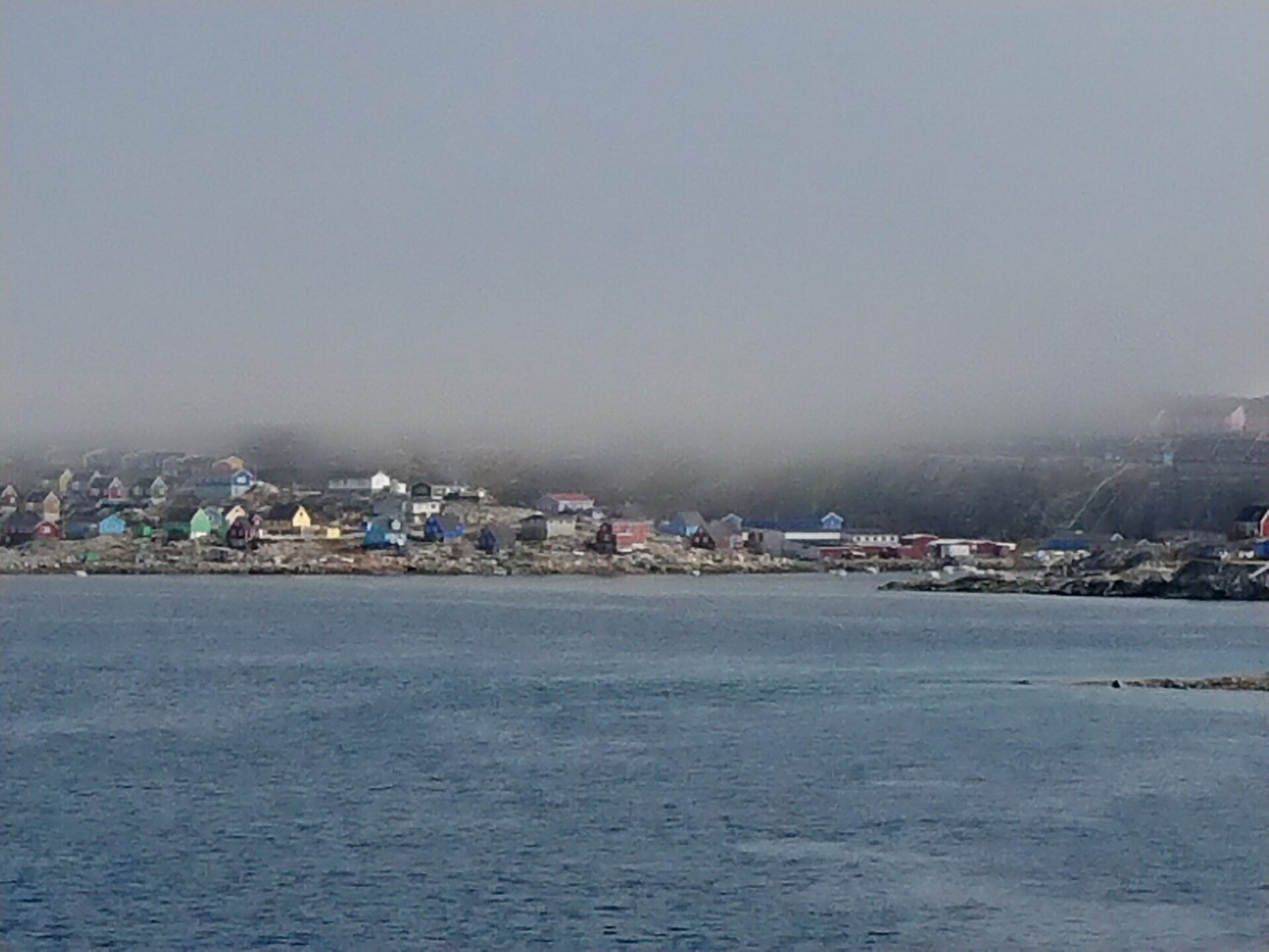 Le vent a tourné et une épaisse soupe de brume nous entoure à Ilimanaq. Dans l’espoir de meilleures conditions météorologiques, le Fram appelle le village Aasiaat par radio pour s’enquérir des conditions locales. La situation semble instable, mais nous décidons d’ajuster notre route pour chercher le soleil. Contrairement à nos observations quotidiennes au Groenland, Bernard Pichon nous donne un aperçu de ses voyages en Asie. Juste à temps pour notre arrivée à Aasiaat, le soleil apparaît et nous voyons les maisons colorées sur la côte briller à travers le brouillard.