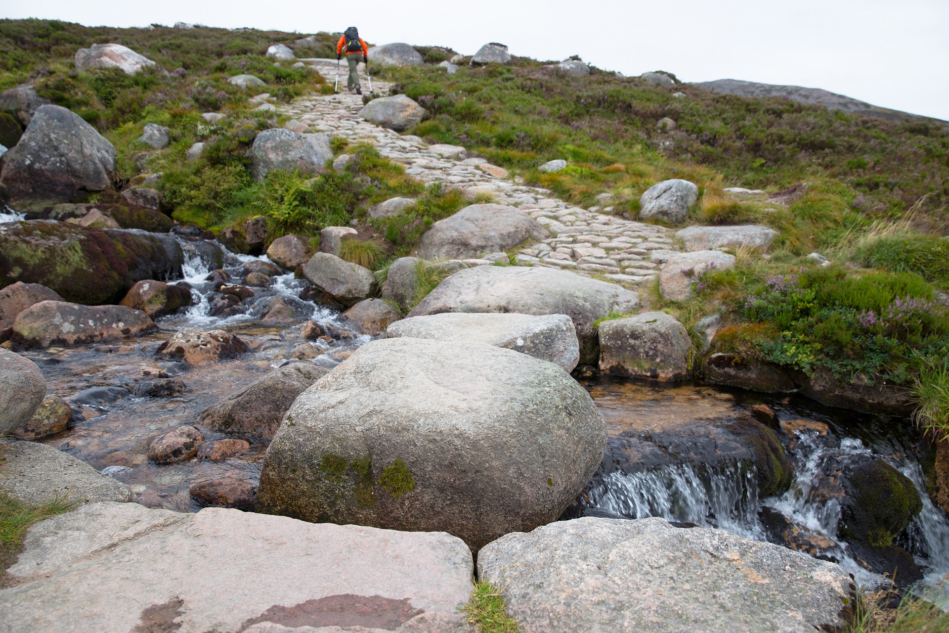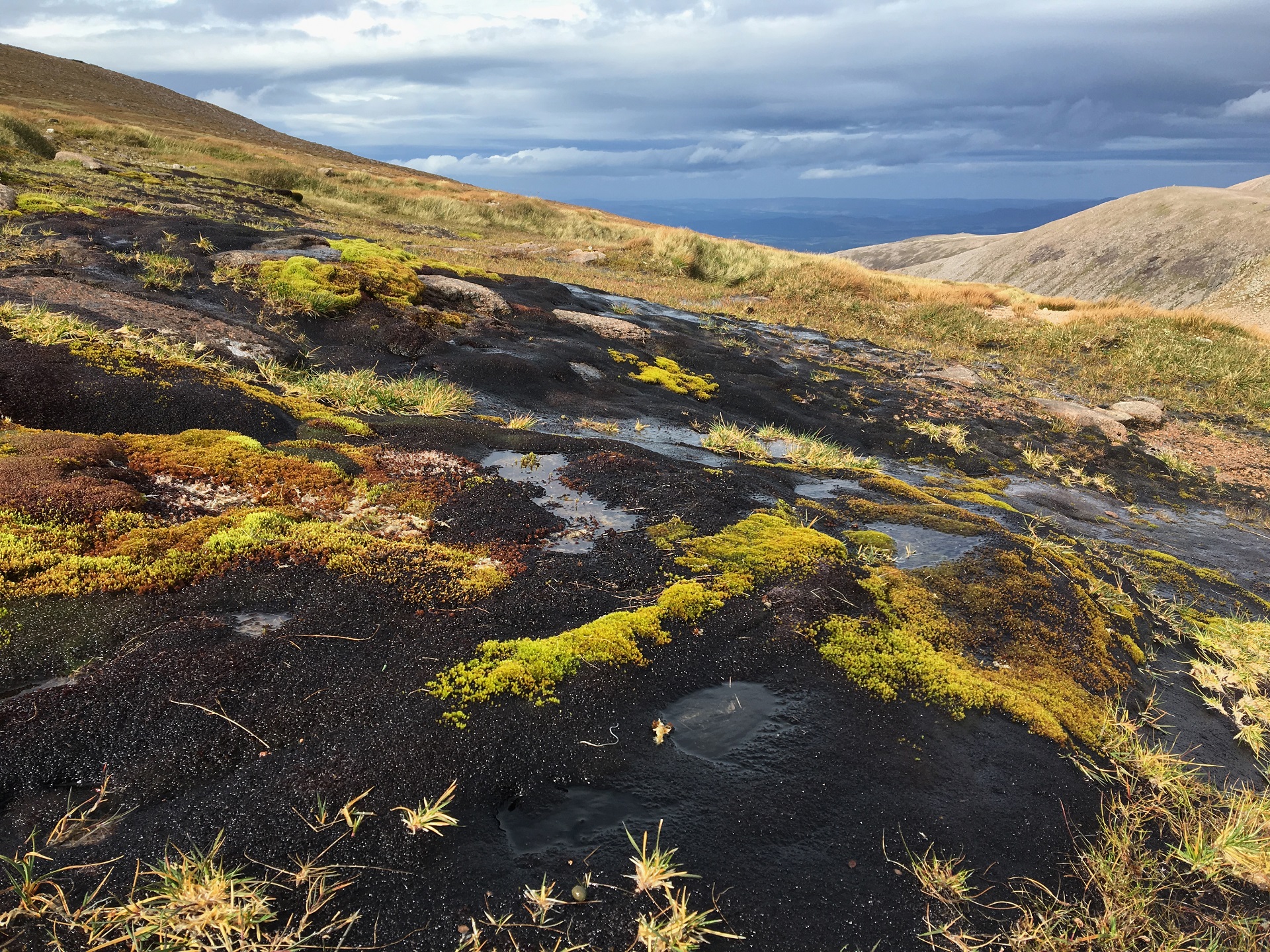 Puis nous descendons vers la crête de Memle. Un avion d'entraînement s'est écrasé ici pendant la Seconde Guerre mondiale. Les débris sont encore visibles. Un mémorial décoré de petites croix de bois et de fleurs nous rappelle les jeunes hommes qui ont perdu la vie à cette époque. Soudainement, la pluie s'arrête. Seul le vent souffle encore et plaque mes cheveux sur mon visage tandis que nous descendons vers les petites rivières. En face de nous, le col Lairing Ghru se dévoile. Après la descente à travers les pierriers et les prairies, nous apercevons le sommet du Cairn Gorm. Une fois encore, nous descendons une pente raide qui nous mène jusqu’à la Coire Raibeirt. Derrière nous se trouve le massif sombre du Cairn Lochan où, le matin, le brouillard recouvre les formations rocheuses. Il fait brusquement chaud. J'enlève mes gants, ma veste et mon pull.