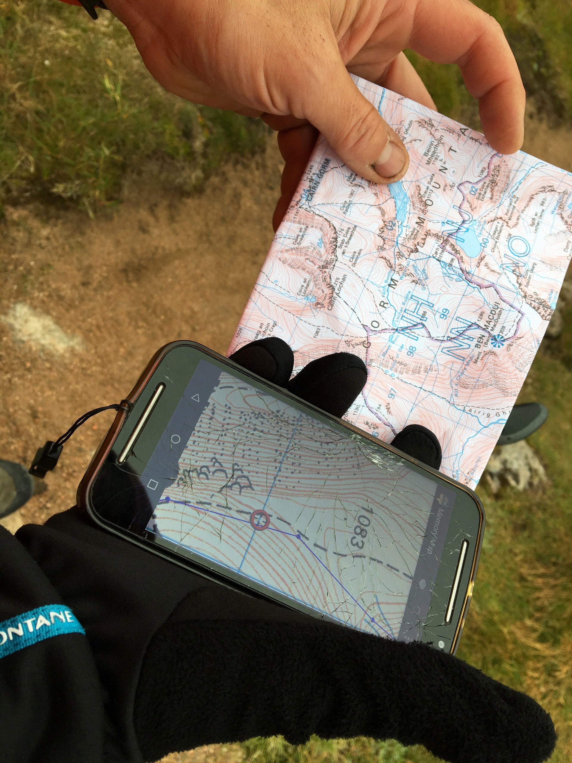 Boussole, carte et smartphone sont indispensables, surtout par temps de brouillard. C'est la seule aide pour s'orienter, car il n'y a pas de marquage au sol. Mark sort sa boussole et compare les données avec la carte. Aucun signal ne vient du smartphone, les parois rocheuses autour de nous sont trop hautes. " Très bien, nous sommes sur la bonne voie " dit-il, et nous continuons à monter la colline. Soudain, deux personnages blancs apparaissent devant nous, une femme et un homme.
