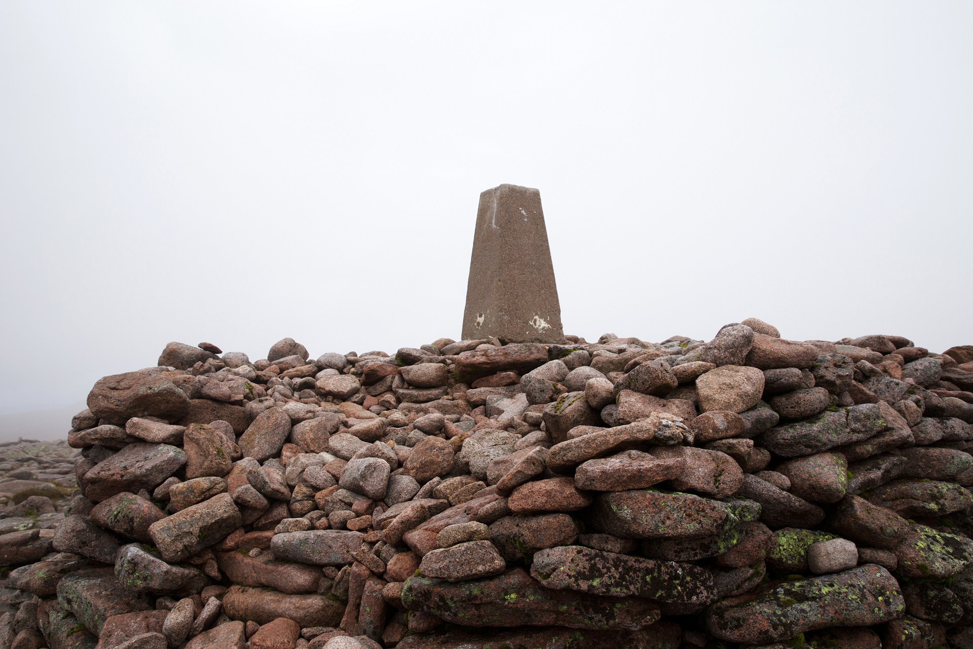 C'est de plus en plus raide et caillouteux. La pluie fouette. Le vent siffle. Nous faisons de la randonnée. Lentement, nous traversons un pierrier. Mais alors un bloc de béton entre dans mon champ de vision : le panneau pour le Munro. Les derniers mètres d'ascension se trouvent devant moi. Sur des pierres qui vacillent, mais qui ressemblent à des œuvres d'art avec leurs motifs blancs et vert clair. Et finalement, après environ trois heures de marche, le sommet. Je pose solennellement les mains sur le bloc de béton : Ben Macdui, ma première ! L'" Abri " dont Marc nous a parlé est constitué d'un mur de pierre pour se protéger du vent. "Peu importe le nombre de personnes déjà assises ici, si l'une d'elles vient, vous faites de la place." Aujourd'hui, nous sommes seuls. Mark ouvre une sorte de tente sans pied et la pose sur nous deux.