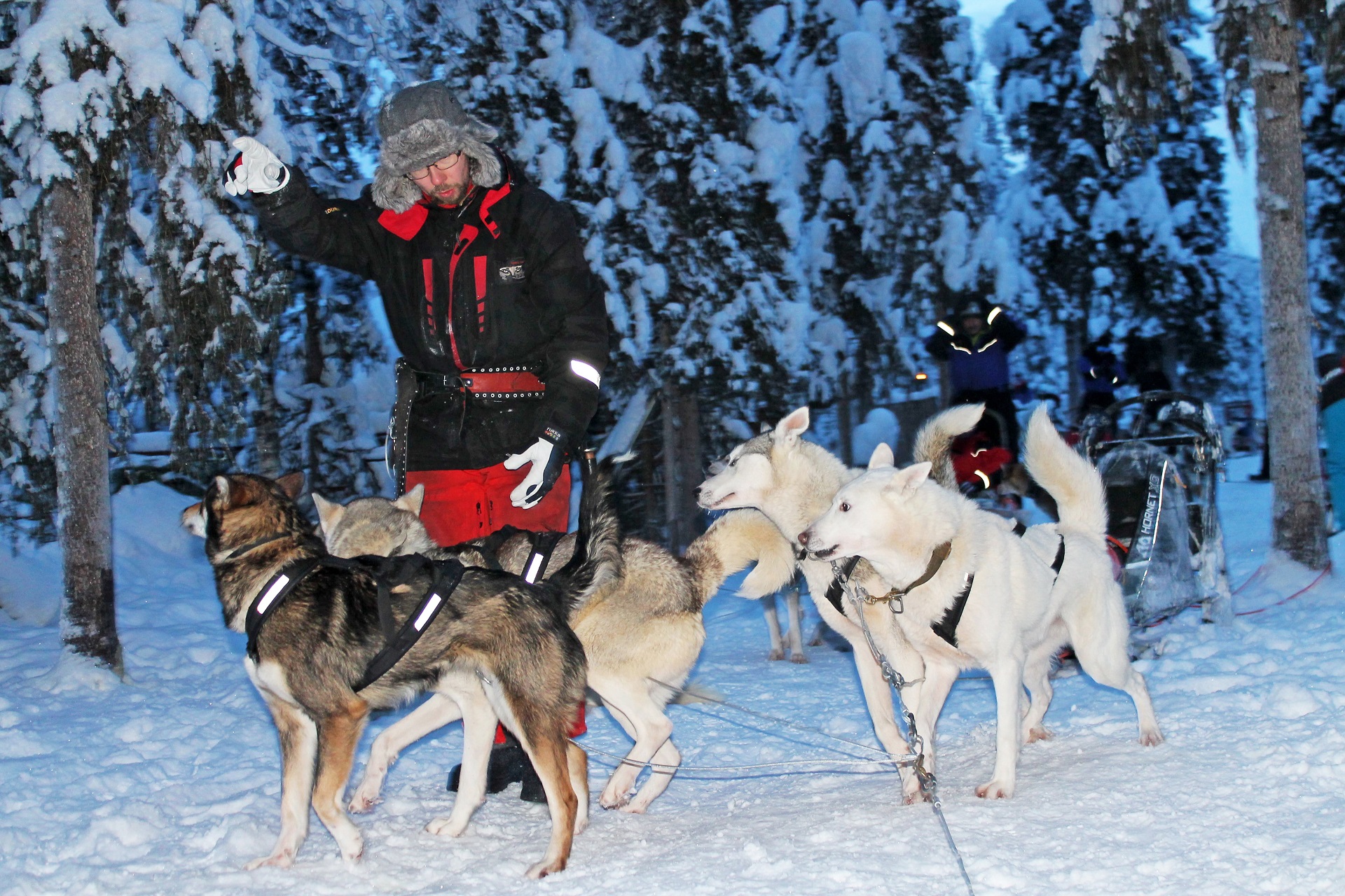«Vous n'avez pas d'autres gants ?» Rien n'échappe aux yeux attentifs de Rami. Il examine d'un œil critique mes gants fantaisies, mais beaucoup trop fins. Ce n'est que lorsqu'il voit mon équipement - de bonnes chaussures, un overall et des sur-gants - qu'il acquiesce d'un signe de tête pour se tourner immédiatement vers mon voisin : « Où est ta casquette ?» Rami Kulppi, 42 ans, petite barbe, ceinture Sami avec couteau, bonnet de fourrure, a de bonnes raisons pour ses questions : la température a chuté à moins 36 degrés, et même lui, qui a grandi ici, trouve cela assez frais. "Ici" on se trouve à la ferme "Rami's Huskies" à l'entrée du parc national Ylläs-Pallas en Laponie finlandaise, à une demi-heure de bus d'Äkäslompolo, à plus de 250 kilomètres au-dessus du cercle polaire. Quand l'organisateur nous a offert les bottes plus chaudes, les bonnet de fourrure, les sur-gants et la combinaison coupe-vent, nous avons été assez intelligents pour tout mettre. Comme des astronautes, nous avons titubé jusqu'à l'autobus et nous nous sommes encombrés dans les sièges. Pendant le trajet, le soleil était comme une boule de feu au-dessus de l'horizon et colorait le ciel. Une demi-heure plus tard, des rayures roses témoignent de ce spectacle.