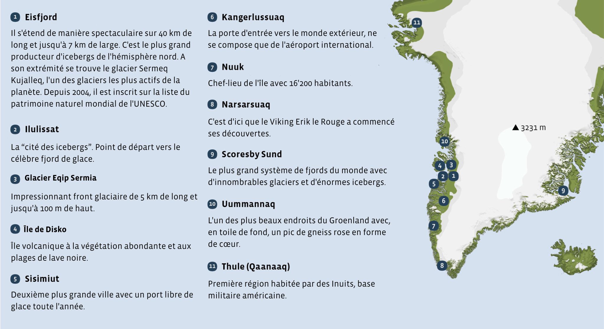 Le Groenland possède des dépôts de glace d'une ampleur inimaginable. Seulement environ 20% de la zone est libre de glace. Les 1,7 million de km2 restants sont recouverts en moyenne de 2000 mètres de glace. A certains endroits, l'épaisseur de la glace atteint 3400 mètres, ce qui n'est dépassé qu'en Antarctique. Le niveau mondial de la mer augmenterait de six mètres si toute la glace intérieure du Groenland devait fondre.