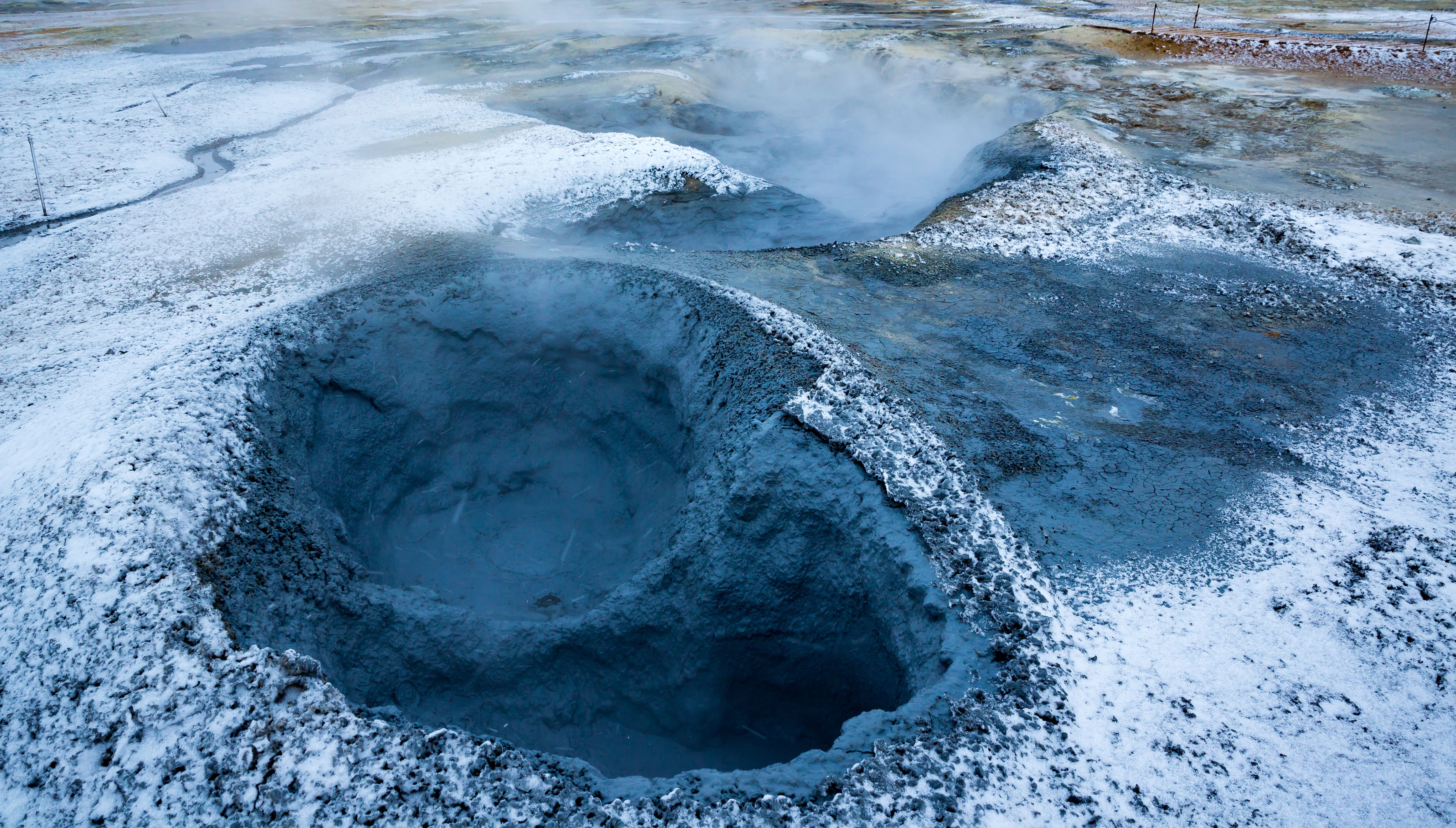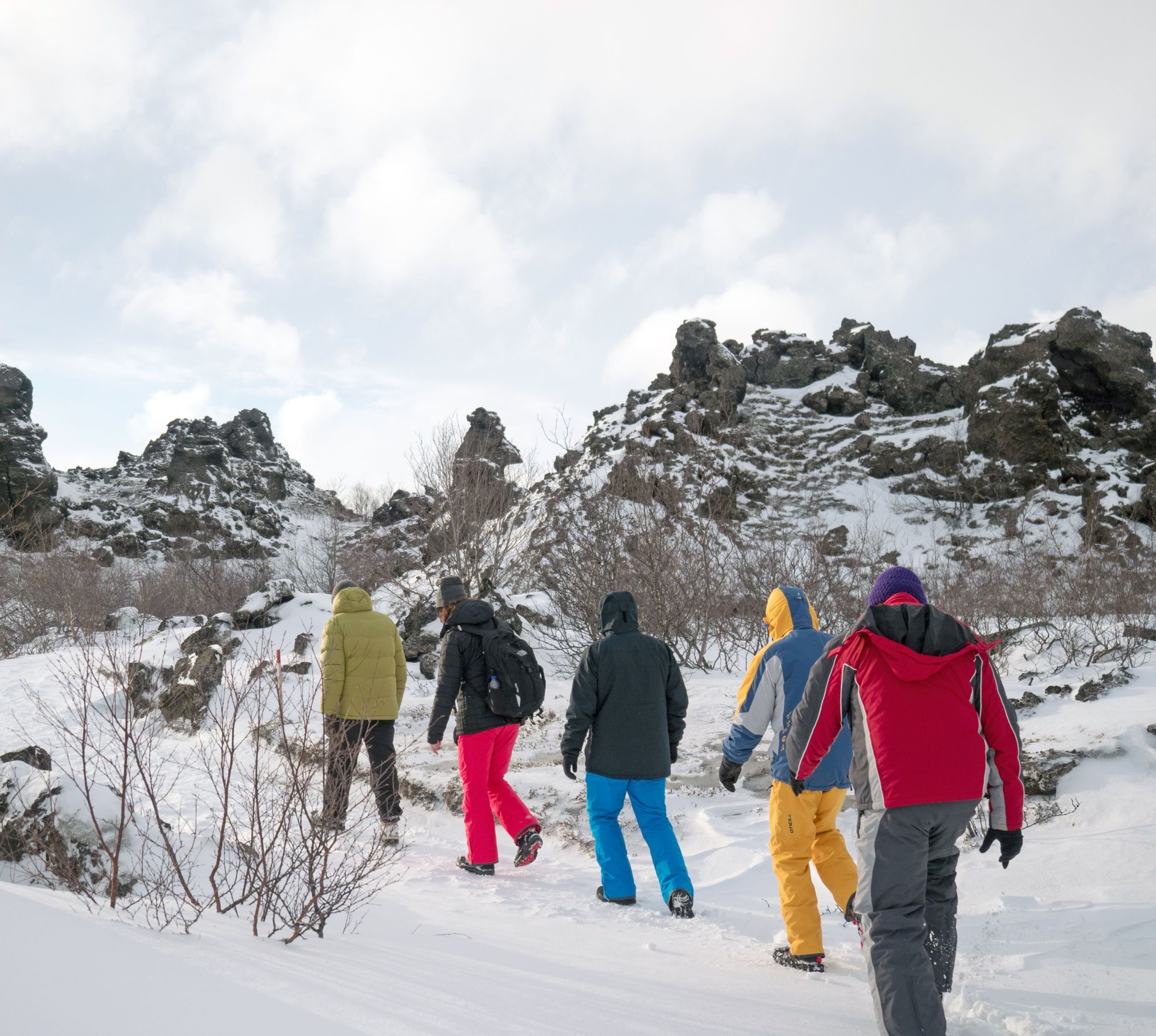 Nous nous promenons dans un paysage de lave surréalistes de Dimmuborgir, les châteaux sombres. C'est là que vivent les elfes, les trolls, le peuple caché et d'innombrables créatures fantastiques et fabuleuses. «Vous n'avez qu'à bien regarder», nous demande le guide Trausti, et effectivement : du roi endormi à la licorne, nous voyons presque tout. Seuls les treize compagnons de Noël ne se laissent pas voir. «Croyez-moi, vous ne voulez pas voir ces types effrayants», s'exclame Trausti avant d'ajouter : «Et encore moins Grýla, leur affreuse mère troll, qui» - Trausti fait une pause - «fait bouillir les gens dans ses énormes marmites». Silence gêné. «S'il y a une éruption volcanique en Islande, elle vient du feu de l'enfer dans la cuisine souterraine», ajoute Trausti. «Les Islandais sont vraiment fous», ricane Marie à mon oreille. Aussi fou que ce paysage qui semble surréaliste. Nous marchons sur des pseudo-cratères enneigés, reniflons l'odeur d'œufs pourris des marmites bouillonnantes au bord de la zone volcanique géothermique de Krafla, câlinons des chevaux islandais stoïques et mâchouilleurs, descendons jusqu'au lac troglodyte dans la crevasse de Grjótagjá et traçons notre sillon en raquettes sur les rives du lac des Moucherons.
