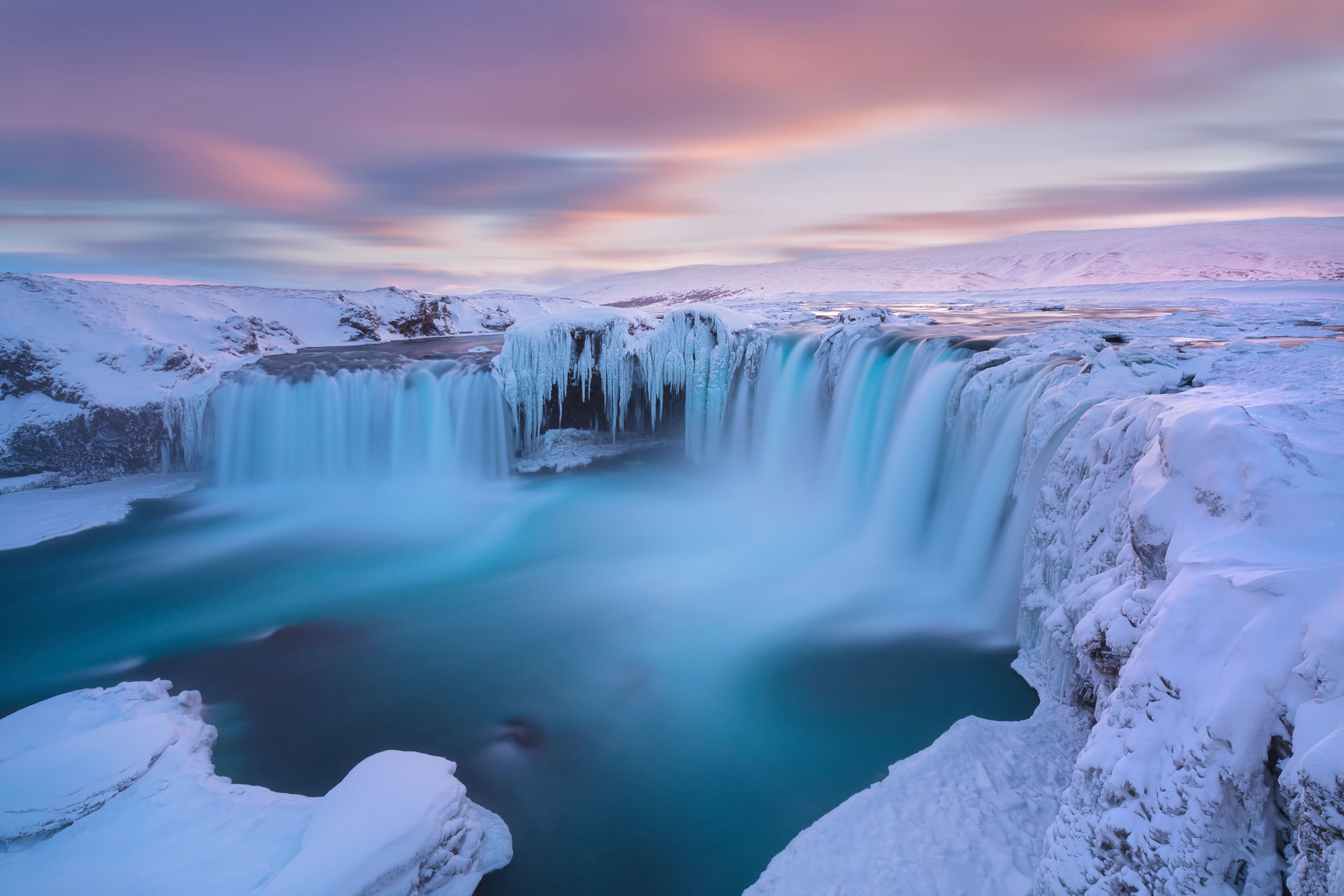 Je le remarque à peine, tant le spectacle me fascine : l'eau gronde et descend en cascade dans le fond vert, entre d'énormes stalactites de glace qui pendent jusqu'à 17 mètres de profondeur dans le canyon. Je me souviens d'avoir dû me frayer un chemin parmi les touristes en été. Aujourd'hui, le contraste est saisissant : La neige a enveloppé le paysage dans de la ouate, les formations de glace donnent à la cascade de 30 mètres de large un aspect mystérieux, le soleil couchant enveloppe les crêtes blanches d'une lumière dorée et, à part le grondement, aucun bruit ne se fait entendre. Je suis seule, Goðafoss célèbre toute sa magie exclusivement pour moi.