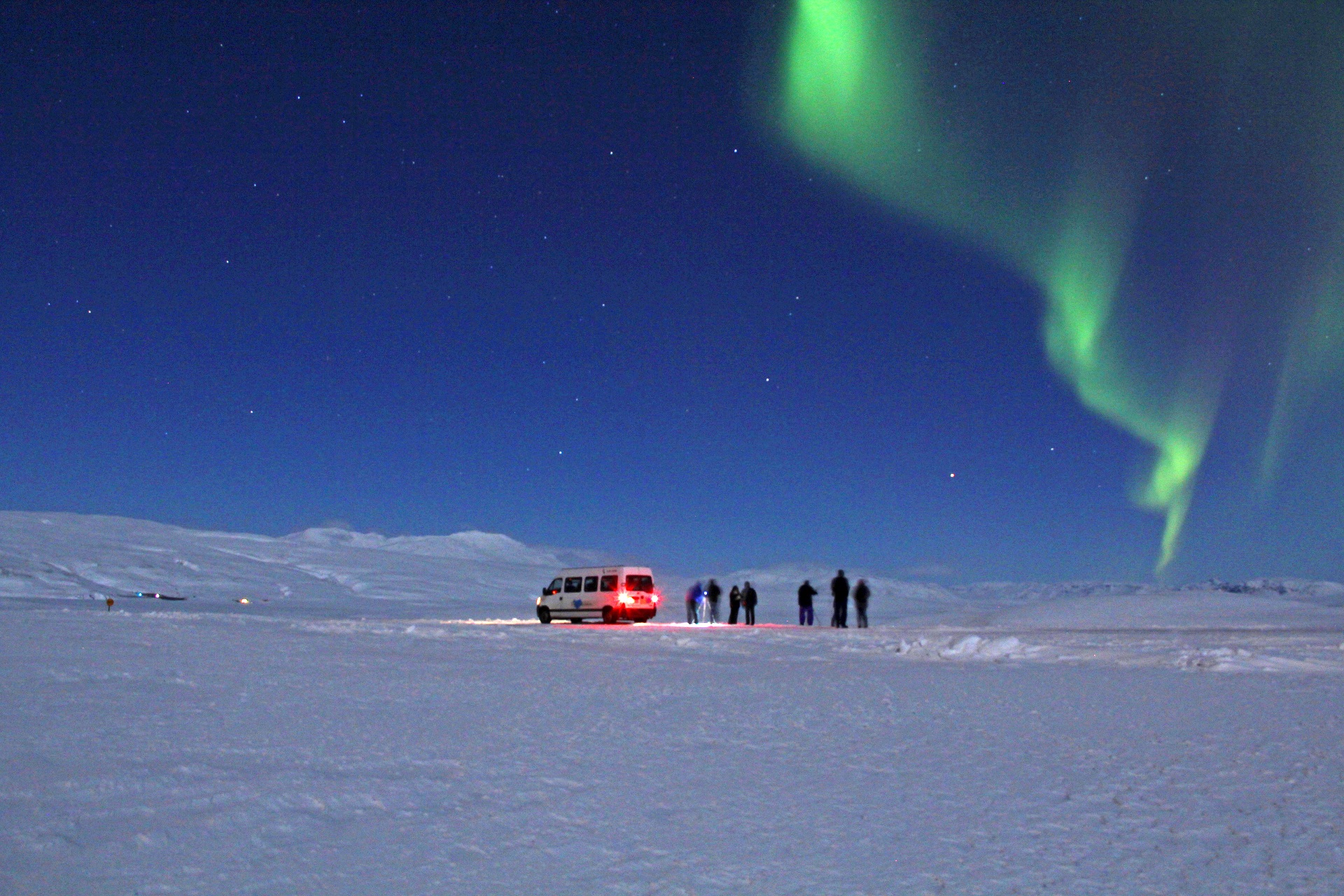 Je remarque que le mât du drapeau oscille moins, je prends mon peignoir rapidement et je me précipite dans ma chambre d'hôtel. Il est temps de partir. Ces derniers jours, j'ai appris à connaître moi-même les caprices de la météo : tempête de neige soudaine, soleil du matin au soir, orage inattendu. C'est le vent qui fait que le temps change si vite. Il y a donc de bonnes chances que le soleil brille pendant un séjour en Islande. Pendant la période la plus sombre de l'année, entre le début et la fin décembre, le soleil ne se lève que brièvement au-dessus de l'horizon ce qui engendre de belles ambiances crépusculaires. Sans oublier les aurores boréales : à l'hôtel Framnes à Grundarfjörður, à 2 heures du matin, un grondement m'arracha à mon sommeil. Avec les mots "Northern Lights", tous les clients de l'hôtel qui s'étaient inscrits sur la liste des aurores boréales ont été réveillés. Quelques minutes plus tard, je restais sans voix devant la porte du parking de l'hôtel et m'émerveillais devant le vert étincelant du ciel étoilé. Des montagnes sur la mer jusqu'à l'arrière de l'hôtel, le spectacle de la nature s'est répandu dans tout le ciel. Mes premières aurores boréales! Marie-Thérèse Mrusczok, chercheuse et guide, préfère l'hiver islandais. "C'est plus calme sur l'île." Mais surtout, il y a beaucoup d'orques sur les rives de la péninsule de Snæfellsnes de janvier à mars. Un véritable paradis!