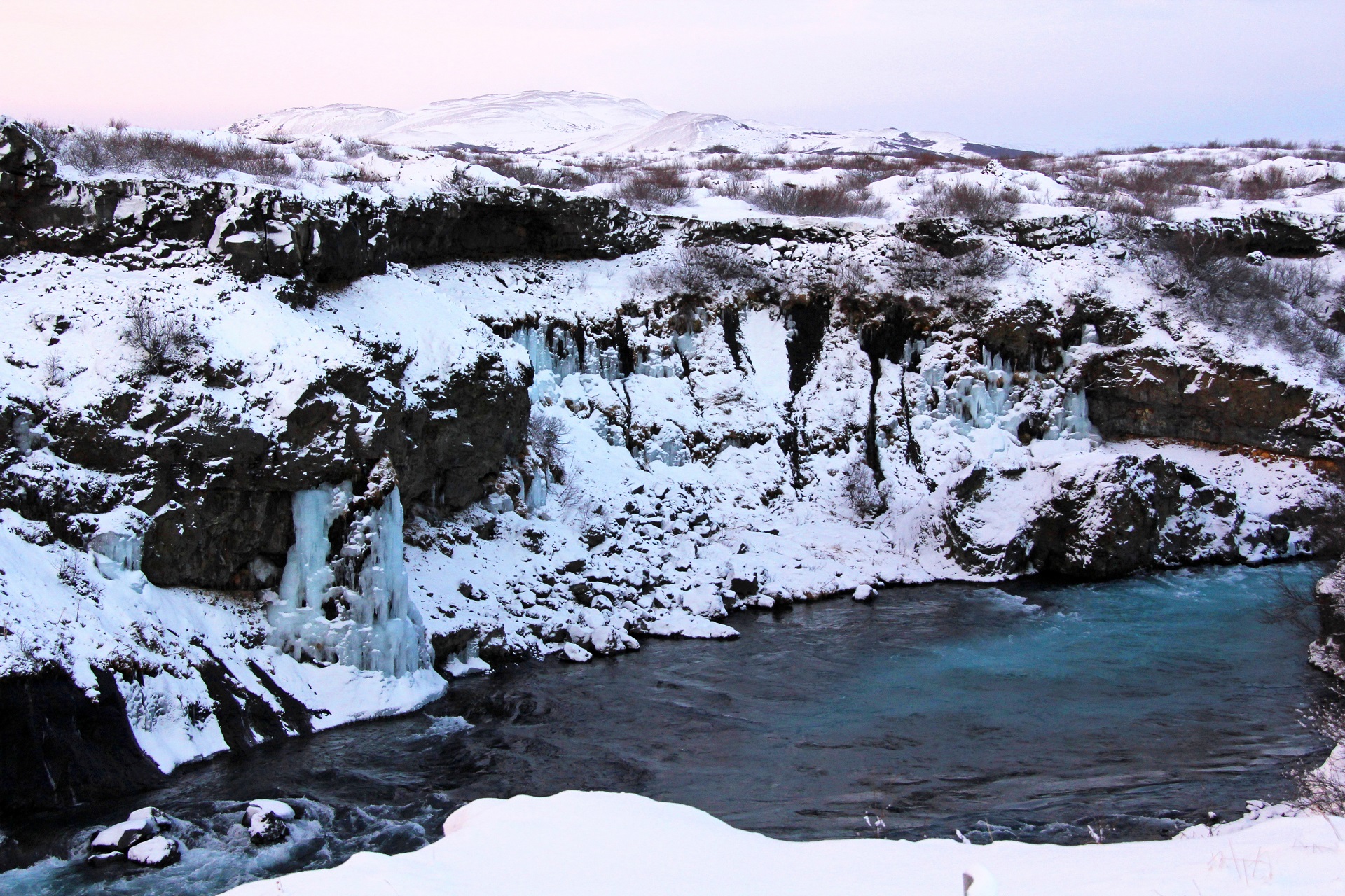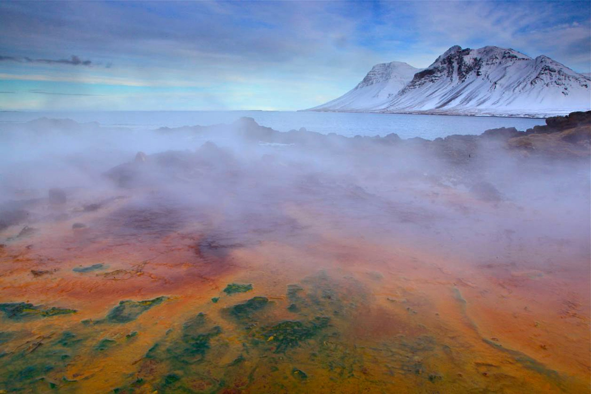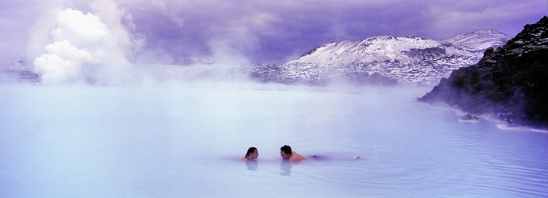 Le lendemain matin, j'ose tout de même enlever mes couches de vêtements. Le vent souffle sur l'hôtel Glymur, la neige tourbillonne et le soleil se lève lentement derrière le fjord des baleines. Il est 10 heures, heure crépusculaire selon les normes islandaises, et donc encore tôt le matin. Avec mon peignoir et mon bonnet en laine, je me faufile jusqu'à la jetée et au hotpot de l'hôtel. Le contact pieds nus avec la neige et la glace ne peut être évité, mais j'oublie très vite cette fraîcheur en m'immergeant en bikini dans l'eau chaude à 37 degrés. Je penche ma tête en arrière et regarde le jeu des couleurs dans le ciel. Le jaune se mélange au bleu et à l'orange. De délicats reflets rouge rosé entre les nuages de coton. Le ciel est mis en scène comme s'il s'agissait d'un décor de film. Ce n'est pas étonnant qu'Hollywood s'est approprié l'Islande pour y tourner des scènes de film: quelques scènes de la série à succès "Game of Thrones" ont été tournées ici dans le nord et le sud de l'île. Il y a encore trop de vent pour partir. J'immerge mes épaules un peu fraîches dans l'eau chaude du hotpot, je mets mes lunettes de soleil et je profite de ma superproduction privée à l'horizon. En Islande, il y a aussi de nombreux bains naturels, par exemple dans le cratère de Víti ou dans un ruisseau à Reykjadalur. Les températures se situent entre 20 et 60 degrés, selon l'endroit. Ainsi, ceux qui veulent profiter d'une source d'eau chaude à un endroit non surveillé, doivent impérativement s'en approcher avec précaution. Certaines sources se trouvent sur les hauts plateaux qui en hiver ne sont pas accessibles. Les bains les plus célèbres, le Blue Lagoon entre Reykjavík et l'aéroport ainsi que le bain naturel Mývatn au nord de l'île, sont ouverts toute l'année. Ils sont par contre très réputés et plusieurs bus s'arrêtent chaque jour tout au long de l'année.