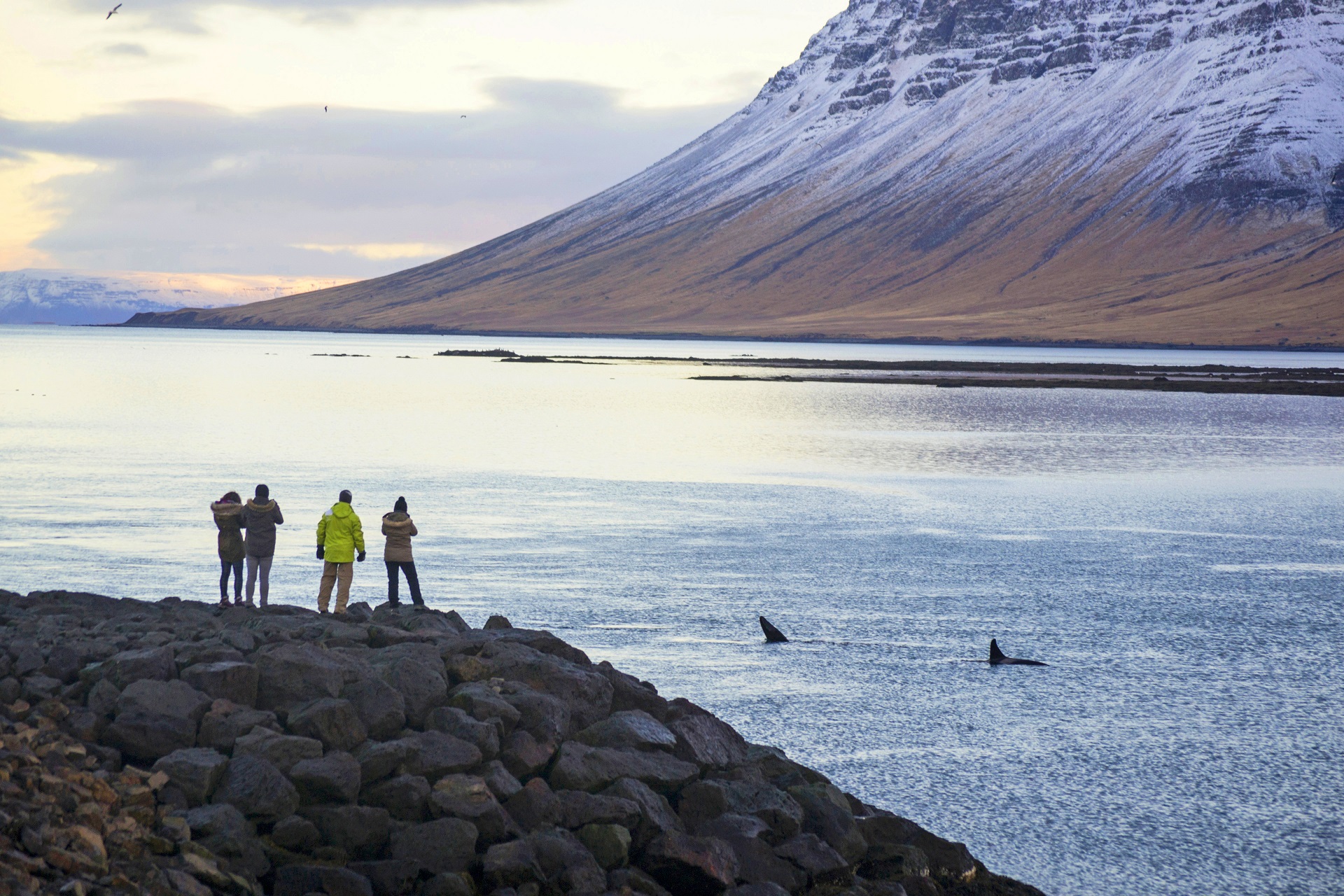 Pendant des heures, les orques nagent à Kolgrafafjörður, tandis que le soleil perçe lentement les nuages et met à nouveau en scène des couleurs magnifiques, orange et rose.