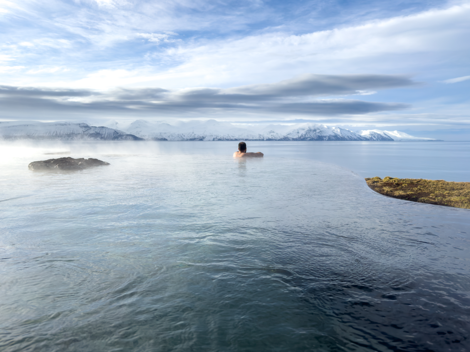 S'allonger dans un bain chaud, alors que l'air est froid et clair, et contempler les paysages hivernaux, c'était quelque chose de spécial pour nous. Et même si nous avions déjà pu admirer des aurores boréales à la fin de l'été : En hiver, avec les montagnes enneigées et le paysage blanc, Lady Aurora semble tout simplement encore plus magique ».
