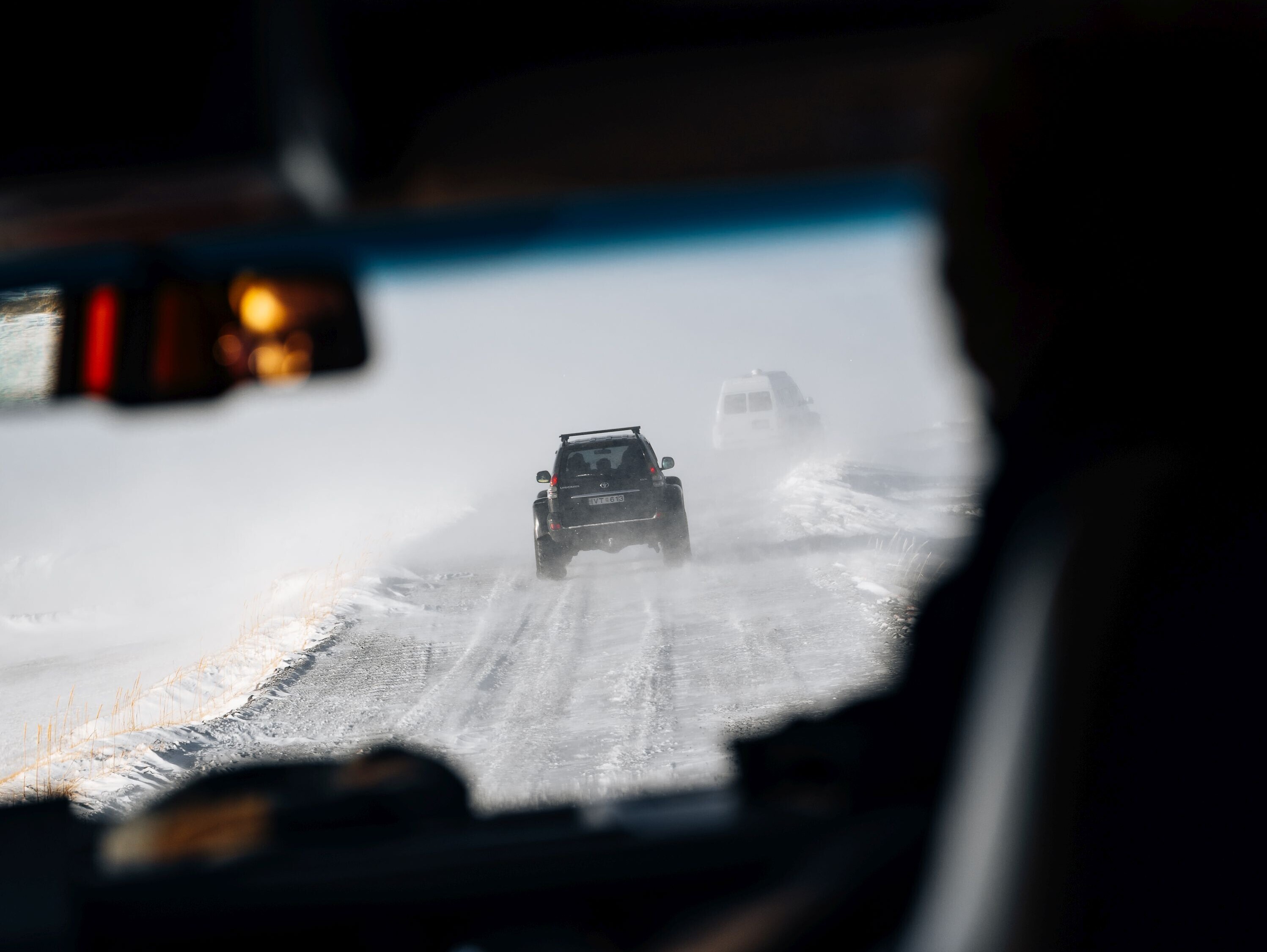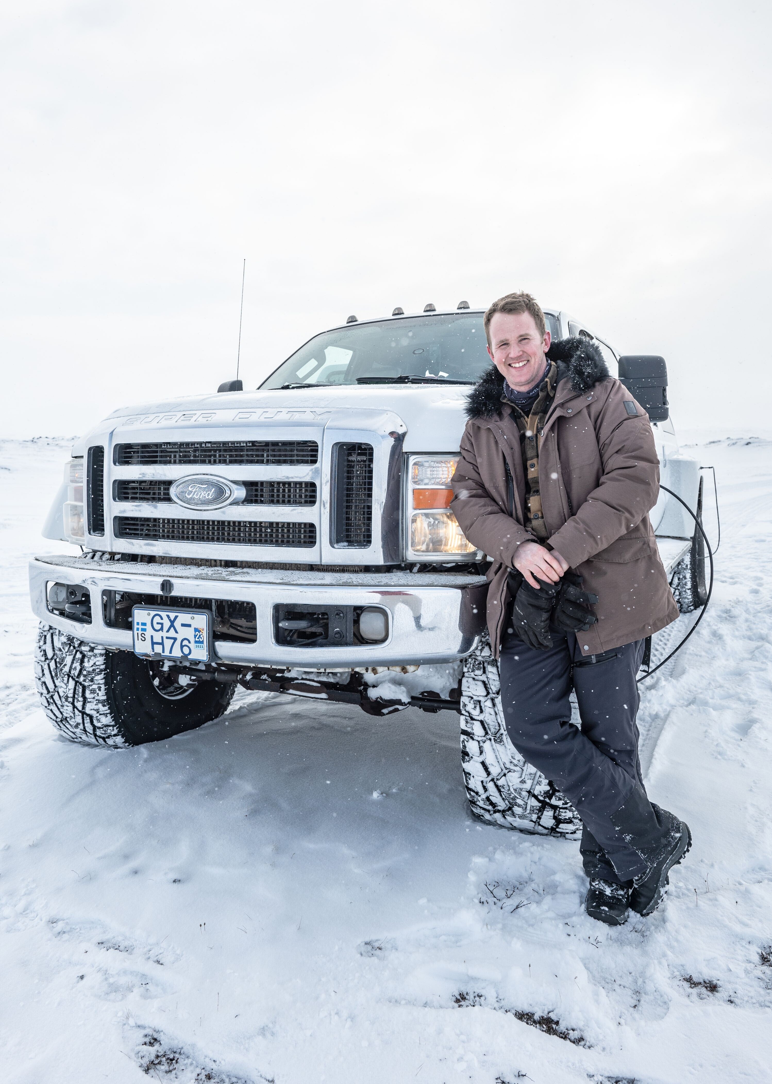 Aujourd'hui, nous sommes accueillis par Birkir et Júlli. L'excursion vers l'imposante chute d'eau Dettifoss commence par un trajet sur la route principale en direction de l'est. Après une demi-heure, nous tournons sur une route secondaire : Nous comprenons alors pourquoi nous sommes en route avec une Super jeep : La route n'est pas déneigée et n'est pas praticable avec une voiture de location. Sur le parking enneigé, nous sommes équipés de raquettes à neige. Nous partons en file indienne - c'est Birkir qui a le plus de mal à avancer dans la neige profonde - mais à en juger par son grand sourire, il s'amuse bien. Au point de vue, nous admirons l'imposante chute d'eau Dettifoss qui, même en hiver, transporte une quantité d'eau considérable par-dessus son bord. Sur le chemin du retour vers la route circulaire, il y a encore de l'action. Deux touristes ont en effet tenté leur chance avec la voiture de location et sont restés bloqués. Júlli et Birkir descendent, discutèrent brièvement et nous décidons de se serrer dans une seule Jeep pour que l'autre puisse sortir la voiture de location de la neige.