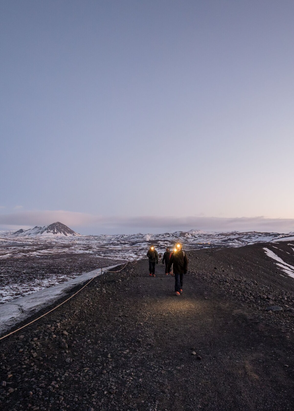 La première excursion commence tôt : à 7h45, Anton Freyr Birgisson vient nous chercher avec un grand sourire et une tasse de café à la main. Nous nous rendons en super-jeep au pied du cratère Hverfjall. Notre objectif : atteindre le bord du cratère avant que les premiers rayons du soleil n'inondent le paysage d'une lumière chaude. Nous avons encore le temps de mettre les crampons - à l'envers pour commencer, en riant - avant d'entamer l'ascension. Au bout de 20 minutes, nous sommes en haut, le froid nous picote la peau, tandis qu'Anton nous captive avec des histoires sur son pays. Et puis le moment est venu : le soleil dépasse le bord et le jour commence - un moment où le temps s'arrête un instant.
