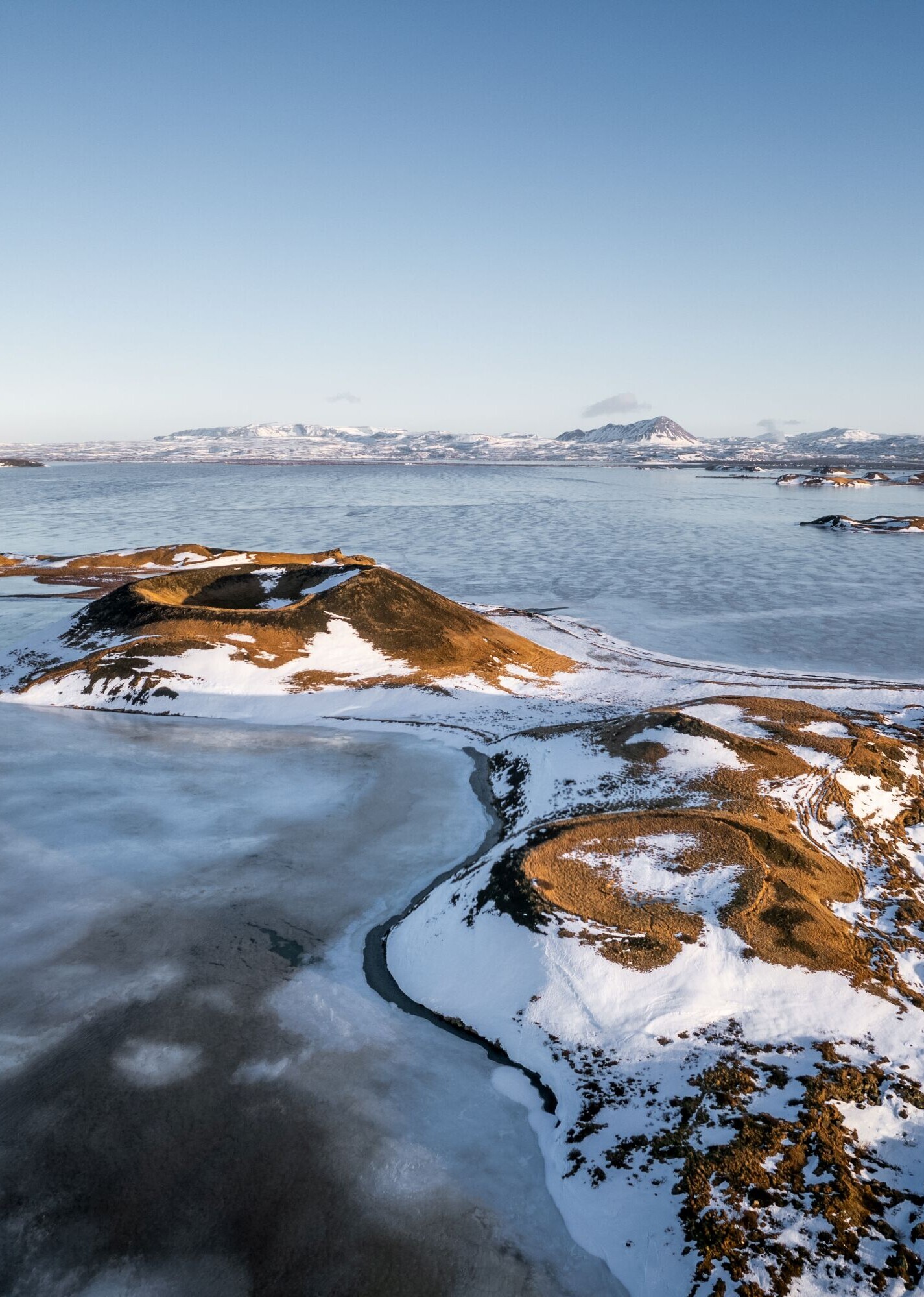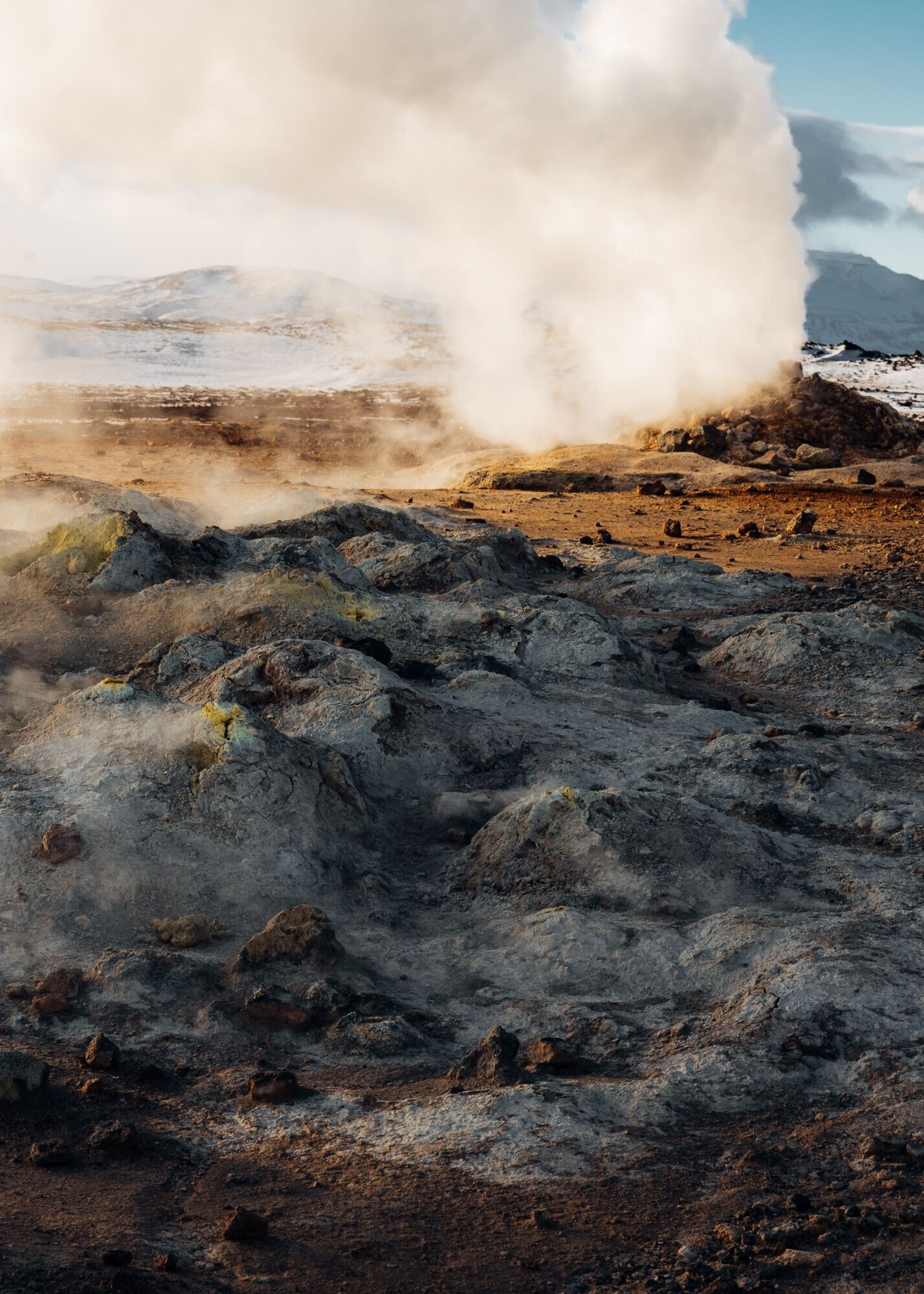 Première destination aujourd'hui : la zone géothermique de Hverir. De loin, nous voyons déjà les nuages de vapeur s'élever du sol vers les hauteurs. Il fait si chaud qu'il n'y a pas de neige. En revanche, tout est boueux - heureusement que nous avons emporté nos chaussures de randonnée. Très vite, nous sentons le soufre et entendons le sifflement et le bouillonnement des marmites de boue et des fumerolles - ce sont de petites ouvertures dans le sol d'où s'échappent les vapeurs. L'odeur est plus agréable sur la péninsule de Höfði. Nous nous promenons tranquillement dans une petite forêt de bouleaux. Plusieurs points de vue permettent d'observer les colonnes de lave du lac. Nous faisons une autre halte aux pseudocraters sur la rive sud du Mývatn. Sur un chemin circulaire, nous admirons une fois de plus le paysage lunaire irréel du nord de l'Islande.