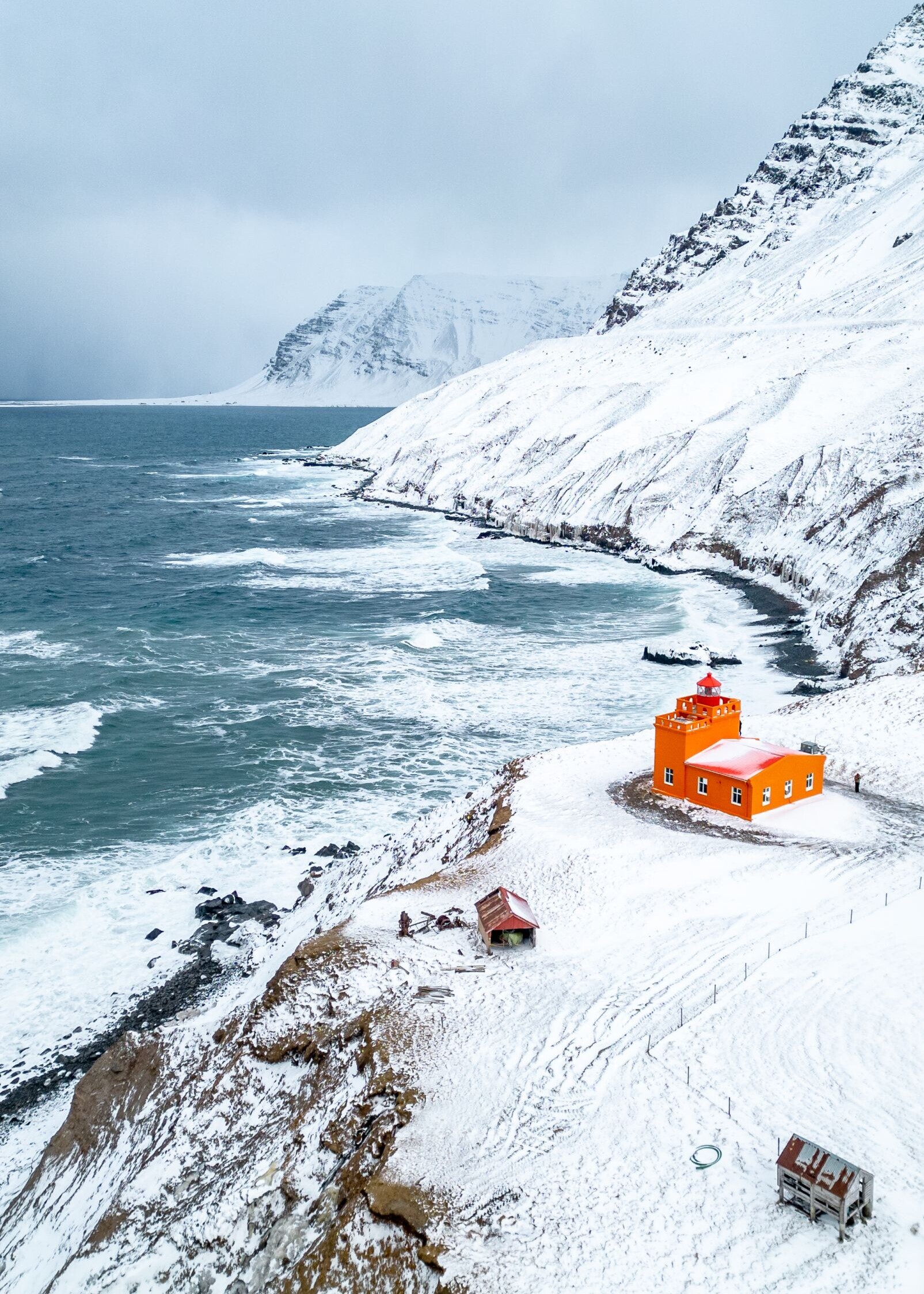 Akureyri se trouve au bout du plus long fjord d'Islande, l'Eyjafjörður. Nous longeons la côte arctique vers le nord jusqu'au village de pêcheurs de Siglufjörður. Le paysage est très différent de celui de Mývatn : des montagnes abruptes et enneigées émergent directement du bleu de la mer. C'est à couper le souffle ! Nous nous arrêtons sur une plage de sable noir, près d'un phare orange et d'un petit pont suspendu. En chemin, nous prenons des forces au petit café “kaffi Klara”.