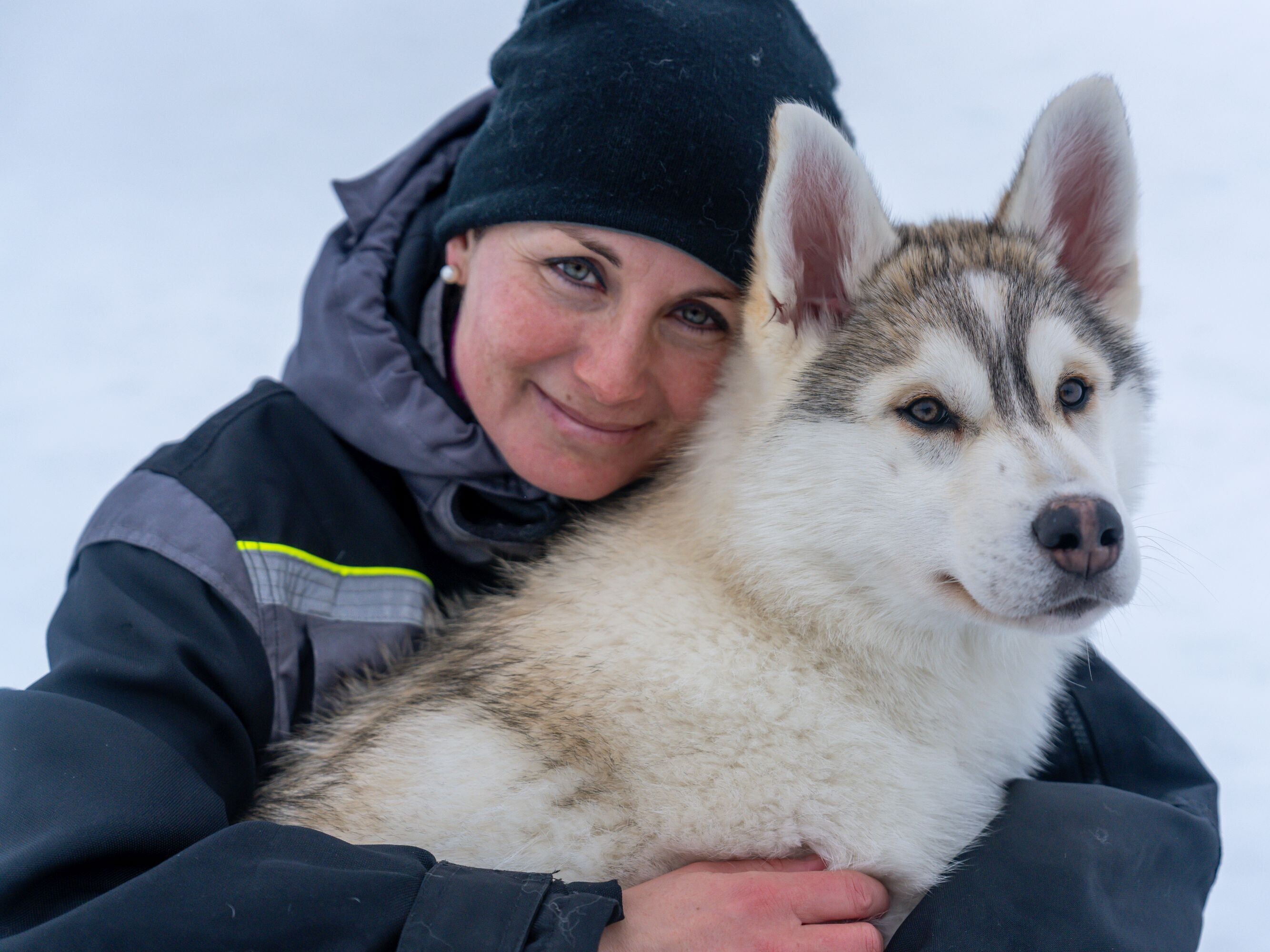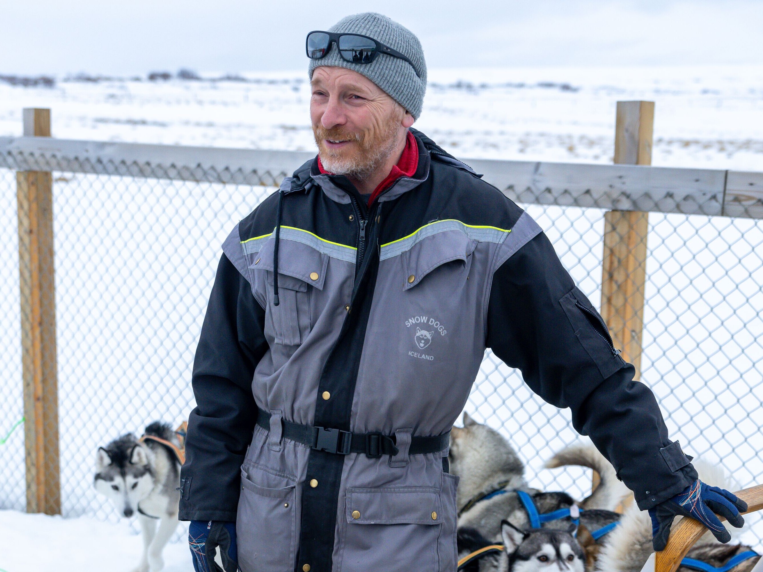 Après le déjeuner, Sæmundur et Bergthóra nous attendent avec leurs 29 huskies sibériens. Pour commencer, nous recevons des combinaisons chaudes qui nous protègent non seulement du froid, mais aussi nos vêtements. Car les chiens sont très affectueux et ne peuvent s'empêcher de se frotter contre nous. La visite commence en effet par un tour de présentation. Nous pouvons les câliner et prendre des photos pendant que les guides nous donnent plus de renseignement sur ce qui caractérise les chiens de traîneau. Ensuite, nous partons à travers la nature sauvage islandaise. Sæmundur et son équipe sont les mushers, nous sommes les passagers. En cours de route, les mushers nous impressionnent par leur savoir-faire sur la région et les paysages.
