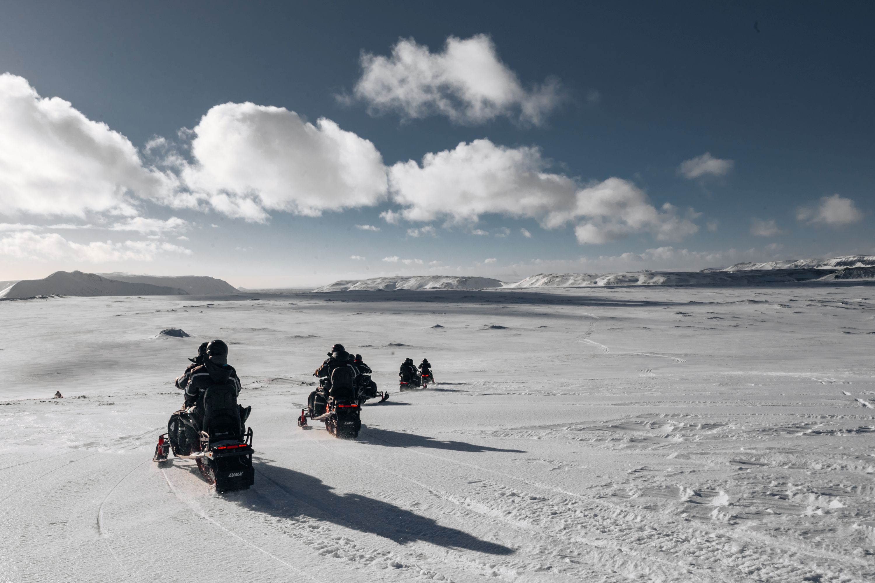 Après la visite, nous nous promenons à travers les formations de lave de Dimmuborgir et reprenons des forces au restaurant de la ferme Vogafjós. Vous pourrez y déguster de la mozzarella faite maison, du pain cuit dans la terre chaude et d'autres spécialités locales. Prochain rendez-vous, nouvelle aventure : nous partons en excursion en motoneige. Comme il y a actuellement un peu moins de neige que d'habitude autour de Mývatn, Anton a rapidement emmené les motoneiges vers la région volcanique de Theistareykir, située plus haut. Nous traversons ainsi un vaste paysage lunaire et avons l'impression d'être les héros d'un film de James Bond !