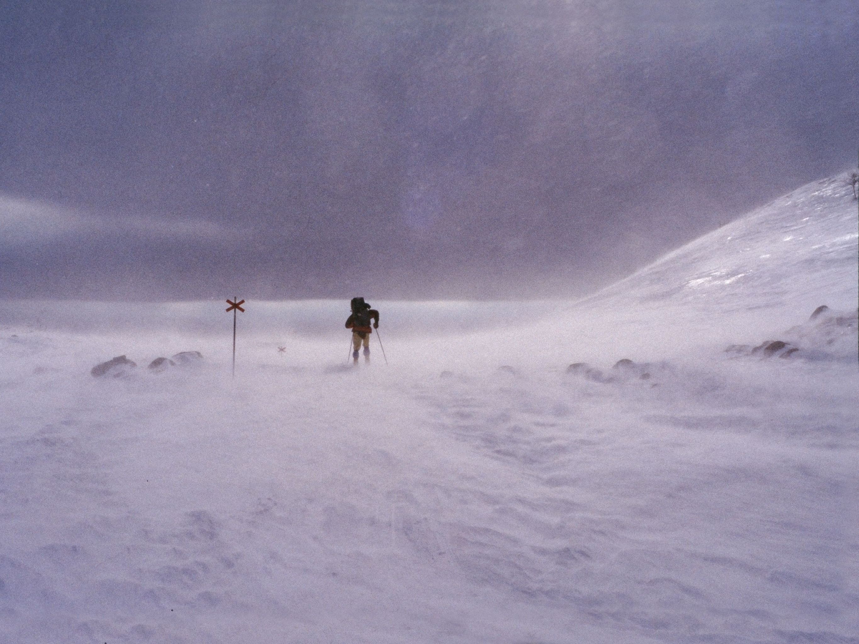 Ils passent la nuit à la station touristique d'Abisko, au milieu des montagnes. Le lendemain matin, ils attachent leurs skis de course étroits. Il n'y a pas de traces. Le vent hurle. La tempête chasse les rafales de neige sur le chemin. Seules les croix rouges en bois indiquent qu'ils sont toujours sur la bonne voie. En cas d'urgence, une tente est dans le sac à dos. Avec leurs skis de fond, ils ont déjà maîtrisé le Gotthard et la Greina, et il y a aussi le Kungsleden.
