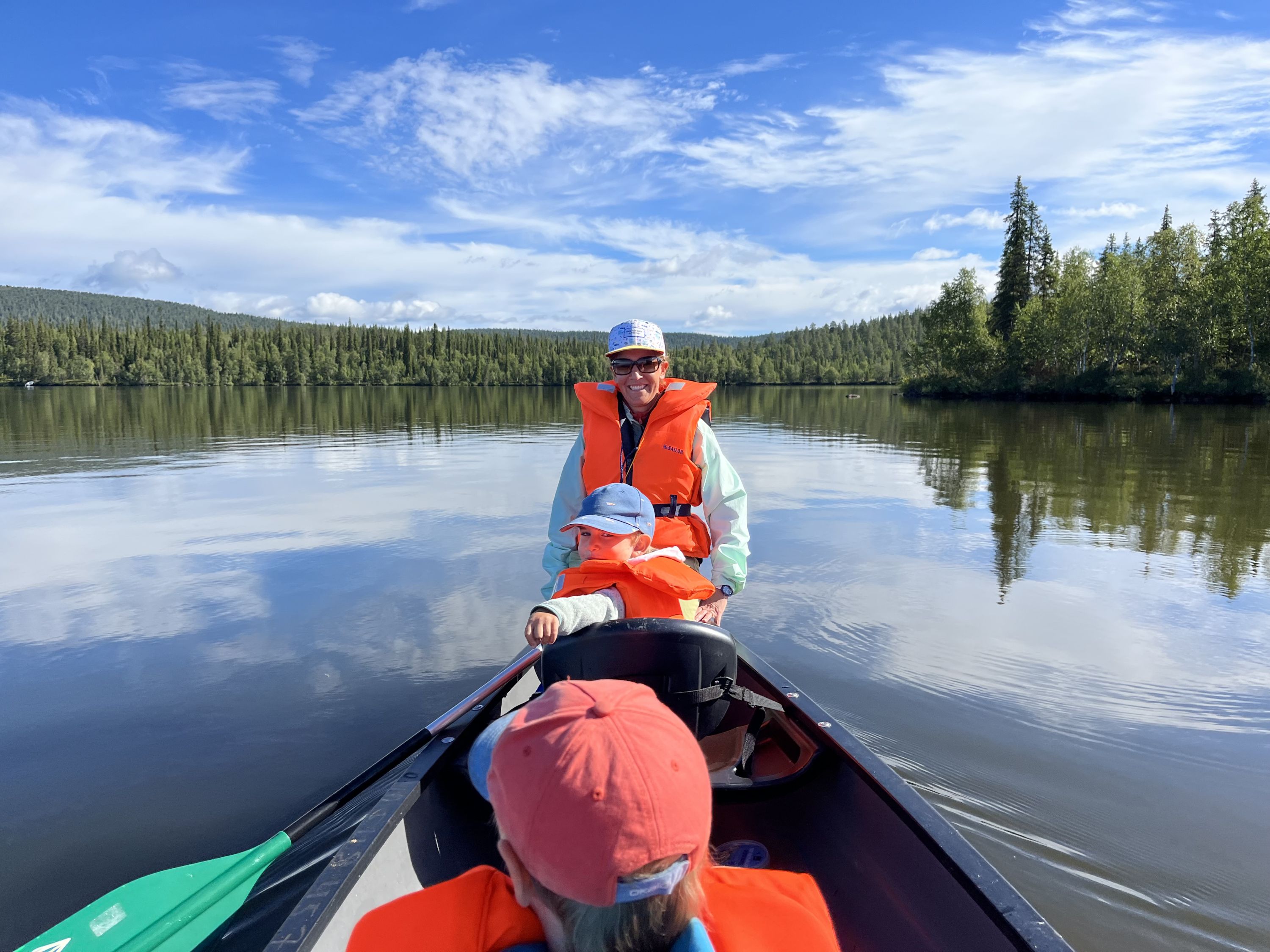 Ils traversent le lac en canoë, dévalent la piste de luge de la station de sports d'hiver de Levi en hurlant, savourent leur goûter sous une petite tente pendant la randonnée ou autour d'un feu dans un kota, guettent les rennes et aperçoivent rapidement l'un des rares animaux blancs. Le soir, ils se couchent, les joues rouges et fatigués, et s'endorment rapidement malgré la luminosité.