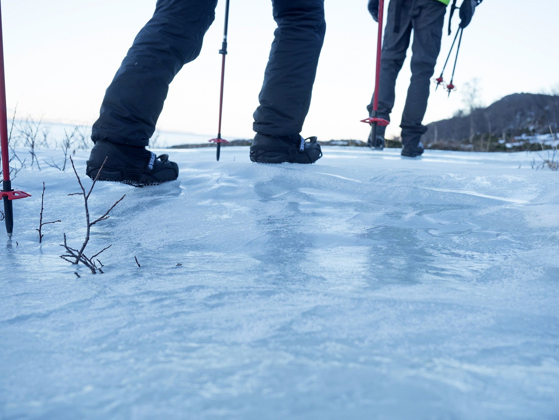 Ça craque, ça se fend. J'ai comme l'impression d'être en équilibre sur des œufs. Puis ça devient un peu plus facile, les pas sur la glace sont plus assurés, plus faciles. Miriam Johansen remet en place une mèche blonde sous son bonnet et nous lance en rigolant: «vous allez vite oublier que vous portez des crampons.» Miriam est une guide-accompagnatrice indépendante. Elle accompagne avec sa belle-sœur Laila Westby notre groupe composé de la photographe Indra Joshi, un groupe d'amis allemands et moi pour cette randonnée vers Lyngstuva, l'endroit le plus au nord de la péninsule lyngéenne, célèbre pour sa vue panoramique. Une excursion en raquettes à neige était normalement prévue mais comme c'est souvent le cas ici au nord de Lenangen au 69e parallèle, la nature en a décidé autrement. Il y a quelques semaines, il a beaucoup plu sur la neige et les températures négatives sont arrivées. La surface a gelé et la randonnée en raquettes s'est tranformée en randonnée avec crampons. Laila reste positive: «La glace est tout aussi belle, croyez-moi.»