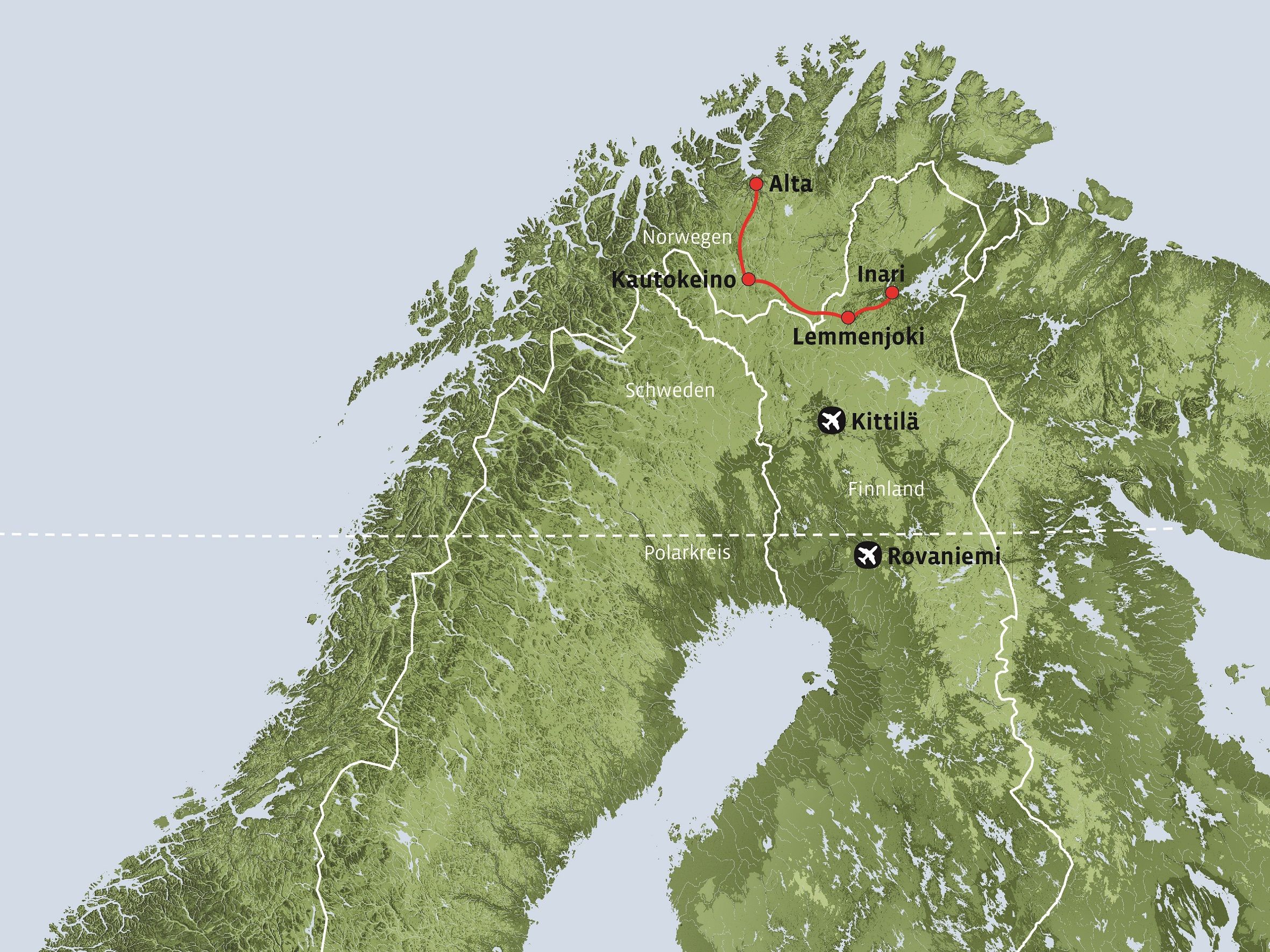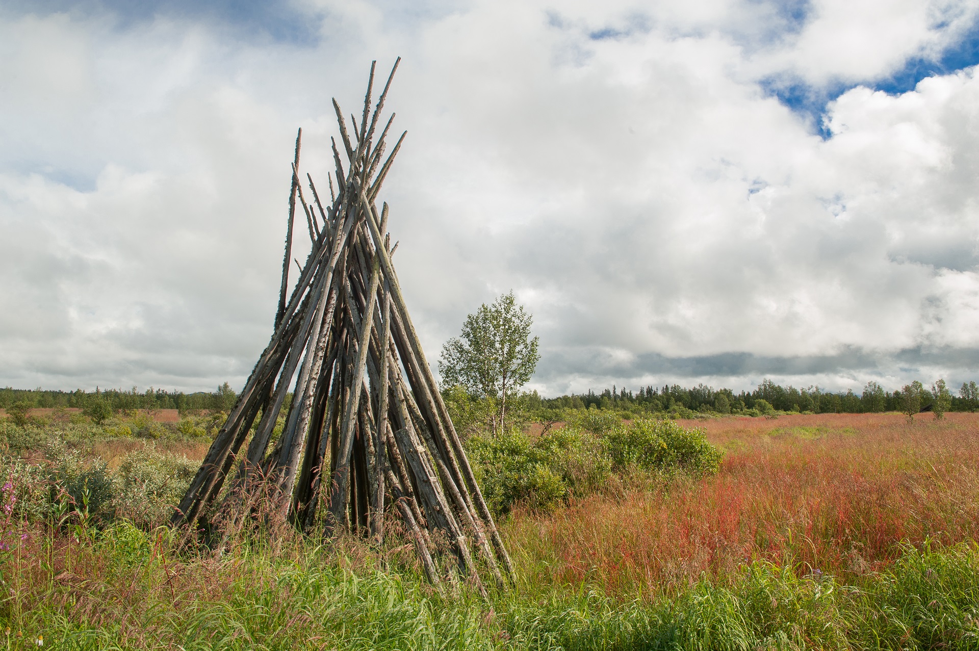 On décide de rejoindre Kautokeino. Peu après Alta, la route serpente à travers des parois rocheuses abruptes, des chutes d'eau et des épilobes roses. Le paysage devient alors plus vaste. La Toundra typique se présente avec des petits bouleaux serrés les uns contre les autres, leurs feuilles vert clair brillent. Aujourd'hui, la météo nous envoie un ciel bleu clair et des nuages blancs qui se reflètent dans les innombrables lacs. Pendant longtemps il n'y avait pas de maisons, presque pas de voitures. Uniquement du vert, bleu et blanc, ainsi que le silence et une tente traditionnelle en bois abandonnée, un Kota. J'imagine comment les Sami - à cette époque encore nomades et chasseurs - ont survécu dans cette solitude et comment ils ont pu vivre simplement de leurs troupeaux de rennes.