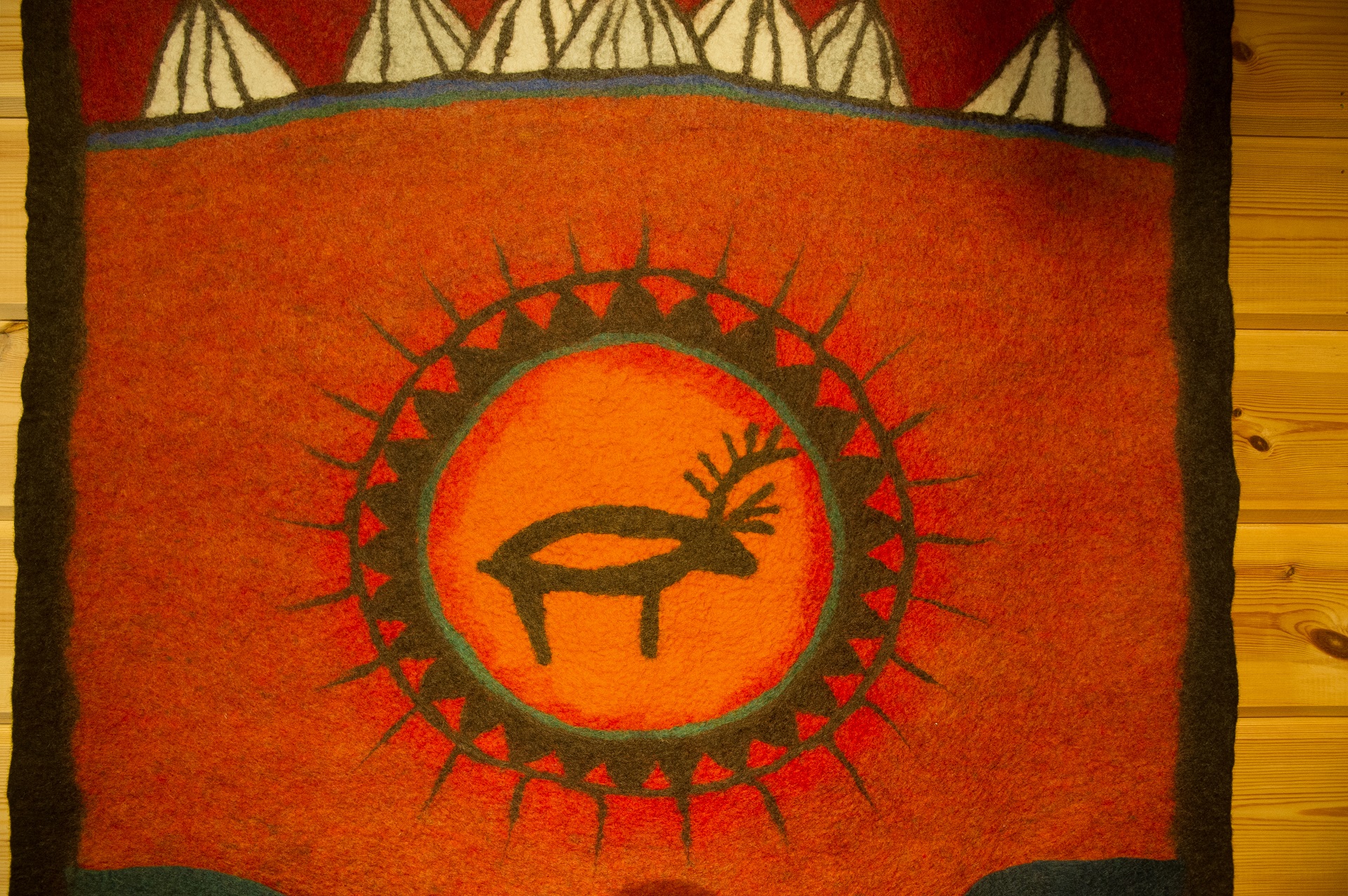 Elle a déjà exposé ses œuvres à Abu Dhabi et dans de nombreux pays européens et a rendu populaire en Finlande la technique de laminage du feutre, originaire de Turquie. Qu'il s'agisse de gilets, de peintures murales, de sacs ou de sacs à dos: les sujets feutrés de Kaija racontent la vie des Sami au rythme des rennes et de la nature, des aurores boréales et des nuits claires, des lacs et des plantes, de l'automne haut en couleurs (Ruska) et de l'hiver blanc dans le vaste désert et le ciel sans fin - pour la cinquième fois je reconnais les motifs des Sami. Ils sont aussi des symboles de la vie de Kaija: La Finlandaise est mariée au Sami Heikki Paltto et a élevé trois enfants avec lui. Heikki, éleveur de rennes et guide, nettoie actuellement de l'or avec des invités. Et il leur montre son renne, sa patrie et sa culture, qui lui est chère et précieuse. Il a grandi sur cette propriété. Enfant, on se moquait de lui parce que sa langue maternelle est le Sami et qu'il ne parlait que quelques mots de finnois quand il a commencé l'école. Ses enfants s'en sont mieux sortis: ils ont suivi des cours de Sami et ont pu vivre leur culture. Pour que cela reste ainsi, Heikki Paltto est le président du Parlement Sami d'Inari. C'est la voix officielle et le groupe de soutien du peuple Sami en Finlande, l'homologue des parlements de Karasjok (Norvège) et Kiruna (Suède).