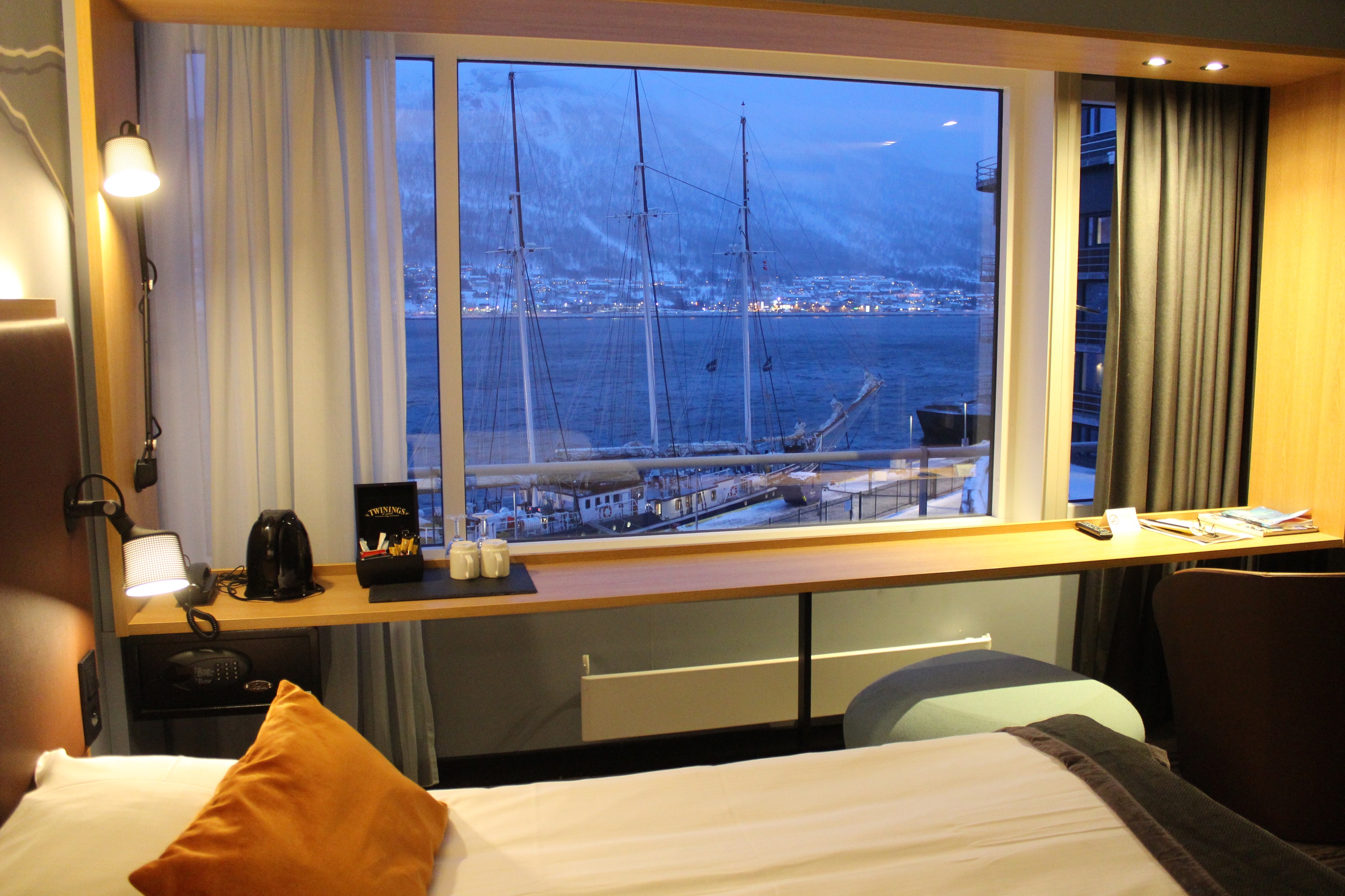 Pendant mon séjour à Tromsø, nous nous sommes offert une chambre supérieure avec une vue magnifique sur le fjord et un navire de guerre norvégien. Les chambres étaient confortablement et élégamment aménagées et il était possible de faire du café ou du thé.