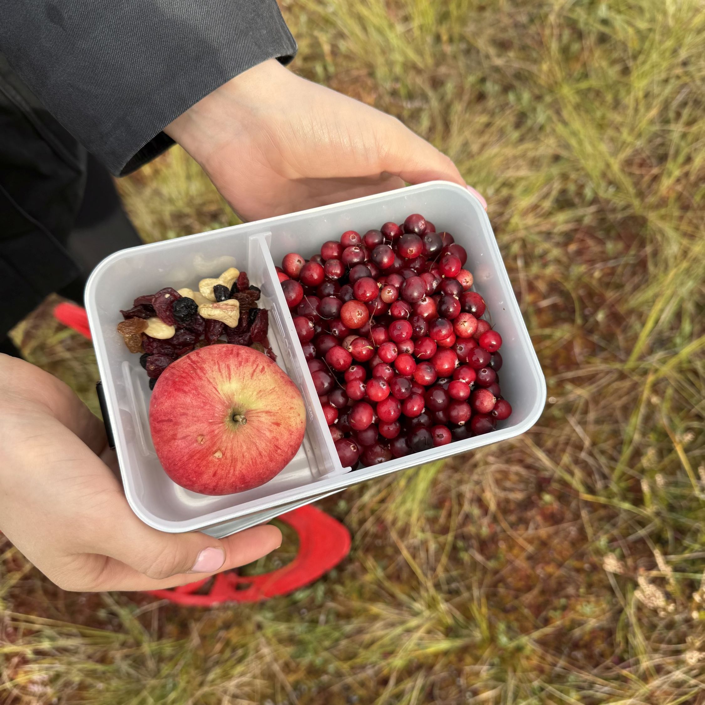 Le lendemain matin, nous commençons tôt. Avant même que le brouillard ne se soit complètement levé sur le paysage, nous marchons dans la tourbière de Meenikunno. Chaussés de chaussures de tourbière, nous marchons ici brièvement comme sur des nuages. Notre guide, Levo Tohva, nous montre comment obtenir de l'eau fraîche directement à partir du sol mou et nous explique que les airelles rouges qui bordent le chemin sont de merveilleuses sources de vitamine C. Nous ne nous le faisons pas dire deux fois et nous nous mettons à la cueillette.