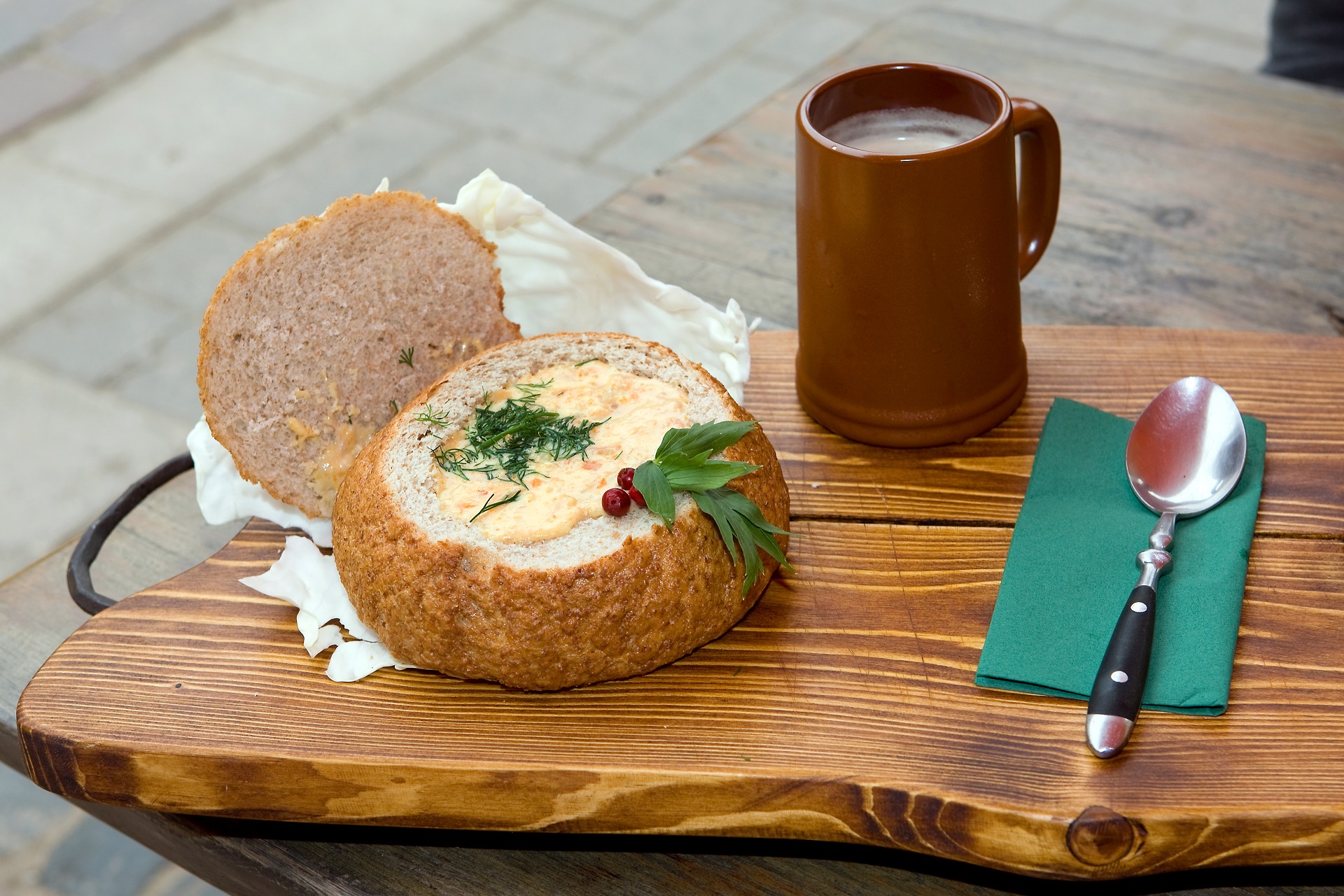 Nous passons devant le Schwedentor (une partie de la fortification de la vieille ville), nous tournons à droite sur la Torna iela et nous nous installons dans la "Taverna". Les bancs et les tables rustiques en bois s'harmonisent parfaitement avec la cuisine lettone traditionnelle. Nous nous servons à la cuillère nos miches de pain remplies d'une soupe riche et nous étudions la carte. C'est encore 300 kilomètres jusqu'à Klaipeda, le port de départ pour l'Isthme de Courlande, notre prochaine destination.
