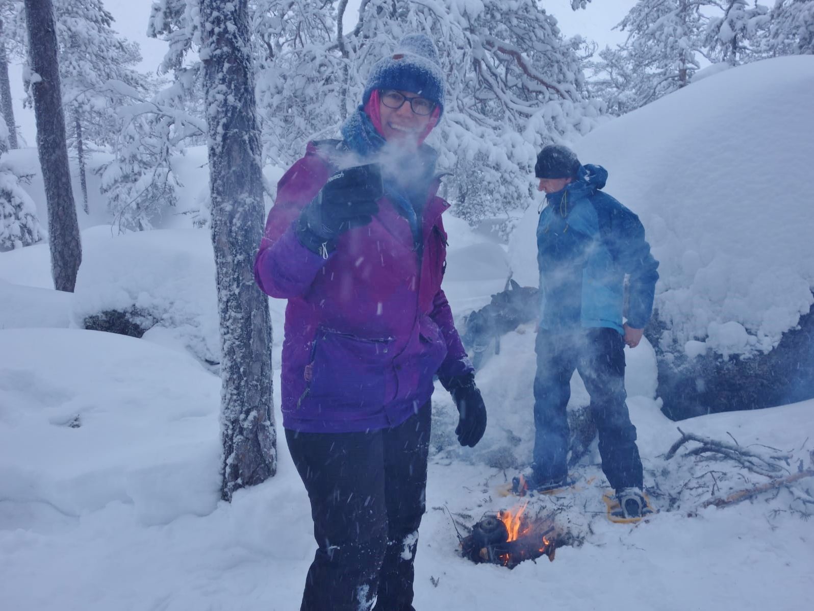 Après un petit tour en raquettes dans la forêt, nous avons essayé d'allumer un feu et de faire bouillir de l'eau avec du bois, des copeaux, du silex et un couteau. Quelle réusite! Nous nous sommes vraiment adaptées à la vie sauvage. En tant que Suissesses bien préparées, nous avions des allumettes, un couteau de poche et du thé chaud dans notre sac à dos. A notre retour, le guide a fait cuire un émincé de viande de renne avec des pommes de terre et des légumes dans le tipi: un repas typiquement lapon.