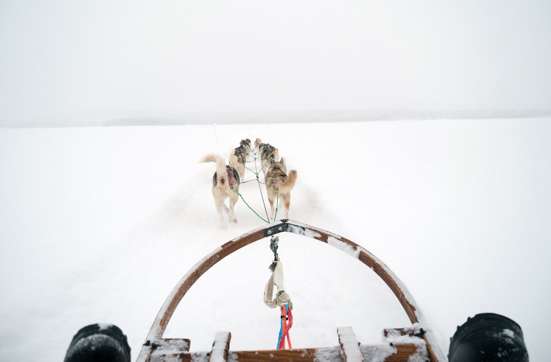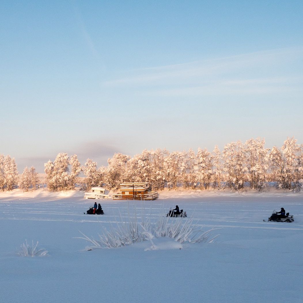 nous préparons des légumes dans la cuisine puis nous cuisons un ragoût de rennes à l'extérieur sur le feu, tandis que de gros flocons tombent du ciel. Roger nous a procuré la viande. Pas étonnant que vous vous sentiez vite comme si vous étiez dans une communauté de conspirateurs. Nous nous asseyons ensemble sur le traîneau à chiens et sifflons silencieusement dans le vide blanc. Au lever du soleil, nous marchons dans la neige épaisse de la montagne d'Aavasaksa où se trouve le chalet d'été du dernier tsar russe et où les sapins enneigés scintillent sous le soleil comme dans un conte de fées. Nous explorons les environs en raquettes à neige, traversons le fleuve gelé, le lac, les bois et l'île. Nous fabriquons notre propre coupe en bois, le kuksa lapon (page 33) chez Mika, un Sami, et l'inaugurons dans le kota avec une liqueur de sapin. Nous finissons la soirée devant la cheminée crépitante du salon sami en nous racontant de nouvelles histoires de héros inspirés du tour en motoneige, un café à la main. De temps en temps, quelqu'un disparaît pour aller au sauna ou dans le hot pot.