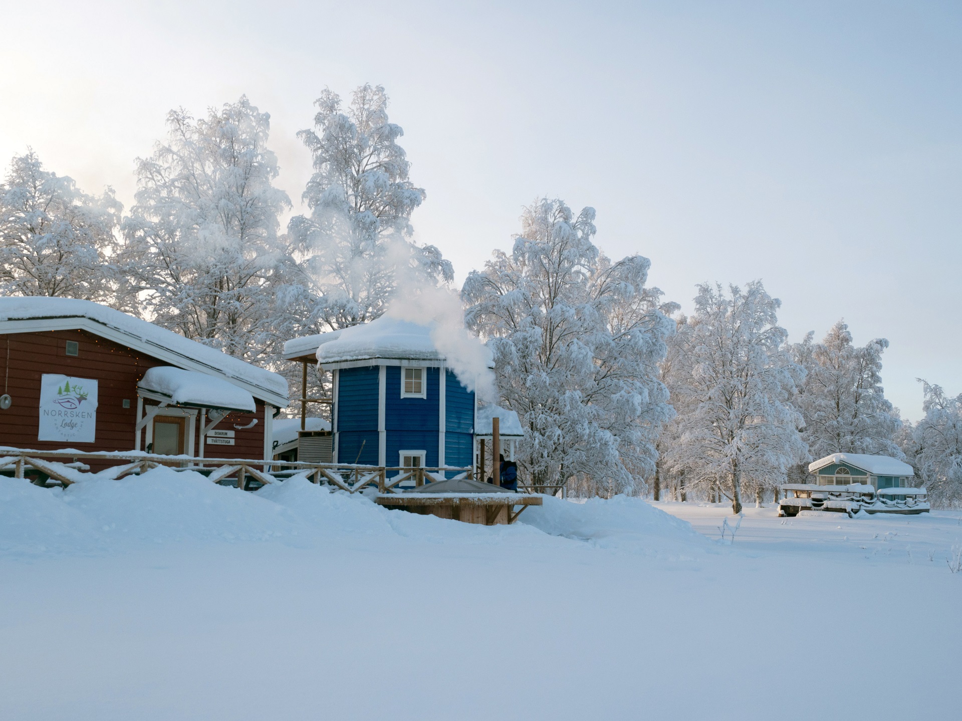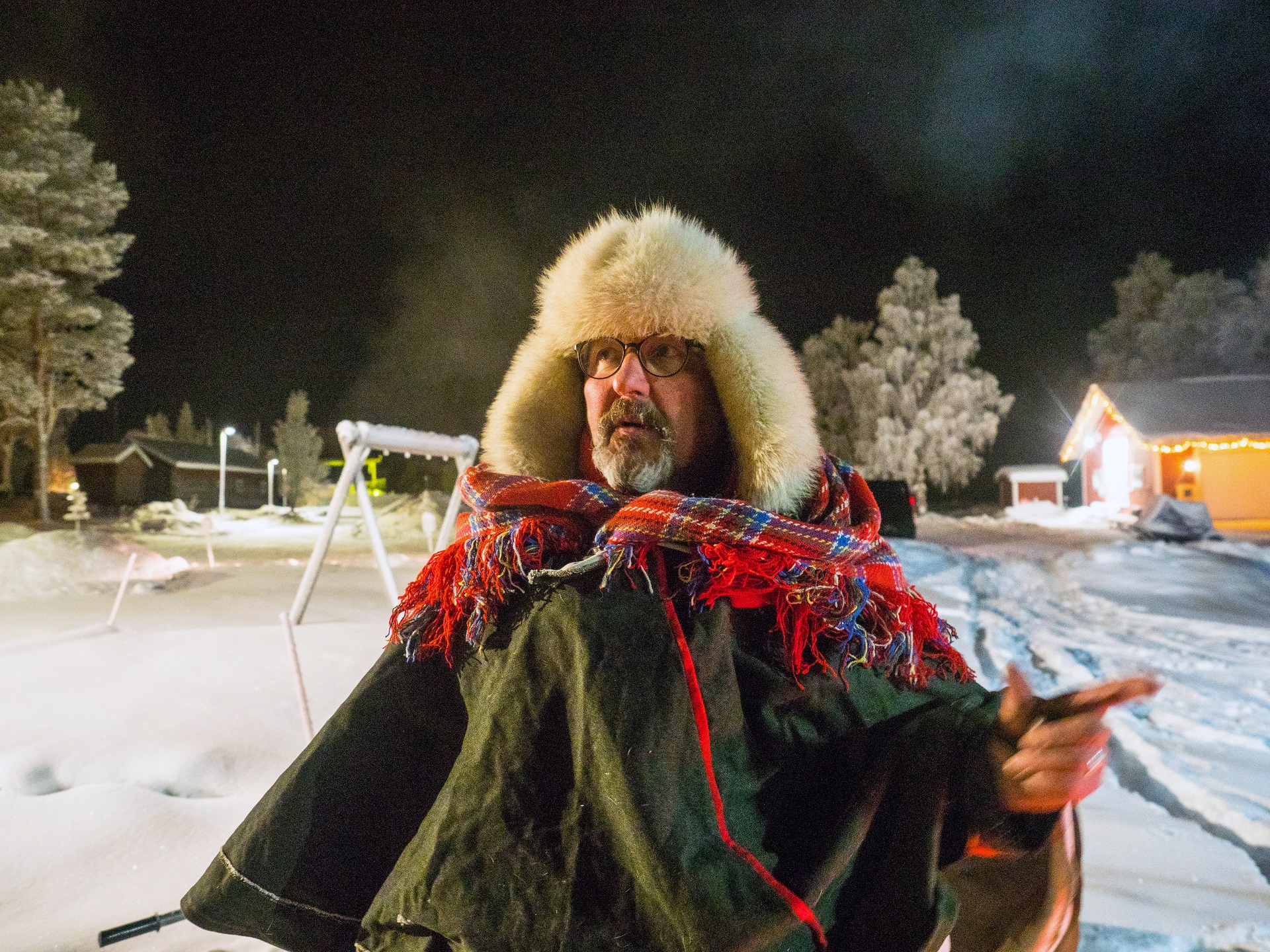 Beaucoup de choses se sont passées depuis cette arrivée. Une immense terrasse a été construite, le salon sami a été rénové, les premiers stugas ont été rénovés. Il y a maintenant un hot pot directement sur le fleuve et un charmant sauna dans la tour. Mäx aime raconter l'histoire de la création du sauna, c'est un symbole de la façon dont Yasmine et lui ont conçu Norrsken Lodge: autrefois, le sauna n'était pas un sauna, mais une tour en bois directement en face de la terrasse, ce qui perturbait la vue imprenable sur le Tornio. Notre ancienne employée, une Japonaise, a soudain dit: " Hé, ça ressemble à la tour dans les histoires finlandaises des Moomin. Tout ce qu'on a à faire, c'est de le peindre en bleu. Et c'est là que j'ai eu l'idée du sauna." Ils ont déplacé la tour derrière le salon sami, l'ont peinte en bleu et ont mandaté Henry, un Sami de la région, spécialiste des saunas et reconnu dans toute l'Europe, d'installer un sauna. Ce soir, Henry est autour du feu avec un Glögg et répond à toutes les questions des visiteurs concernant la construction d'un sauna et les traditions de ses ancêtres. Il montre les animaux en bois sculpté et ses bottes faites à la main, en cuir de renne et en fourrure.